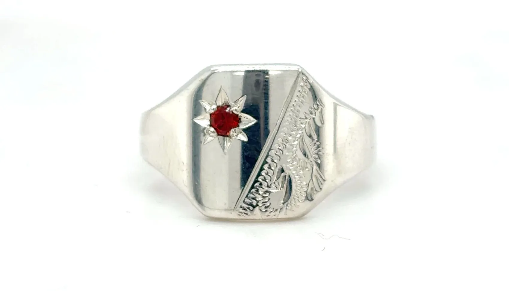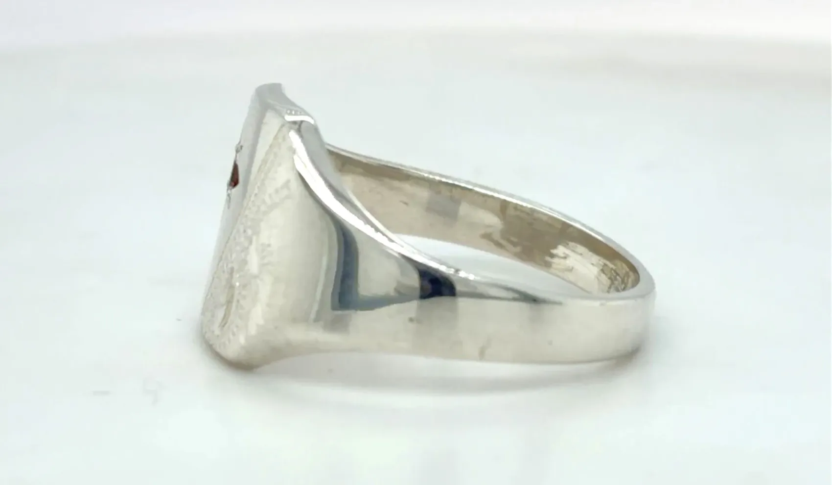 0.05ct Garnet & Silver Signet Ring – 5.0g (13.3mm) Add a touch of classic elegance with this 0.05ct Garnet Signet Ring, crafted in sterling silver. Featuring a deep red garnet set within a sleek 13.3mm signet design, this ring combines sophistication with timeless style. Weighing 5.0 grams, it offers a comfortable fit while making a subtle statement. Perfect as a personal accessory or as a distinctive gift for someone special. Details: