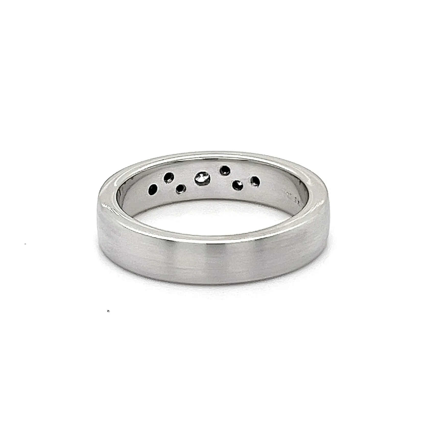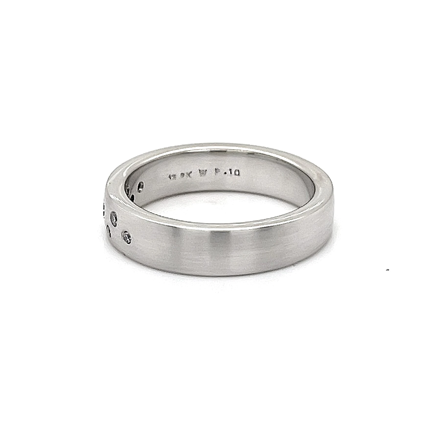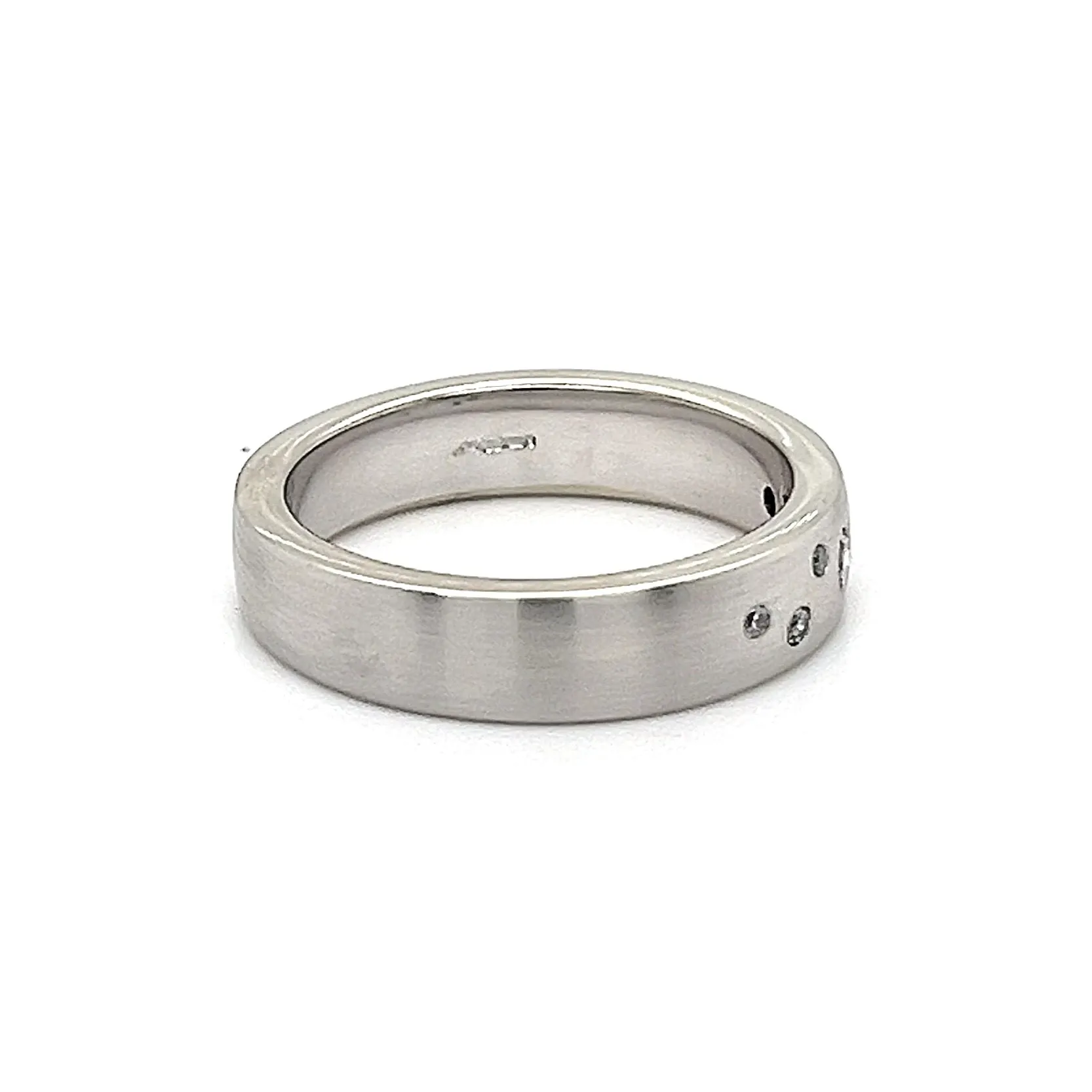 0.10ct Diamond & 9ct White Gold Brushed 5mm Slight Court Wedding Band – 6.3g A sophisticated symbol of love and commitment, this 5mm wedding band combines the elegance of 9ct white gold with the sparkle of 0.10ct brilliant-cut diamonds. The slight court profile ensures a comfortable fit, while the brushed finish adds a modern, textured look, perfect for those seeking understated luxury. Weighing 6.3 grams, this band strikes a balance between presence and wearability. The polished edges subtly enhance the soft glow of the brushed surface, while the carefully set diamonds catch the light beautifully, creating a refined, contemporary wedding band suitable for everyday wear.