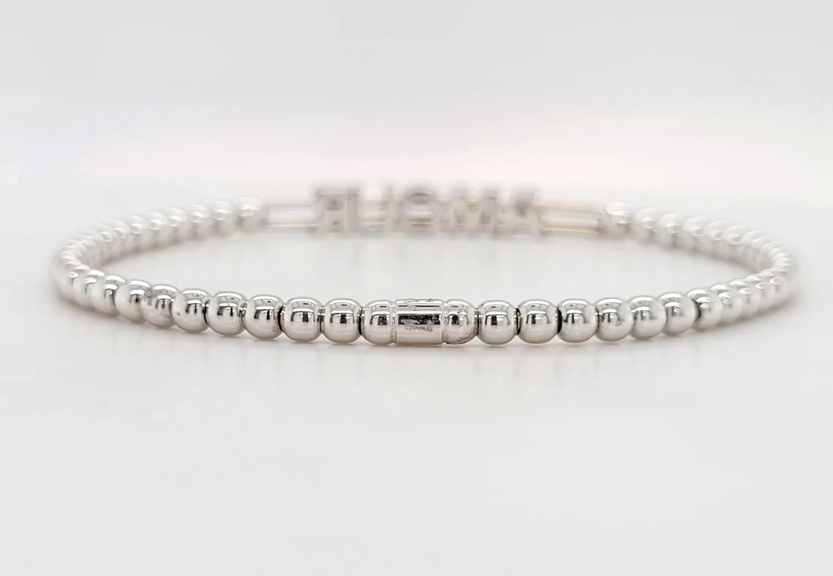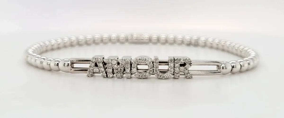 0.23ct Diamond & 18ct White Gold “Amour” Ball Bangle – 7.9g Celebrate the beauty of modern romance with the “Amour” Ball Bangle, meticulously crafted in 18ct white gold and weighing 7.9 grams. This striking piece features a sleek, polished silhouette adorned with spherical ball accents that bring a playful yet sophisticated charm. At its centre, 0.23 carats of brilliant-cut diamonds are delicately set, adding a refined sparkle that elevates the design with understated luxury. The perfect balance of bold form and delicate detail, this bangle is designed to make a subtle statement. Whether gifted as a symbol of love or chosen as a personal indulgence, the Amour Ball Bangle is a timeless expression of elegance and individuality – ideal for stacking or wearing as a standalone treasure.