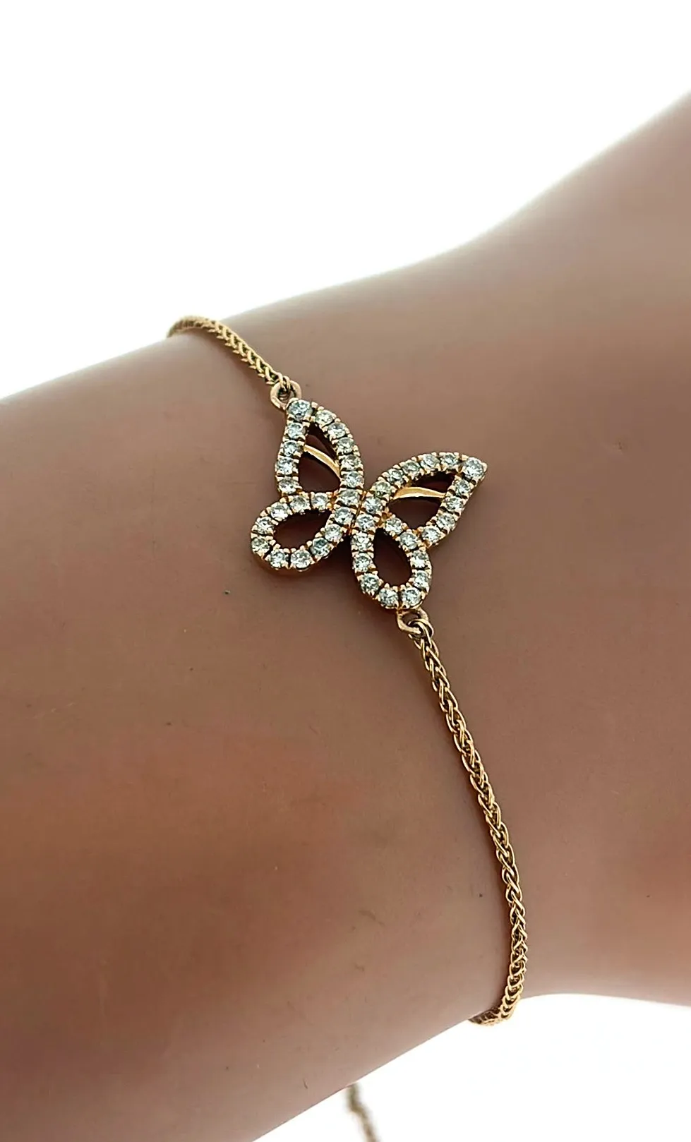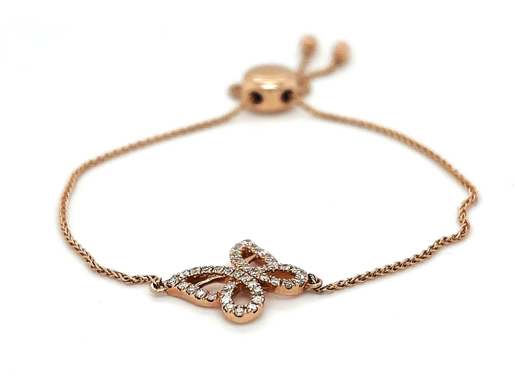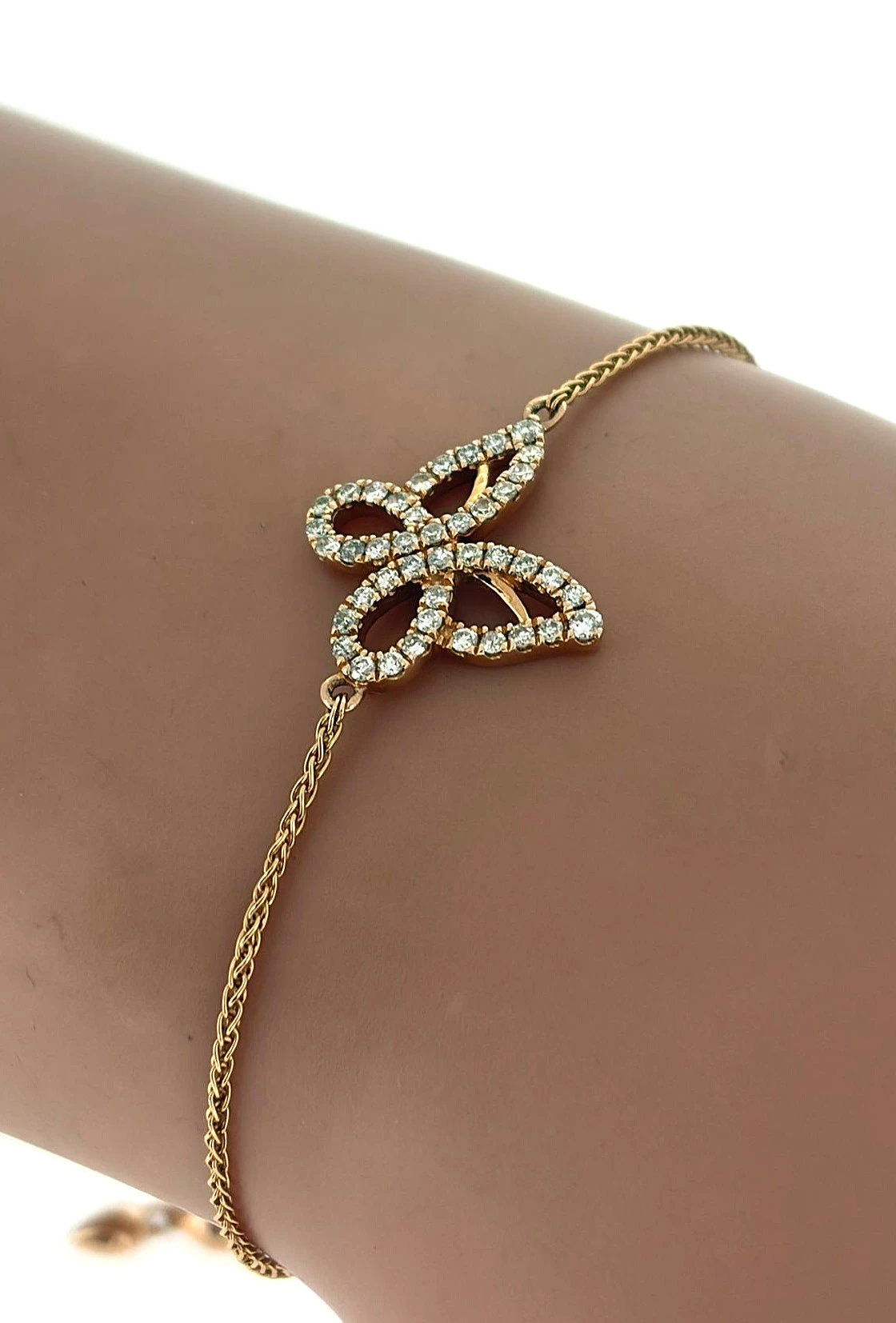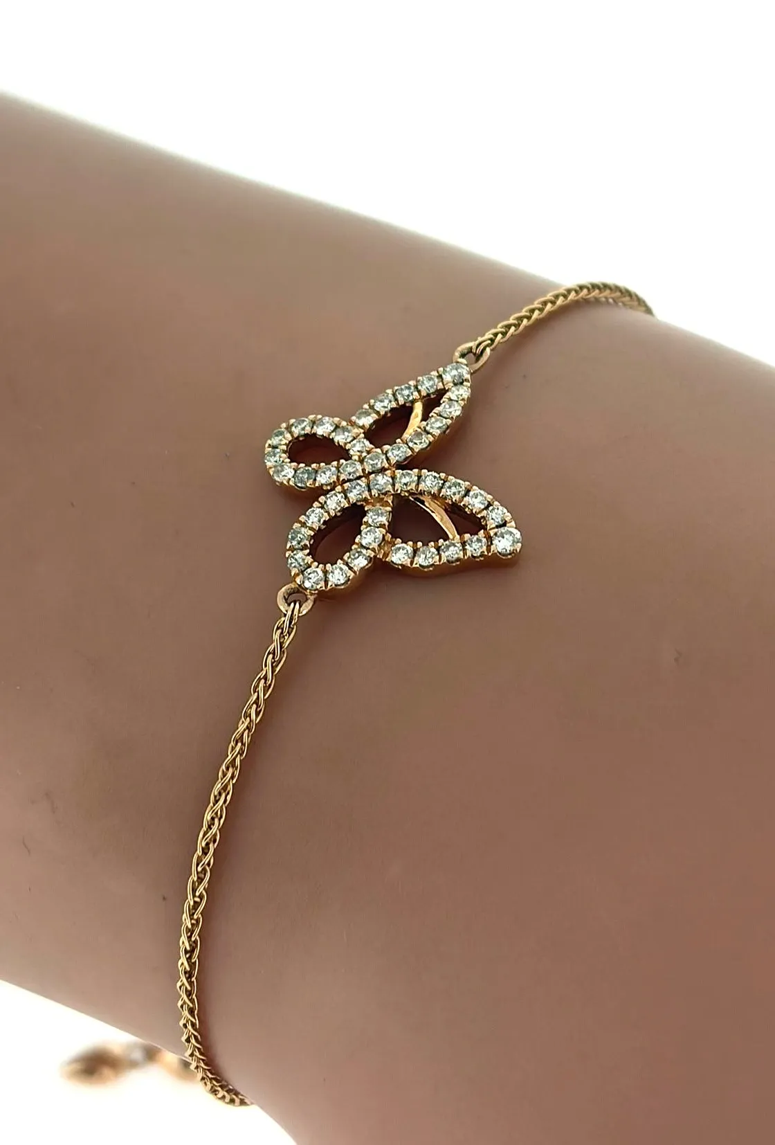 Delicate, feminine, and full of charm, this 14ct rose gold butterfly bracelet is adorned with 0.30ct of sparkling diamonds. Its elegant butterfly motif adds a whimsical touch, while the warm glow of rose gold enhances the brilliance of the diamonds, creating a piece that is both playful and luxurious. Measuring 7.5 inches and weighing 5.8g, the bracelet features a slide clasp for a secure and adjustable fit, ensuring comfort for everyday wear or special occasions. The polished finish and meticulous craftsmanship make this bracelet a timeless accessory or a thoughtful gift. Details:
