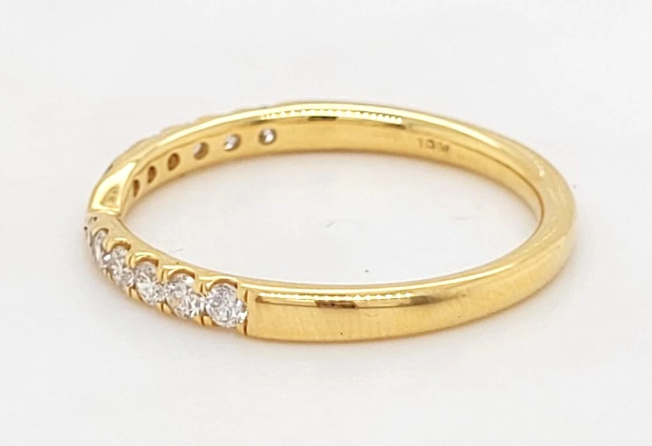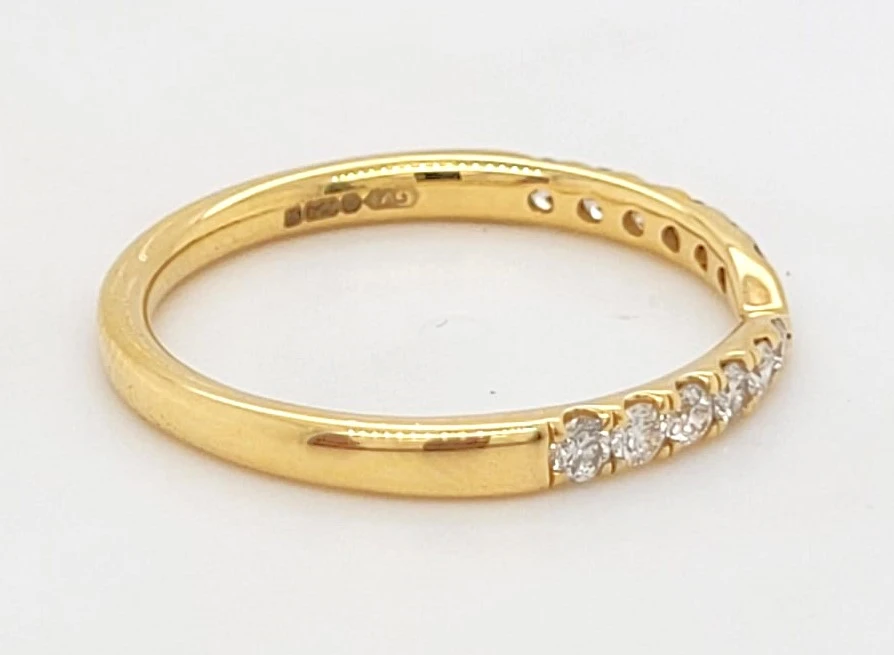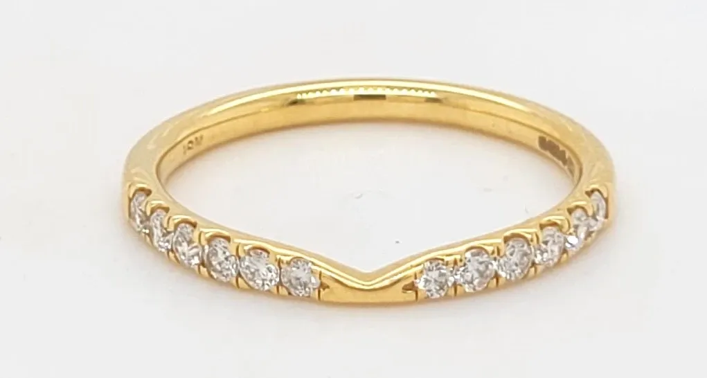 0.30ct Diamond & 18ct Gold Shape-to-Fit Wedding/Eternity Band – 2.0g Designed with both elegance and practicality in mind, this 0.30ct diamond shape-to-fit wedding or eternity band is expertly crafted in luxurious 18ct gold. Weighing a comfortable 2.0 grams, this beautifully contoured band is shaped to sit flush against engagement rings with unique or raised settings. Set with 0.30 carats of brilliant-cut diamonds, the band delivers a continuous sparkle that complements its graceful curve. The diamonds are carefully positioned to follow the contour of the ring, enhancing both its beauty and versatility. Ideal as a wedding band, eternity ring, or anniversary gift, this piece adds an elegant finishing touch to any bridal set while offering a secure and comfortable fit for everyday wear. Specifications: