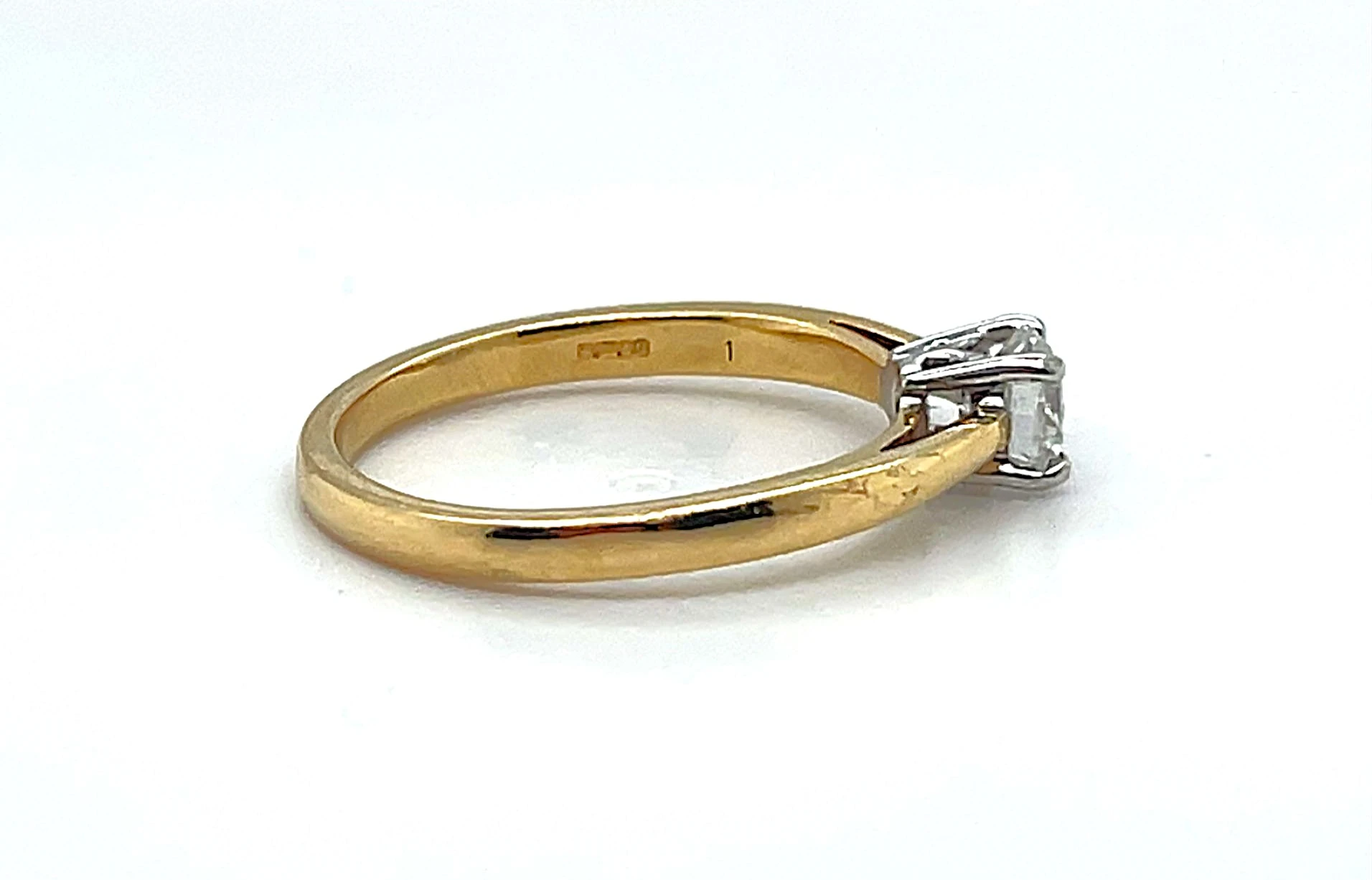 0.35ct Diamond Solitaire Ring – 18ct Yellow & White Gold – 3.9g Exude elegance with this 0.35ct diamond solitaire ring crafted in 18ct yellow and white gold. Weighing 3.9g, this lightweight ring offers a perfect balance of style and comfort, making it ideal for everyday wear or special occasions. The brilliant-cut diamond takes centre stage, beautifully complemented by the two-tone gold setting. The combination of warm yellow gold and lustrous white gold creates a timeless, sophisticated look, while the classic solitaire design ensures the diamond remains the focal point. A versatile, unisex piece, this ring is perfect for anyone seeking a refined and enduring symbol of love and style. Features: