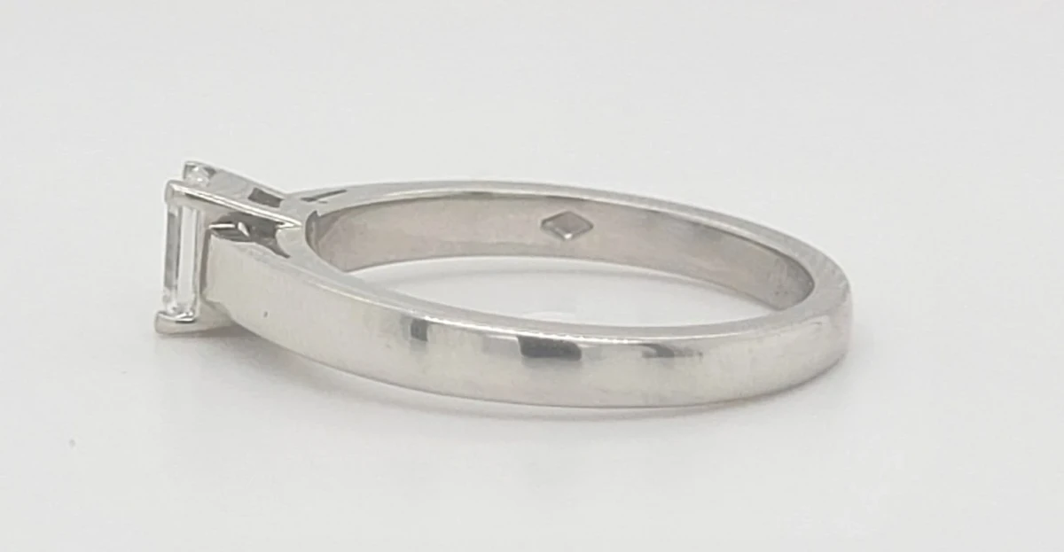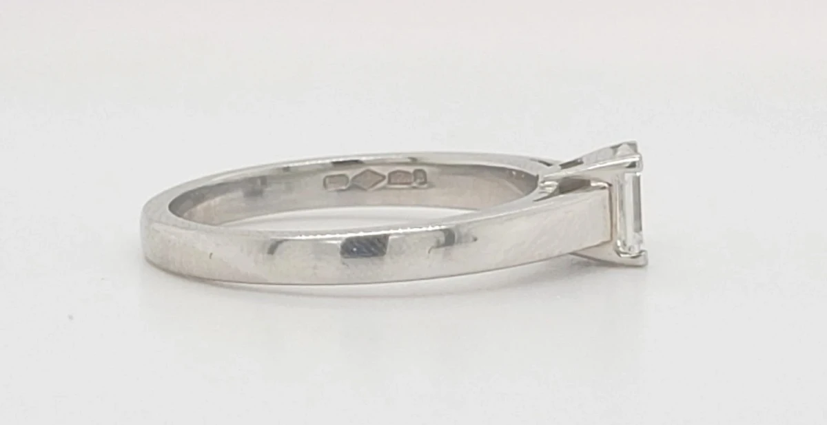 Weighing 5.0 grams and sized to a UK L½, this classic piece features a single, dazzling diamond set in a secure and graceful setting that allows maximum light to enhance its brilliance.