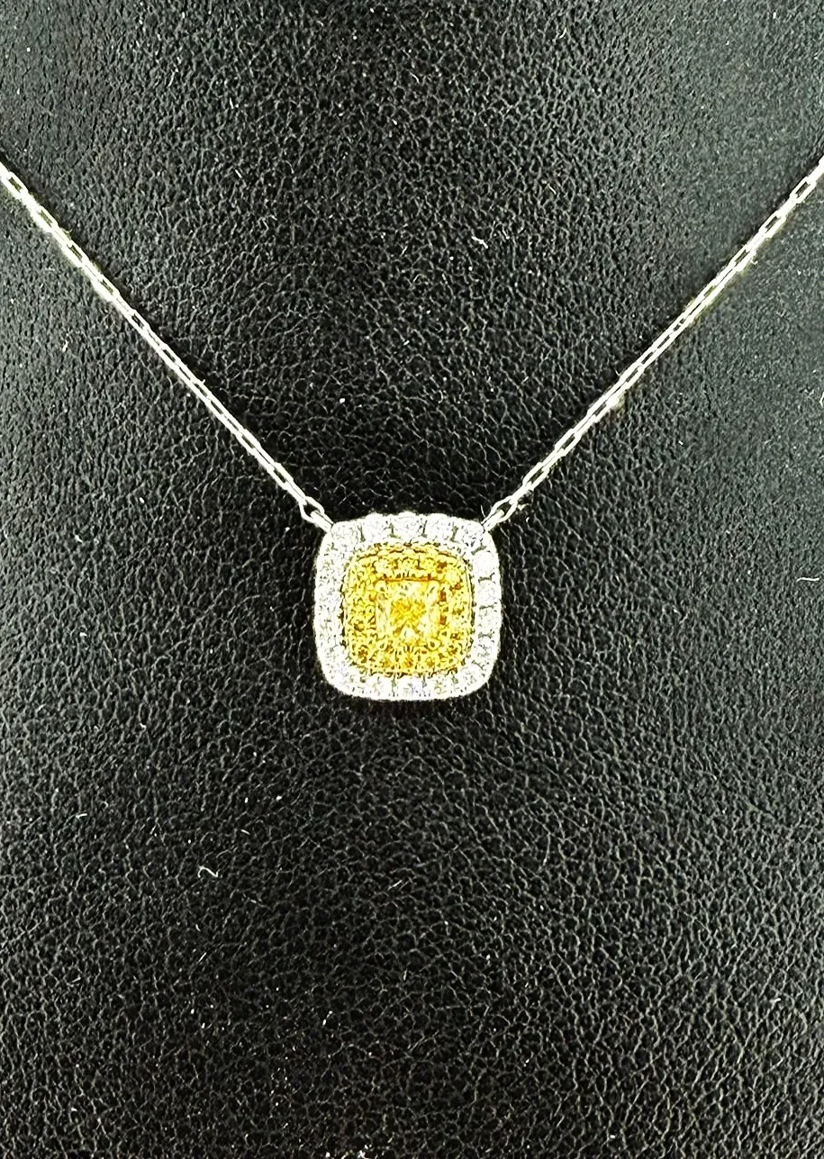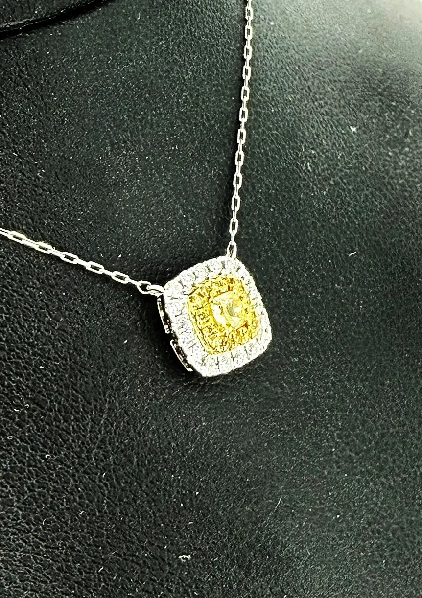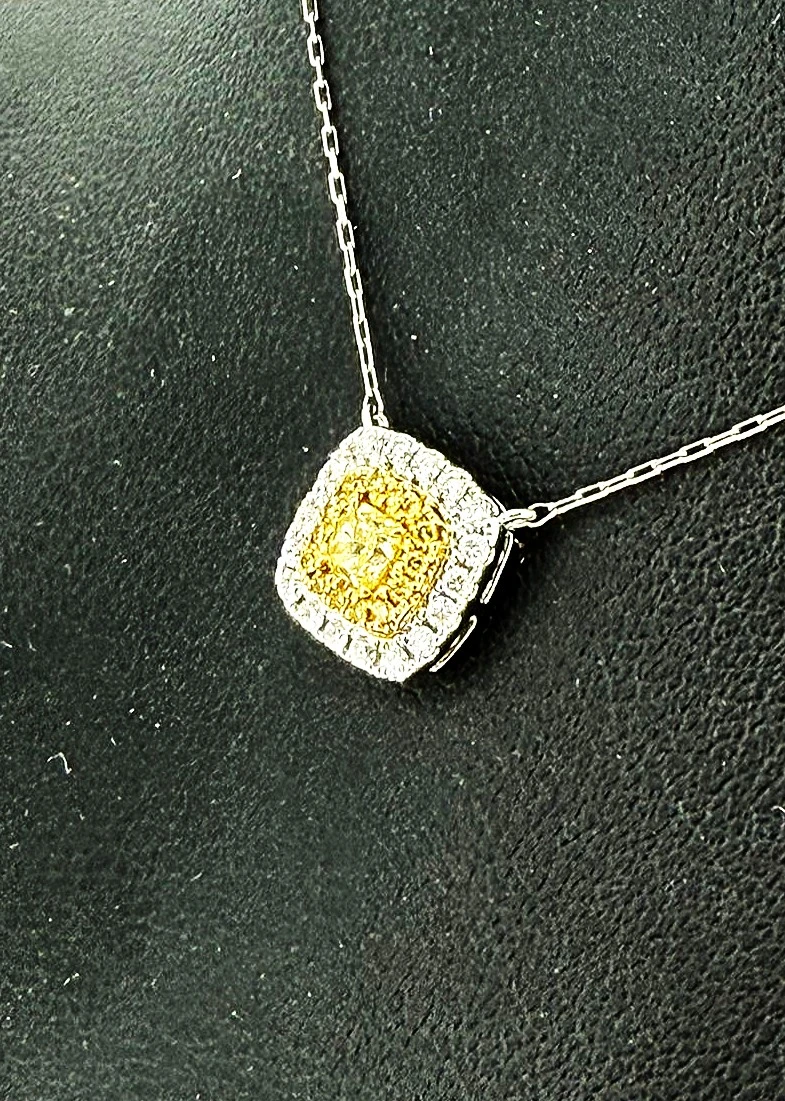 Add a touch of vibrant elegance with this 0.40ct yellow and white diamond pendant, set in luxurious 18ct white gold. Featuring a harmonious combination of yellow and white diamonds, this pendant sparkles with a unique, eye-catching brilliance. Suspended from a 16-inch white gold chain and weighing 1.8g, it offers lightweight comfort while showcasing timeless sophistication. Perfect for both everyday wear and special occasions, this pendant is a striking addition to any fine jewellery collection, blending classic design with contemporary sparkle.