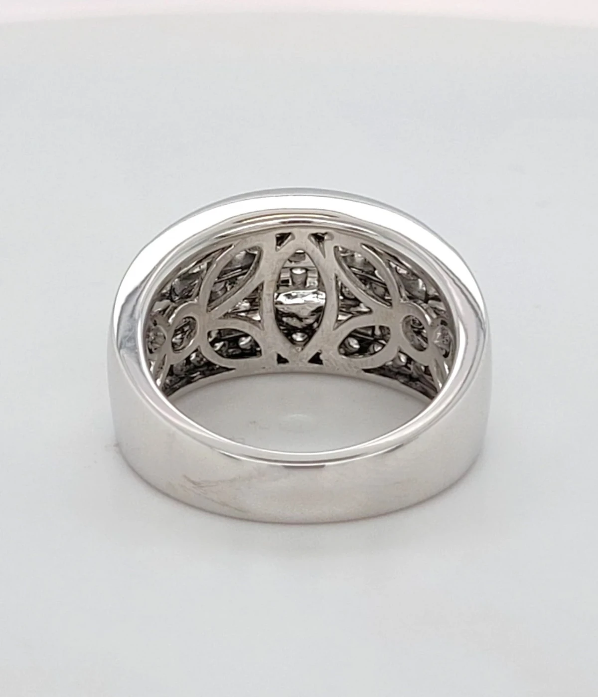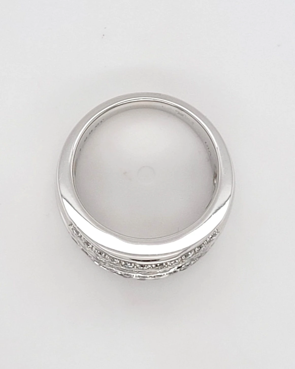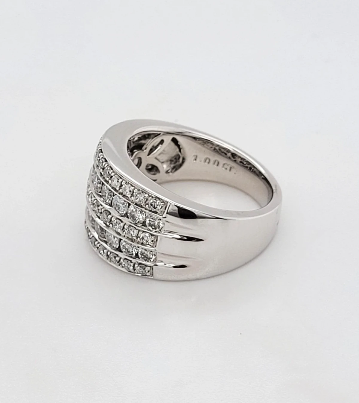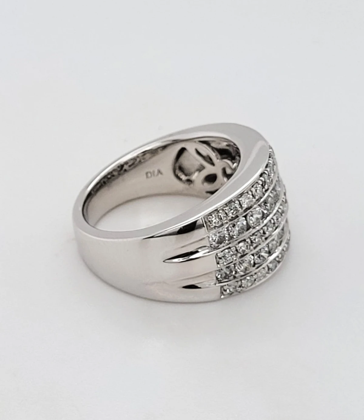 1.00ct Diamond & 18ct White Gold 5-Row Dress Ring – 8.2g Bold and breathtaking, this 1.00ct diamond dress ring is a true statement of luxury. Crafted in 18ct white gold and weighing 8.2 grams, it features five dazzling rows of brilliant-cut diamonds, meticulously set to create maximum sparkle and sophisticated presence. Perfect for special occasions or as a standout everyday piece, the wide-band design delivers both impact and elegance. This ring is a celebration of craftsmanship and glamour — ideal for those who love refined jewellery with a bold edge.