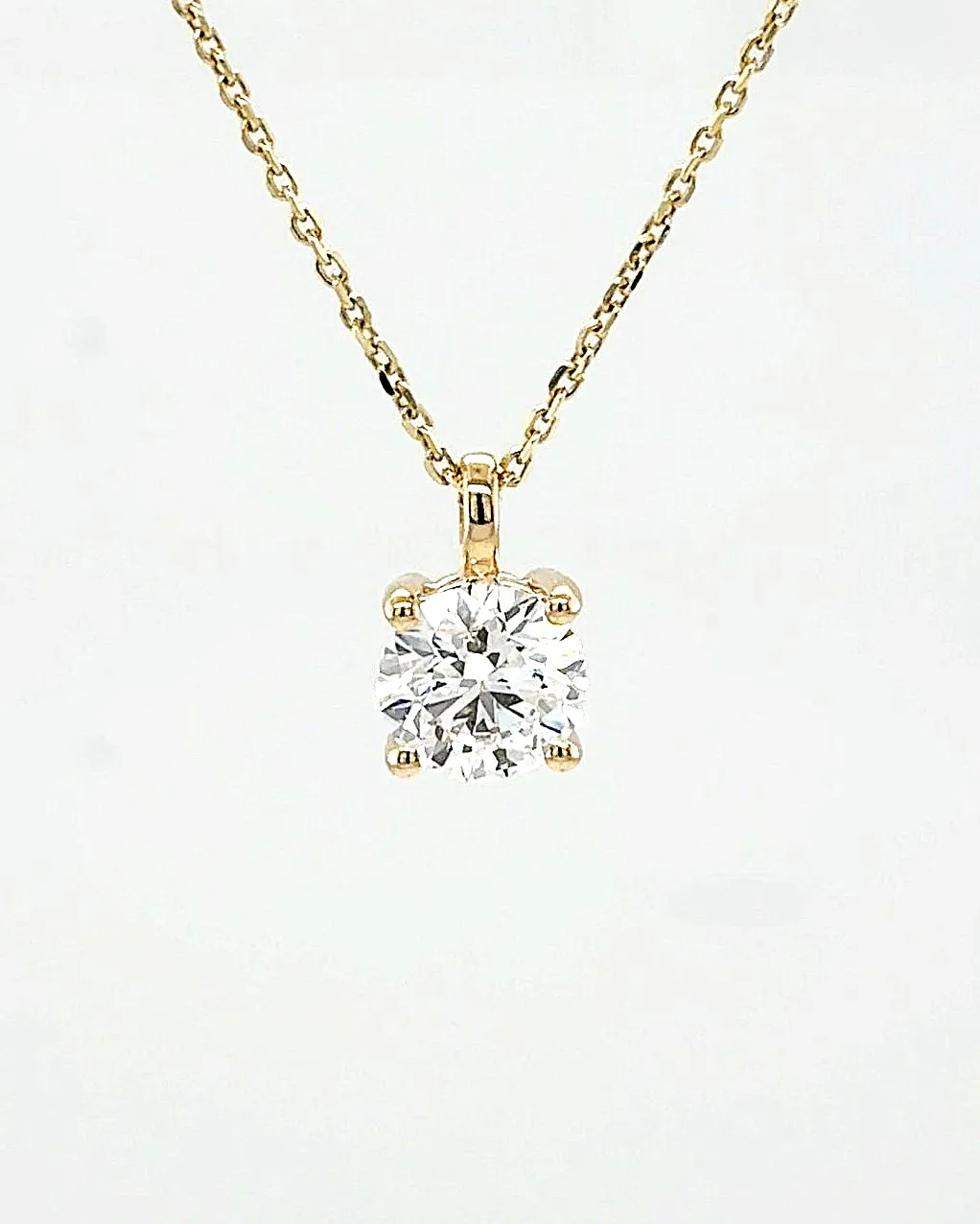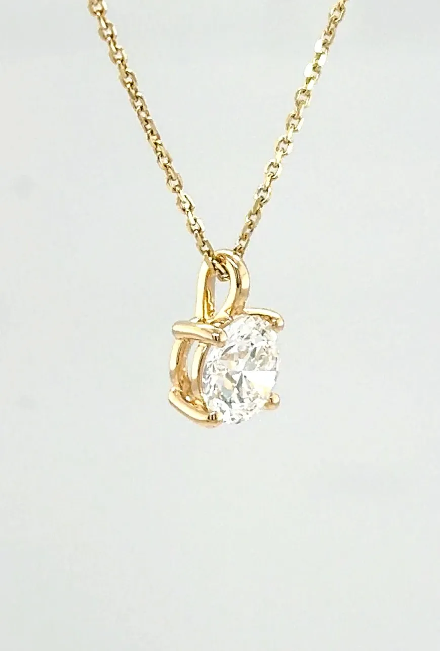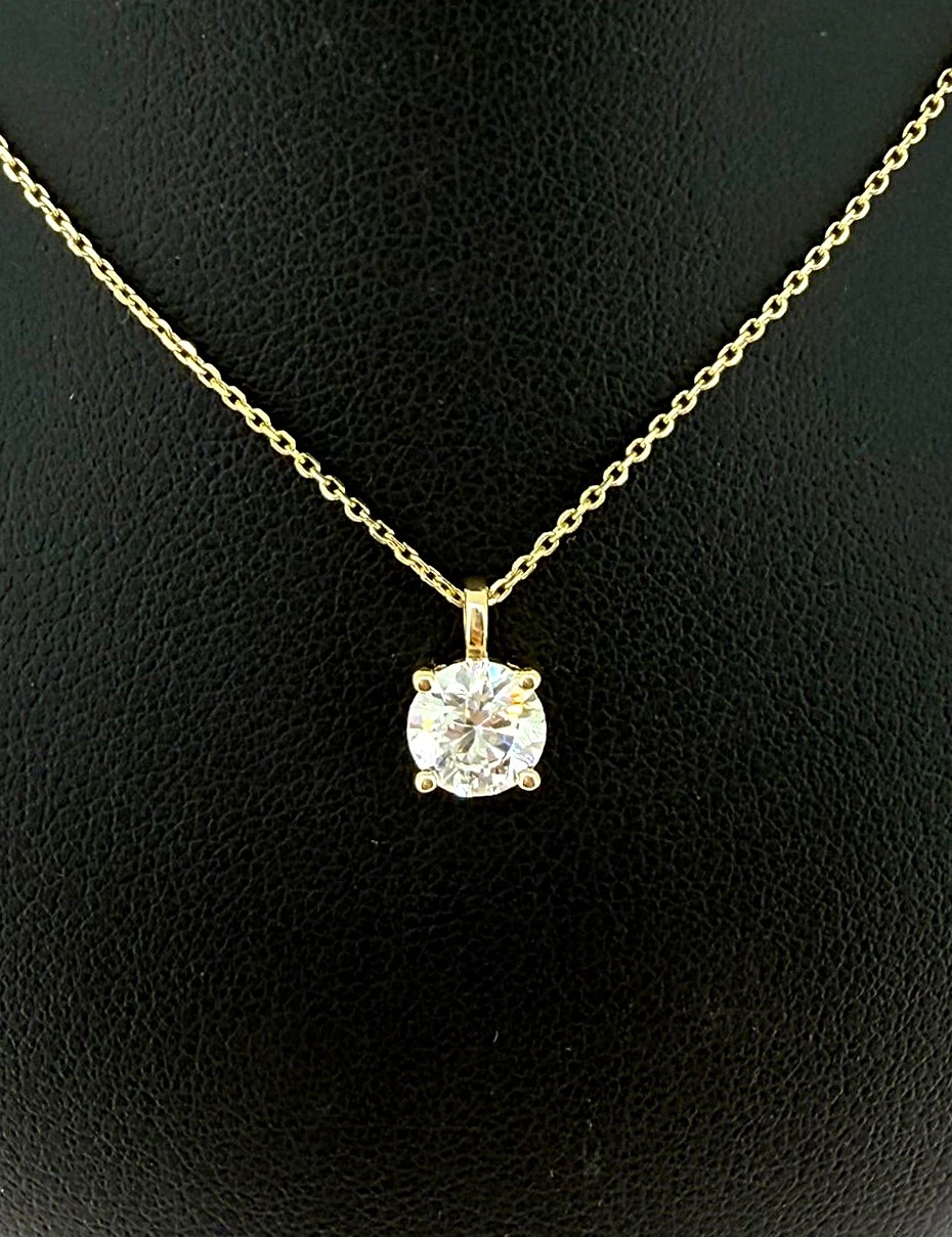 Exude timeless sophistication with this 1.00ct lab-grown diamond solitaire pendant, beautifully crafted in 9ct gold. Featuring a brilliant 1.00ct lab-grown diamond, ethically sourced for exceptional sparkle and clarity, this pendant is a conscious and elegant jewellery choice. The classic four-claw 9ct gold setting allows maximum light to enhance the diamond’s brilliance. Suspended on an adjustable 16/18-inch chain, it sits perfectly at the neckline for both everyday wear and special occasions. A thoughtful gift or a treasured addition to your personal collection, this pendant offers understated luxury and enduring style. Details: