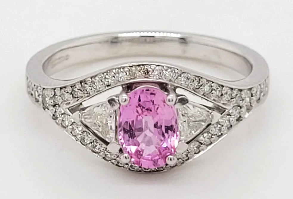 Bold and romantic, this striking ring features a vivid 1.00ct pink sapphire at its centre, surrounded by a dazzling 0.65ct of brilliant-cut diamonds, all expertly set in enduring platinum. With a substantial weight of 7.1g, the ring offers a luxurious presence and exceptional craftsmanship. Whether chosen as a unique engagement ring, an anniversary gift, or a standout piece of fine jewellery, this design embodies elegance, colour, and timeless sparkle.