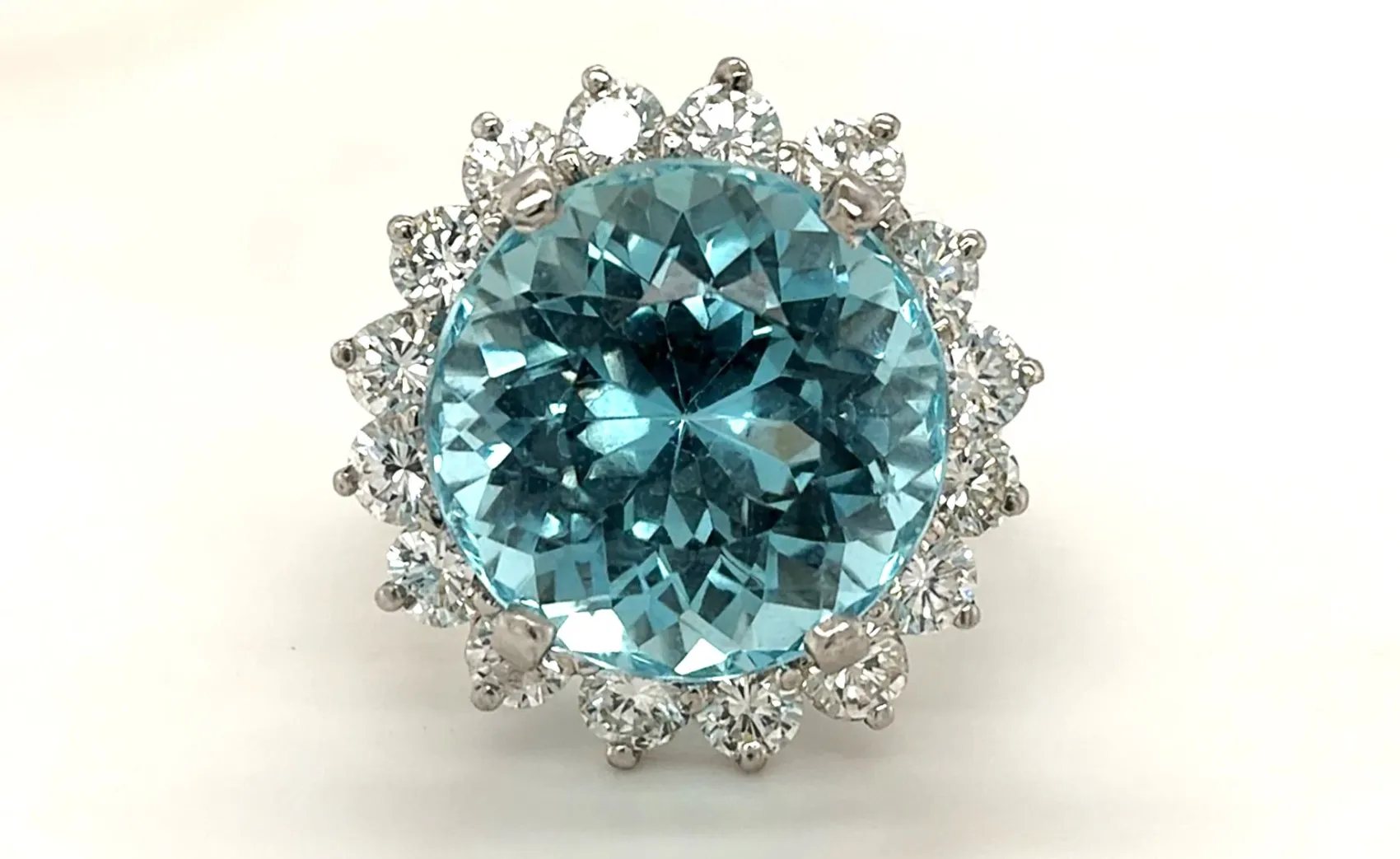 Make a statement of elegance with this stunning dress ring featuring a 13.50ct aquamarine centre stone, complemented by 2.06ct of sparkling natural diamonds, all set in 18ct white gold. Weighing 10g, this ring exudes luxury and sophistication, perfect for special occasions or as a show-stopping addition to any fine jewellery collection. The large oval aquamarine showcases a captivating pale blue hue, while the surrounding diamonds enhance its brilliance, creating a harmonious balance of colour and sparkle. Expertly crafted in 18ct white gold, the ring combines timeless design with contemporary elegance. Details: