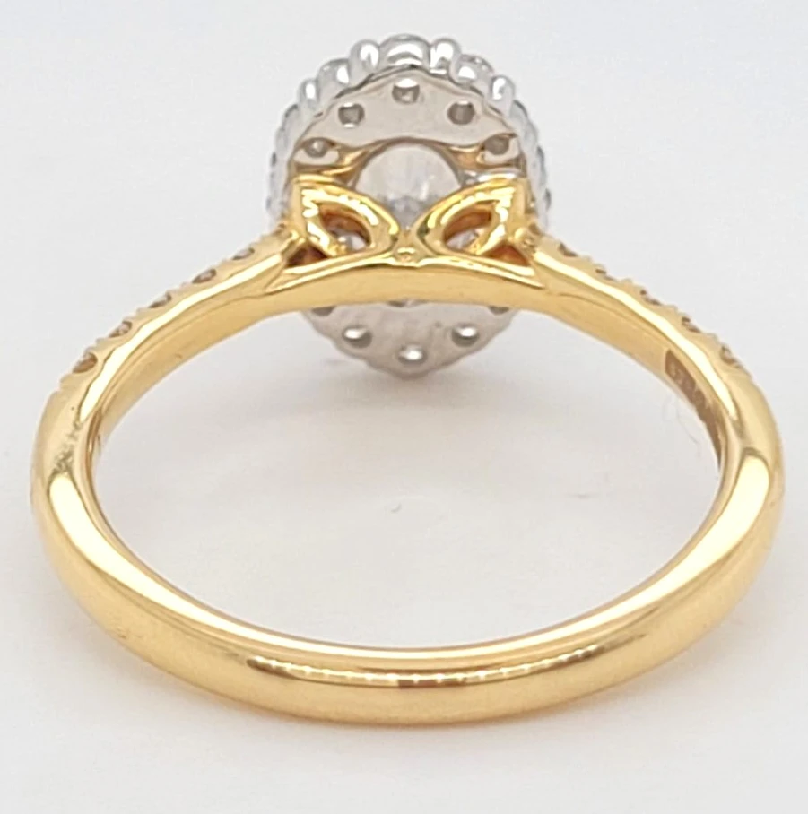 1.46ct Lab Grown Oval Diamond Halo Solitaire Ring in 18ct Gold (3.9g) Graceful and captivating, this 1.46 carat lab grown oval diamond halo solitaire ring is a perfect blend of classic elegance and modern sustainability. The striking oval-cut diamond, renowned for its elongated shape and exceptional brilliance, is beautifully encircled by a halo of smaller diamonds, enhancing its sparkle and presence. Set in rich 18ct gold and weighing 3.9 grams, the halo solitaire design exudes timeless sophistication while offering a durable and comfortable fit. This ethically sourced, conflict-free ring is an exquisite choice for engagements or special occasions, symbolising love with a conscious heart. Details: