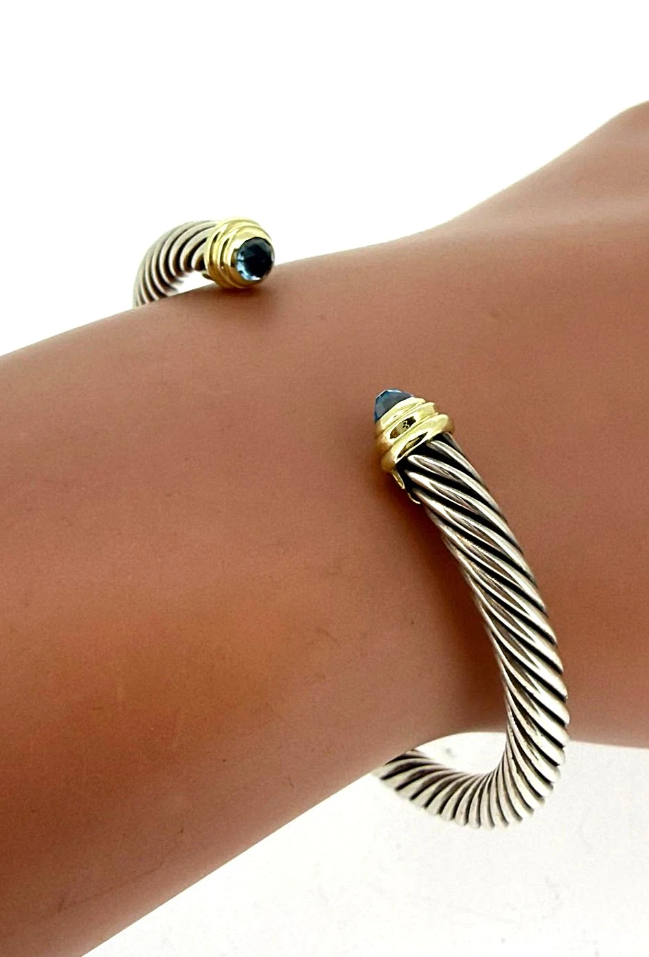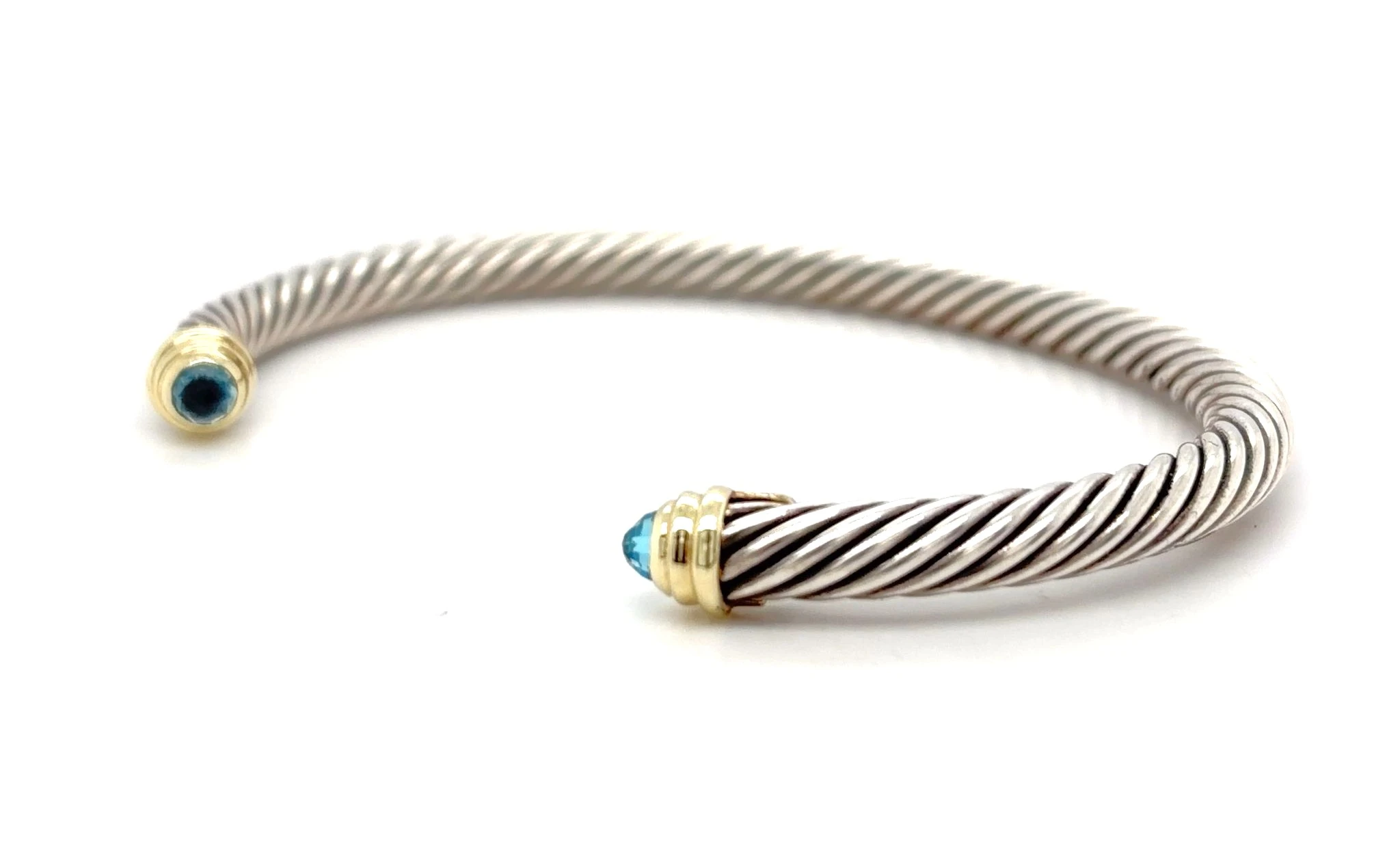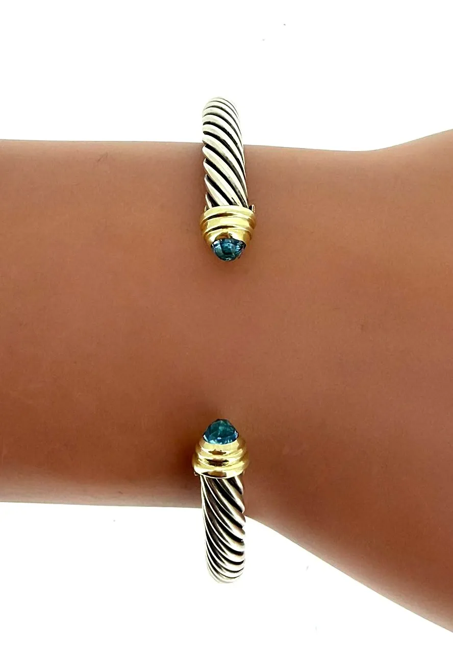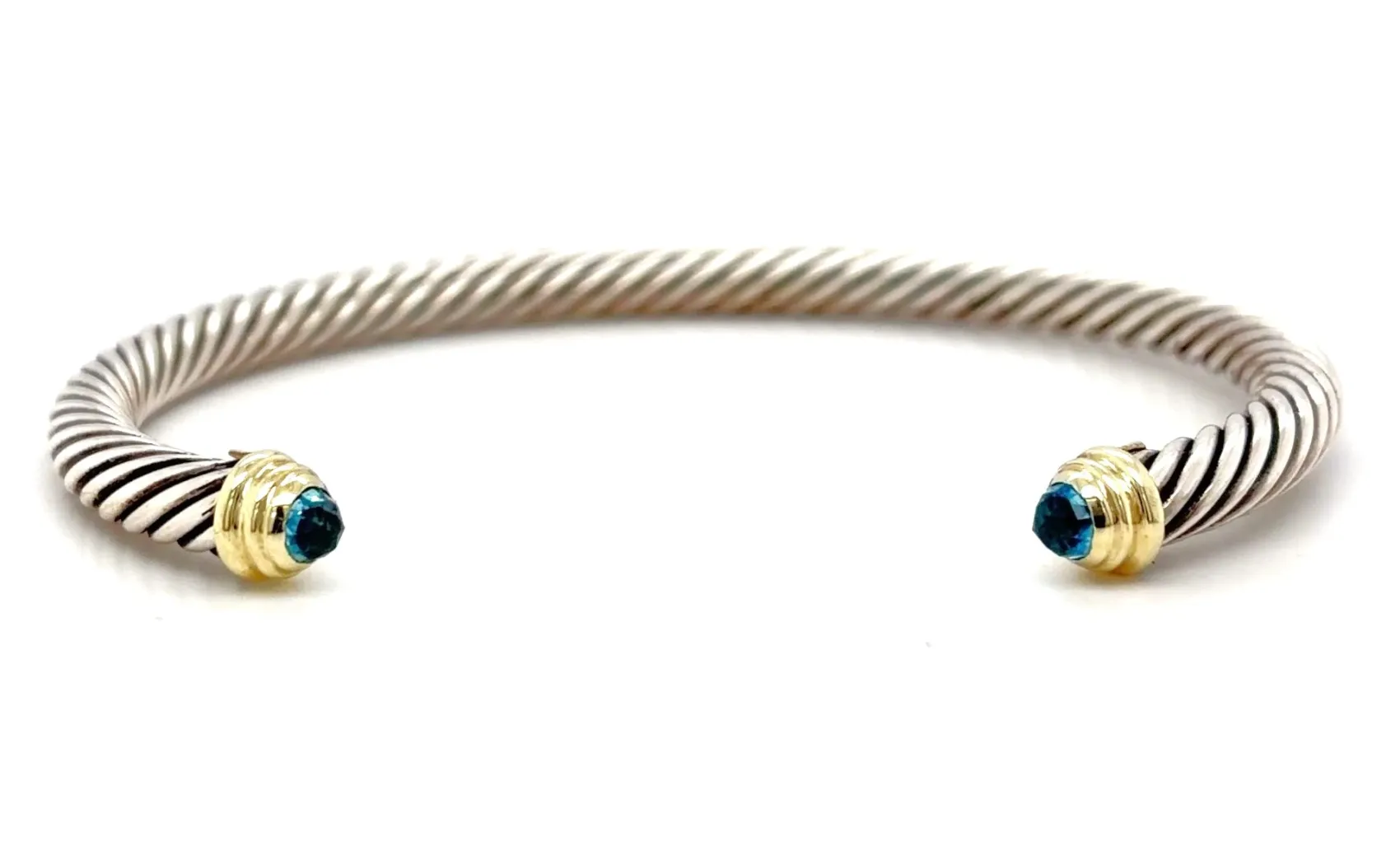14ct Gold & Silver 6.5mm Topaz Torque Bangle – 7.5 inch, 26.0g Elevate your style with this 14ct Gold and Silver Torque Bangle, featuring a stunning 6.5mm topaz at its centre. Crafted with a harmonious blend of gold and silver, this bangle offers a sophisticated and contemporary look, perfect for adding a touch of elegance to any outfit. Measuring 7.5 inches and weighing 26.0 grams, the torque design ensures a comfortable fit while making a bold statement. Ideal as a versatile everyday accessory or a striking piece for special occasions. Details: