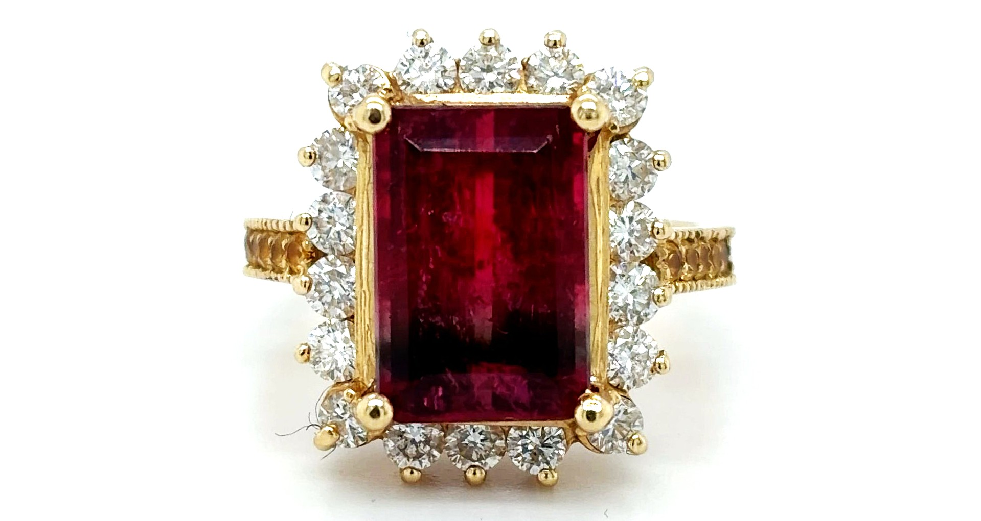 A bold and luxurious statement piece, this 14ct gold halo/dress ring showcases a magnificent 5.50ct tourmaline centre stone, surrounded by a dazzling 1.00ct diamond halo. The vibrant colour of the tourmaline is beautifully enhanced by the brilliance of the diamonds, creating exceptional sparkle and presence on the hand.