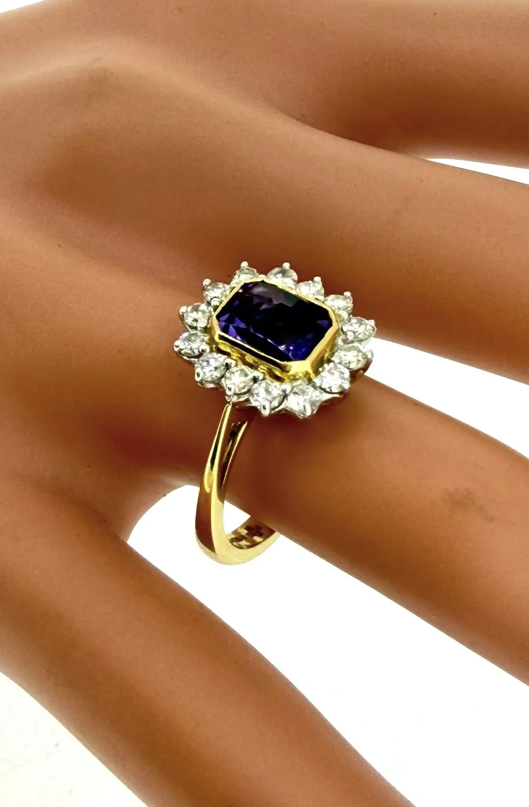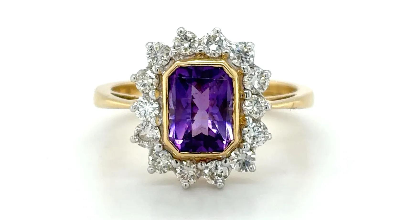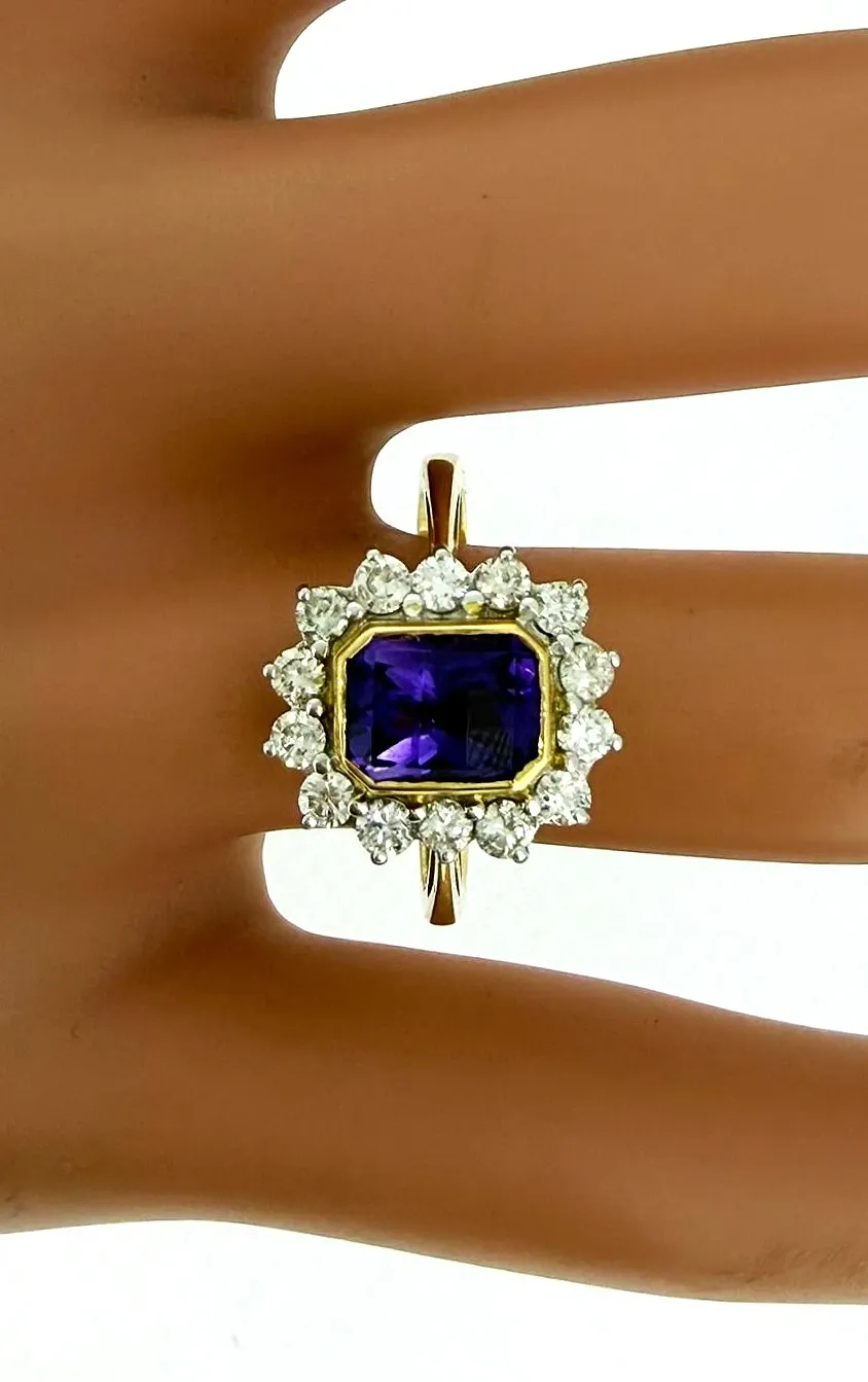 A vibrant and elegant statement piece, this ring features a 1.50ct amethyst centre stone, accented by 0.60ct of sparkling natural diamonds, all set in luxurious 18ct yellow gold. Weighing 6.3g, the ring combines rich colour with sophisticated brilliance, perfect for special occasions or as a standout addition to any fine jewellery collection. The oval-cut amethyst displays a captivating purple hue, while the surrounding diamonds enhance its sparkle and elegance. Expertly crafted in 18ct yellow gold, this ring offers enduring quality and timeless style. Details: