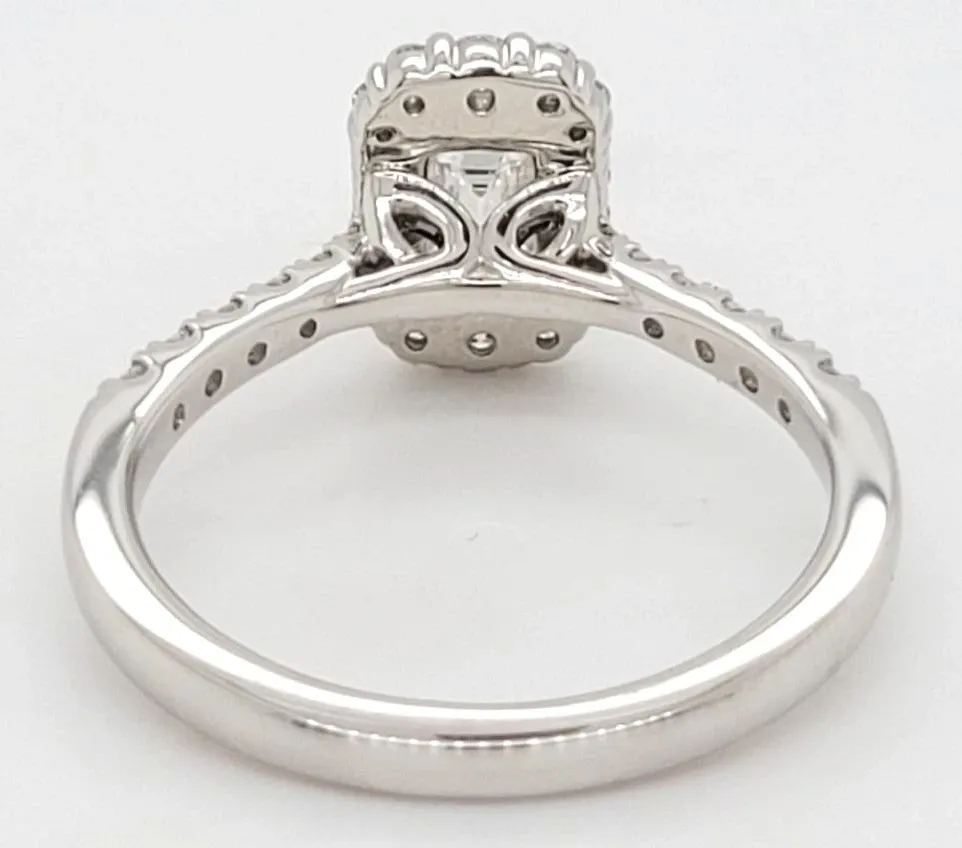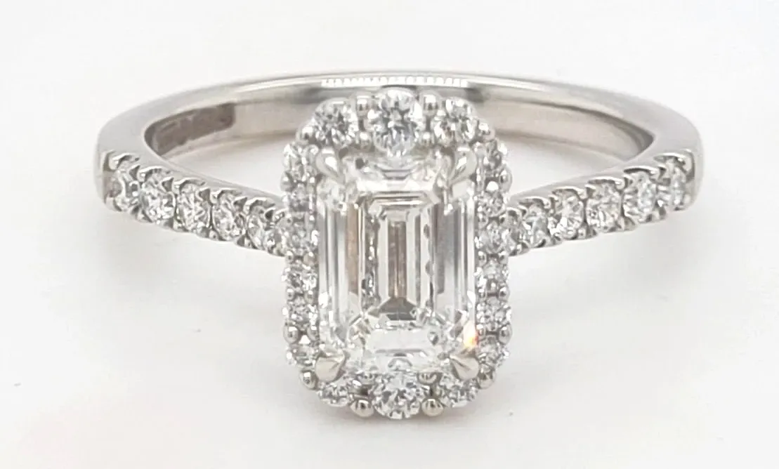 1.58ct Lab Grown Emerald Cut Diamond Halo Solitaire Ring in Platinum (5.7g) Timeless elegance meets modern sustainability in this exquisite 1.58 carat lab grown emerald cut diamond halo solitaire ring, beautifully set in durable platinum. The sleek emerald cut showcases the diamond’s clarity and sophistication, while the surrounding halo of smaller diamonds amplifies its brilliance. Weighing 5.7 grams, the platinum band offers exceptional strength and a luxurious finish, making this ring perfect for engagements or special occasions. Crafted with ethically sourced, conflict-free lab grown diamonds, it combines conscious luxury with classic design. Details: