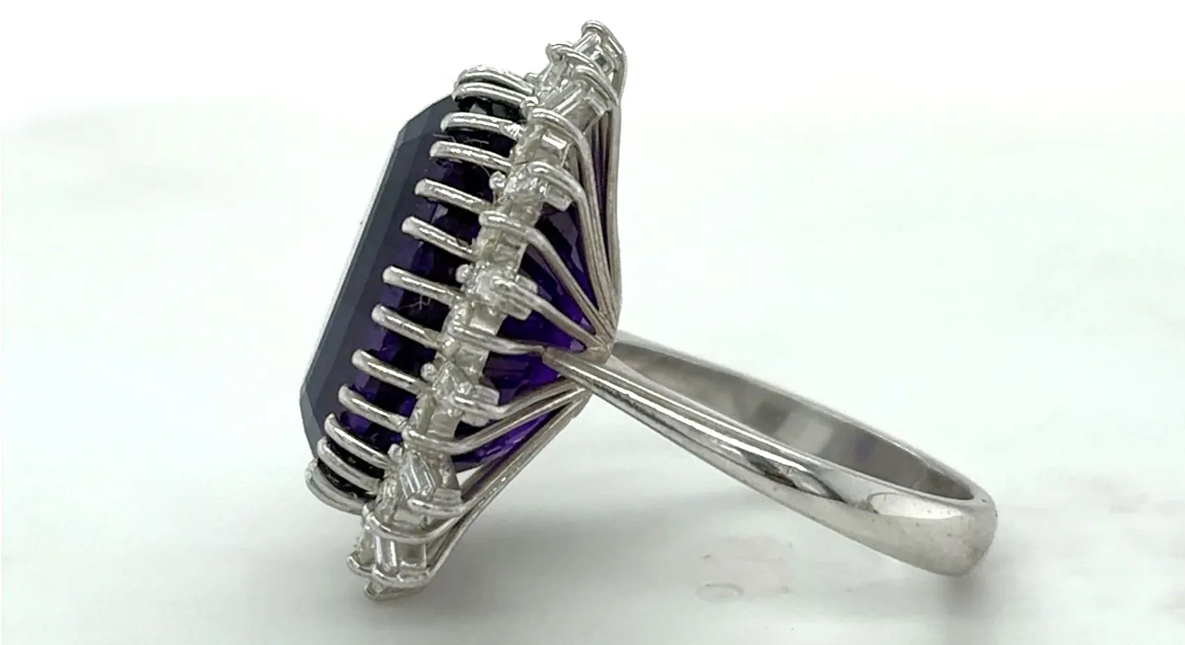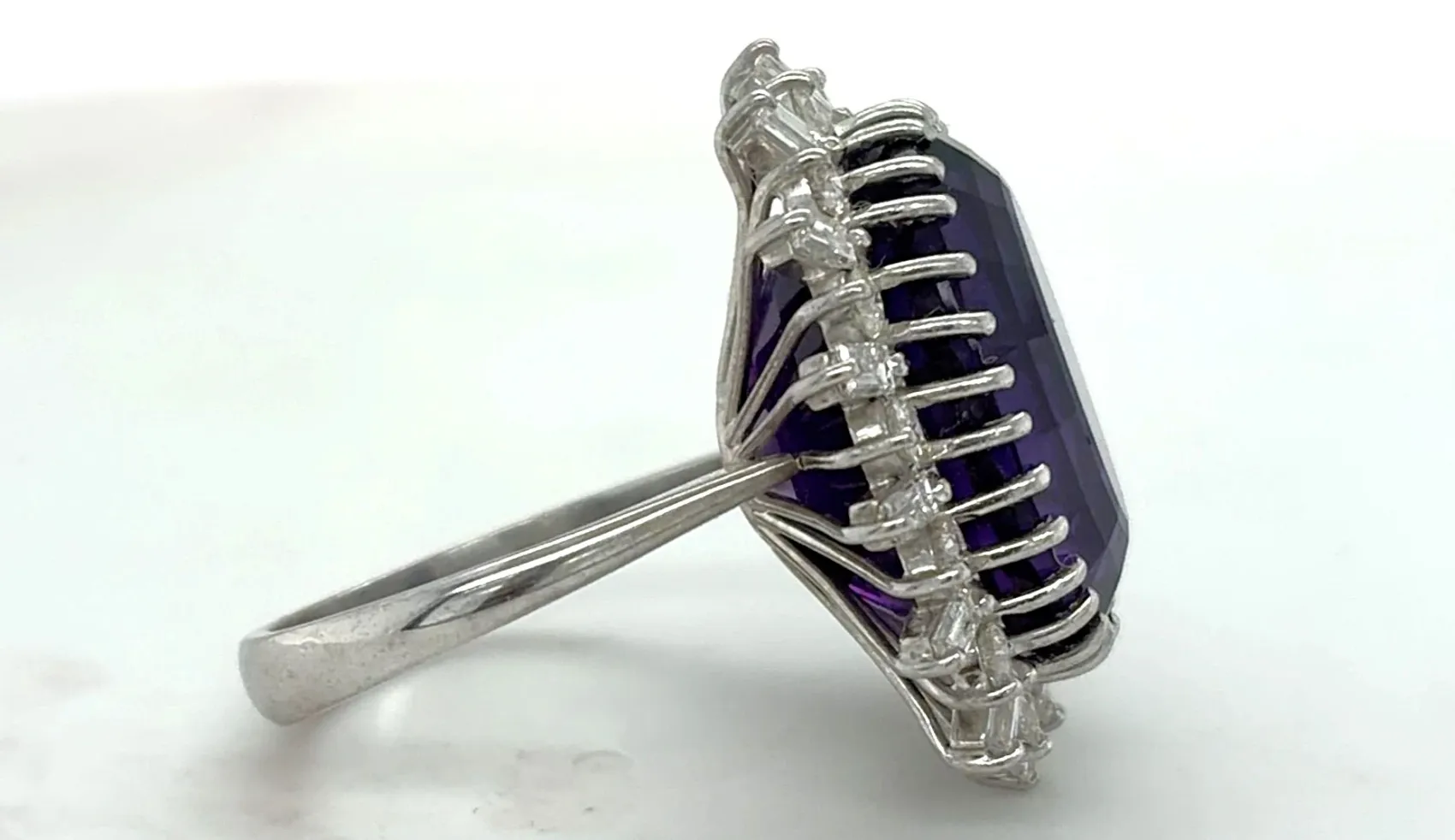 Make a statement with this exquisite dress ring featuring a spectacular 15.00ct amethyst centre stone, encircled by 1.50ct of sparkling natural diamonds in a platinum halo setting. Weighing 11.1g, this ring combines vibrant colour with luxurious brilliance, perfect for special occasions or as a standout piece in any fine jewellery collection. The oval-cut amethyst displays a rich, captivating purple hue, while the surrounding diamonds enhance its brilliance and create a timeless halo effect. Crafted in platinum for enduring quality, this ring offers both elegance and sophistication. Details: