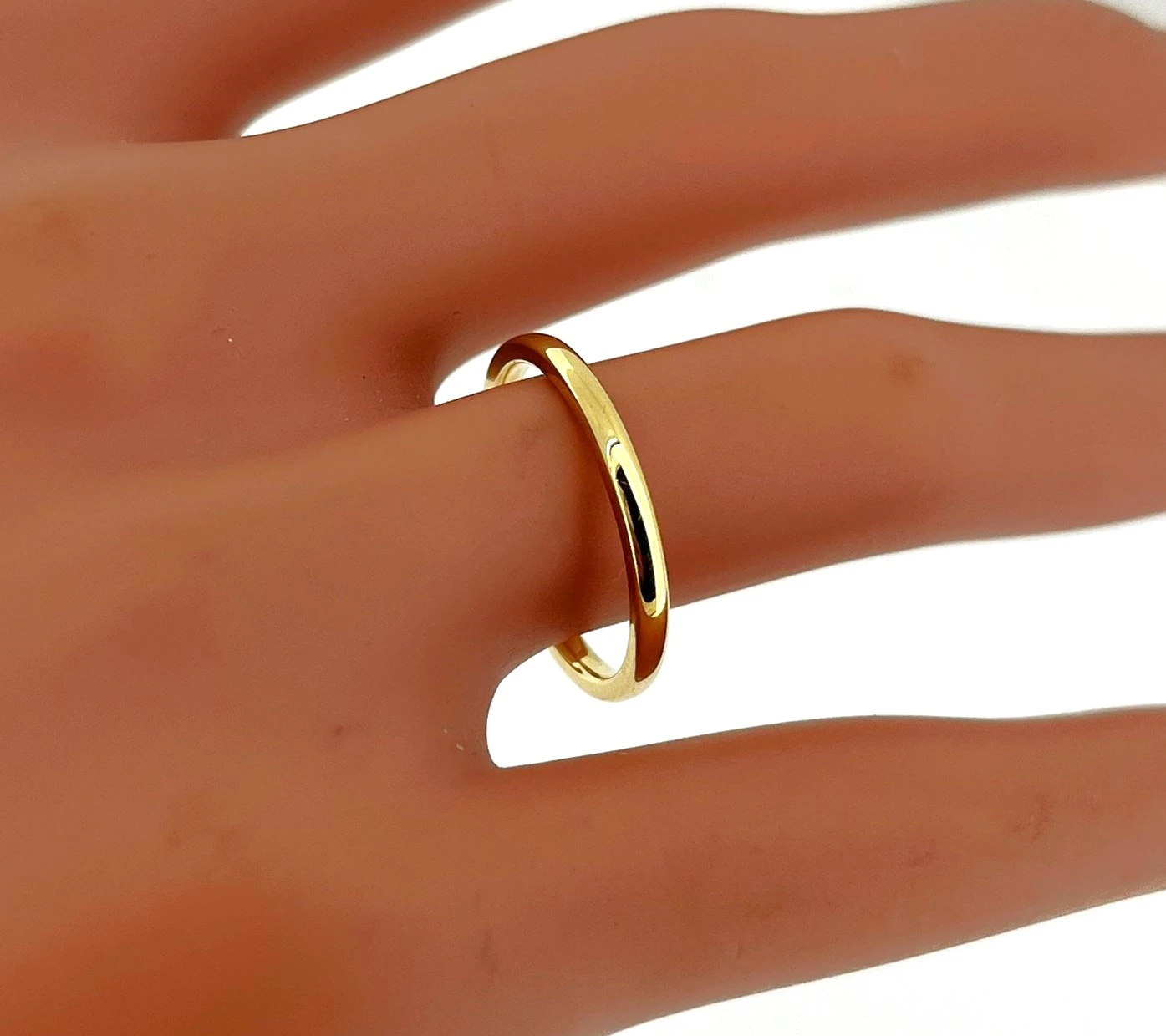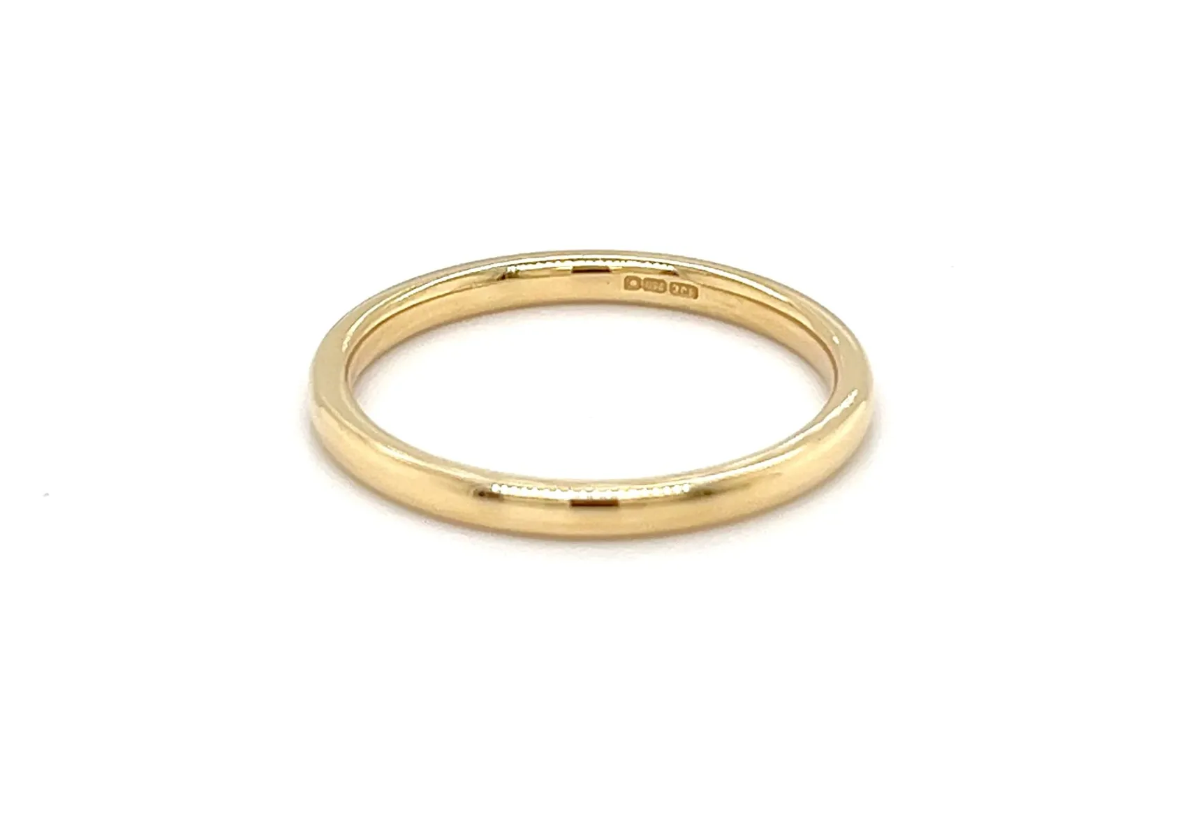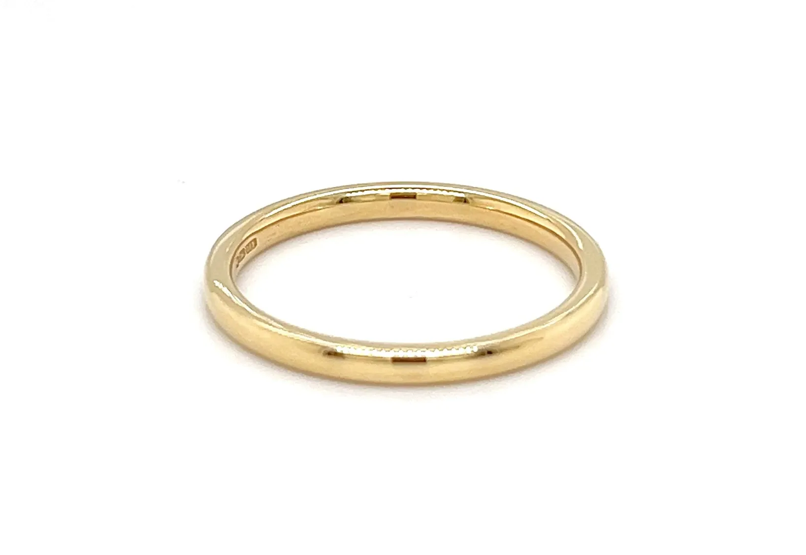 18ct Yellow Gold 2mm Court Wedding Band – 2.5g A delicate and timeless symbol of love, this 2mm wedding band is crafted from 18ct yellow gold, offering both elegance and lasting quality. Its court profile ensures a comfortable fit, making it perfect for everyday wear while maintaining a refined, minimalist appearance. Weighing 2.5 grams, this lightweight band is ideal as a subtle standalone ring or for stacking with other bands. The polished finish highlights the rich, warm hue of yellow gold, representing enduring commitment and understated sophistication.