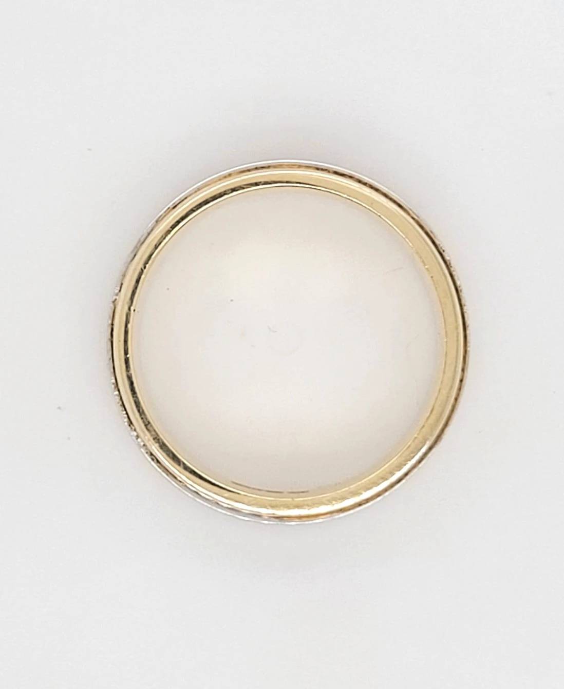 9ct Yellow & White Gold Spinner Band – 5.1g This contemporary spinner band combines tactile movement with classic two-tone style. Crafted from 9ct yellow and white gold and weighing 5.1 grams, the design features a sleek central spinning white gold section, framed by polished yellow gold edges. Perfect as a modern wedding band or a stylish everyday piece, this ring offers both visual contrast and interactive appeal. The spinner element adds a unique, comforting twist, making it ideal for those who appreciate detail and individuality in their jewellery.