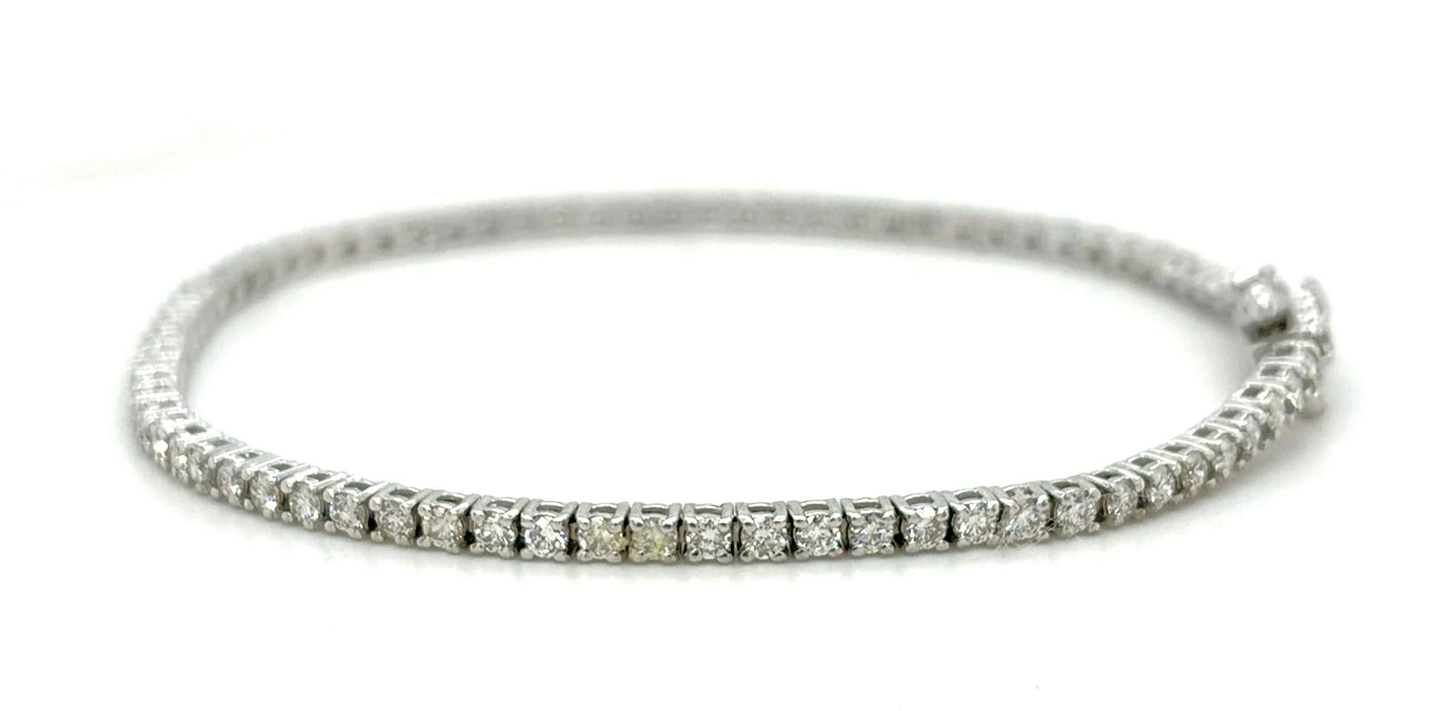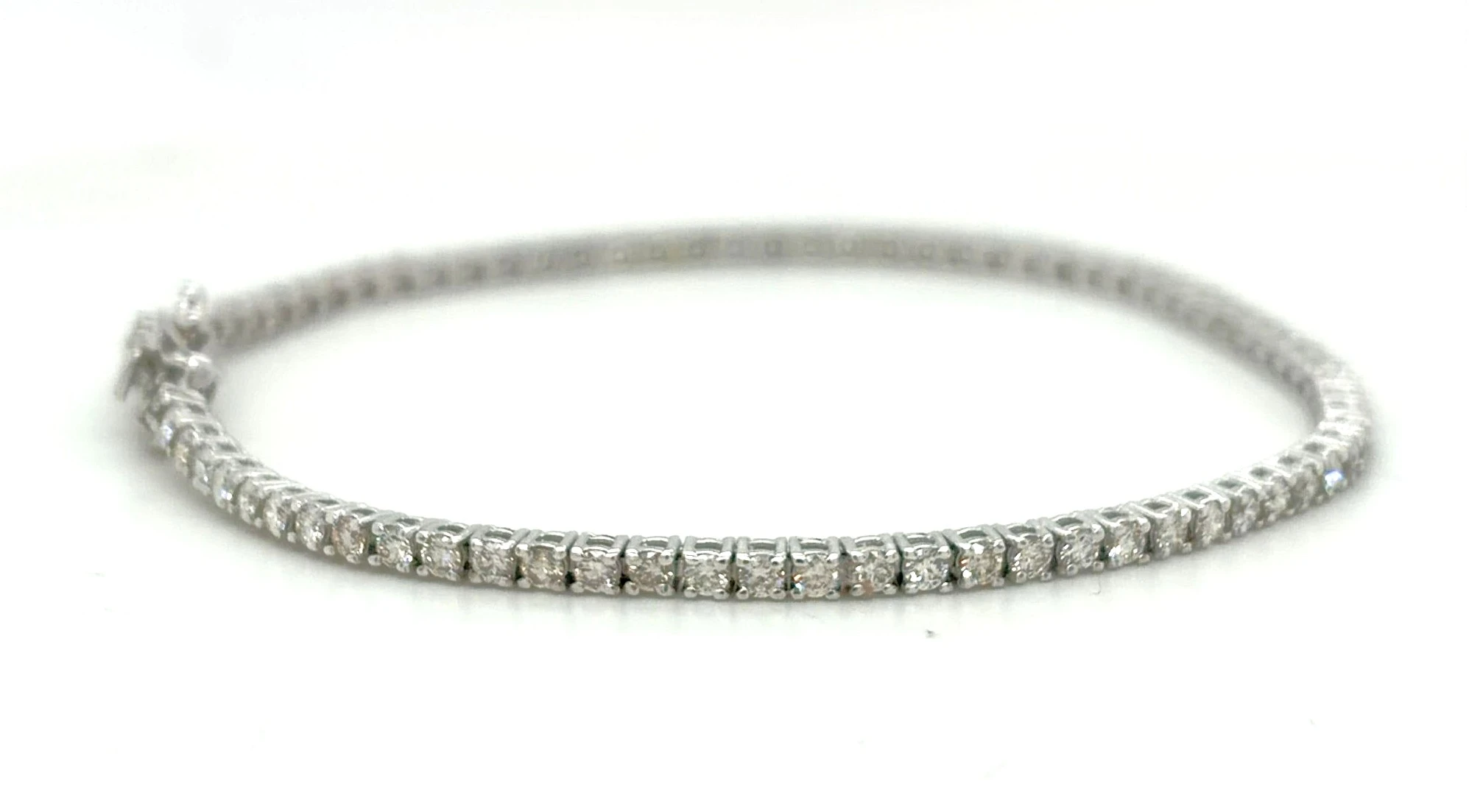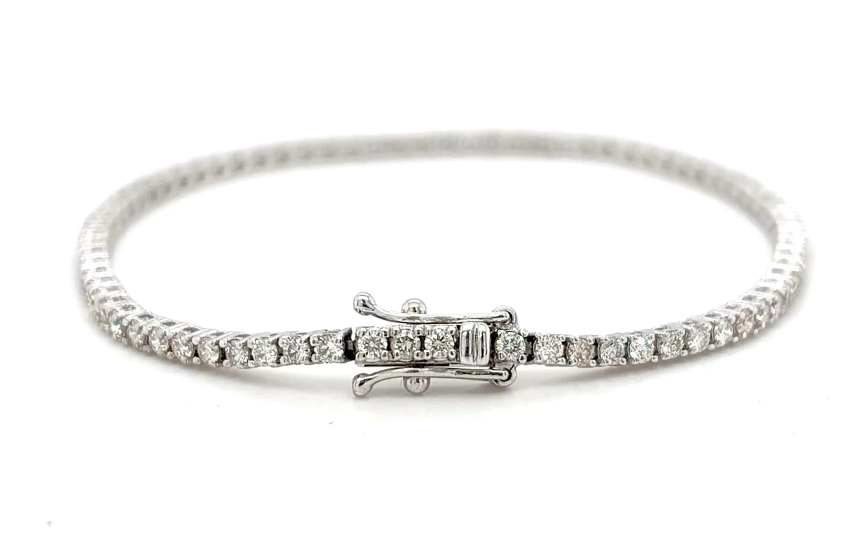 2.00ct Diamond & 18ct White Gold Tennis Bracelet – 7.25 inch, 8.0g Exude timeless elegance with this stunning 2.00ct Diamond Tennis Bracelet, crafted in 18ct white gold for enduring beauty and sophistication. Featuring a continuous line of brilliant-cut diamonds, this bracelet offers dazzling sparkle from every angle, making it a perfect statement piece for any occasion. Measuring 7.25 inches and weighing 8.0 grams, it is designed for a comfortable and secure fit, making it ideal for daily wear or special events. The classic design ensures it remains a versatile and cherished addition to any fine jewellery collection. Details: