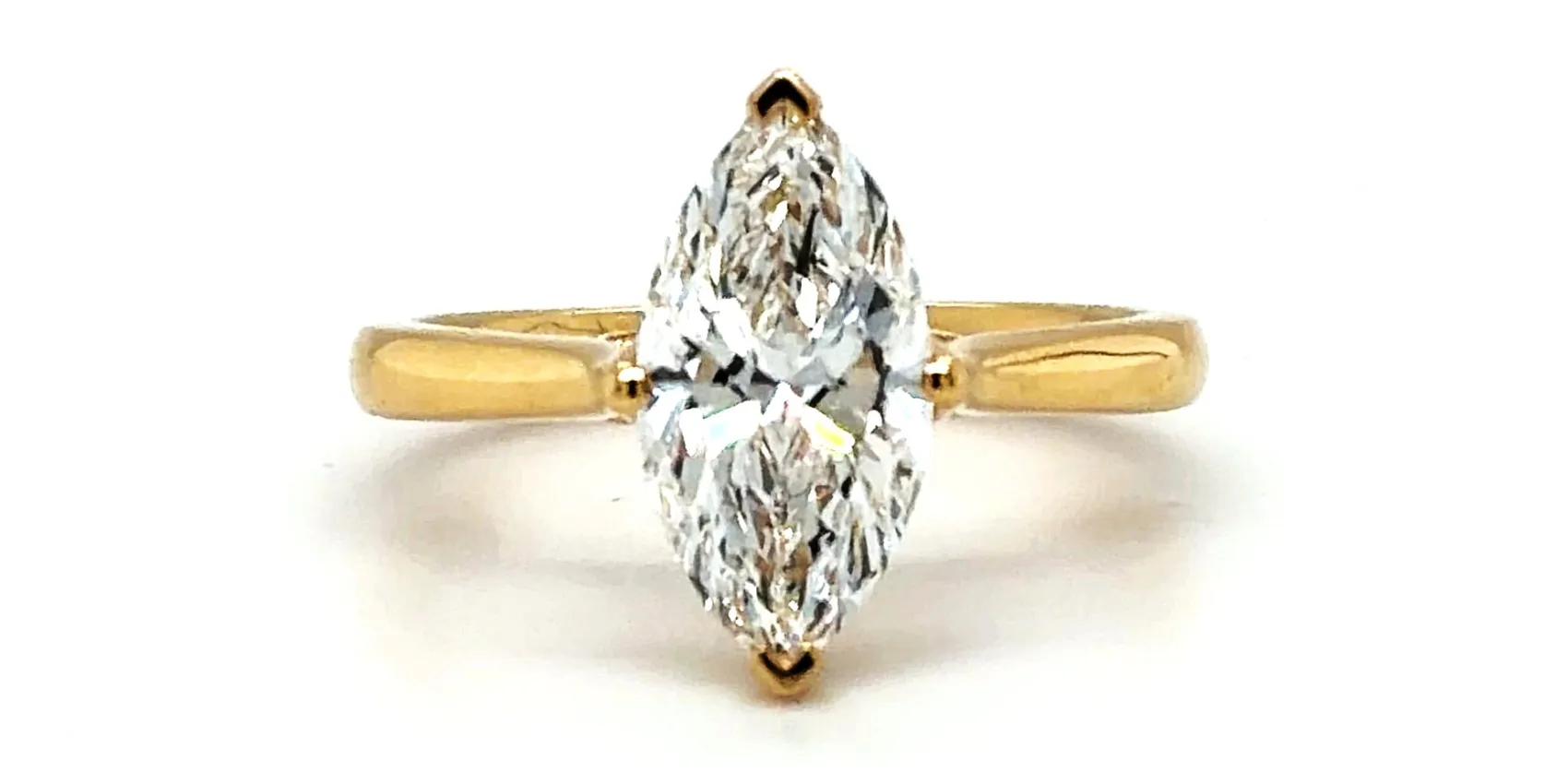 Distinctive and elegant, this stunning marquise-cut solitaire ring is crafted in 18ct gold and set with a dazzling 2.03 carat lab grown diamond. The elongated marquise shape creates a flattering, finger-lengthening effect while delivering exceptional brilliance and fire. The classic solitaire setting allows the diamond to take centre stage, offering a clean and timeless design. Weighing 4.9 grams, the ring provides a substantial yet comfortable feel, ideal for everyday luxury. Perfect as a unique engagement ring, anniversary gift, or statement piece, this marquise lab grown diamond ring combines ethical sourcing with refined craftsmanship and modern sophistication.
