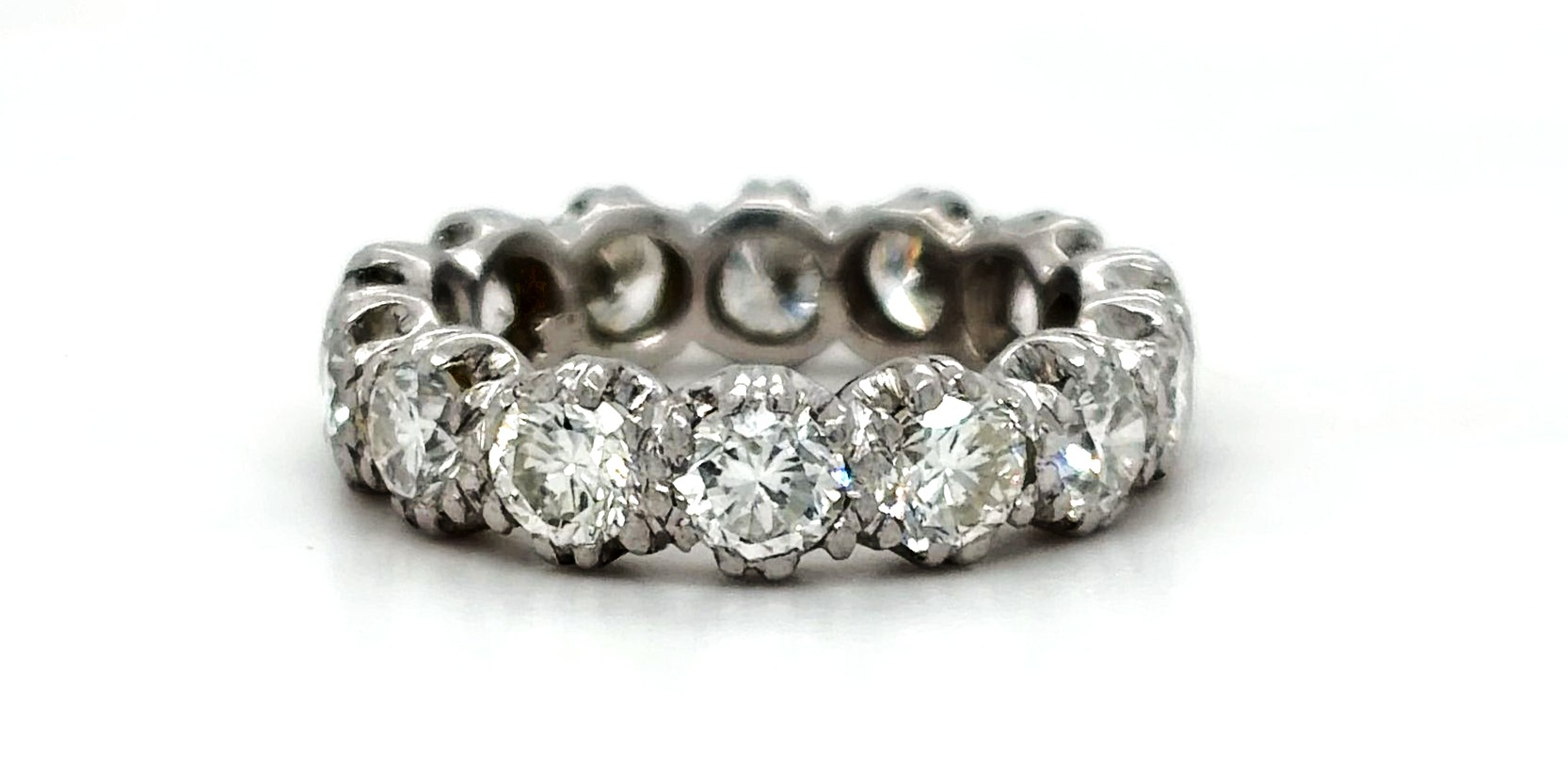 Luxurious and timeless, this full diamond eternity band is crafted in 18ct white gold and set with a total of 2.10 carats of sparkling diamonds. The diamonds are arranged in a continuous full band design, symbolising everlasting love and commitment. Measuring 5.0mm in width and weighing 6.5 grams, this ring offers a substantial yet comfortable feel, making it ideal as a wedding band, anniversary ring, or elegant standalone statement piece. The polished white gold enhances the brilliance of the diamonds, creating exceptional sparkle from every angle. A refined and meaningful piece, this 2.10ct diamond full band combines durability, elegance, and enduring style
