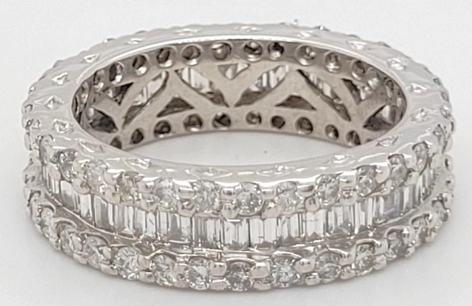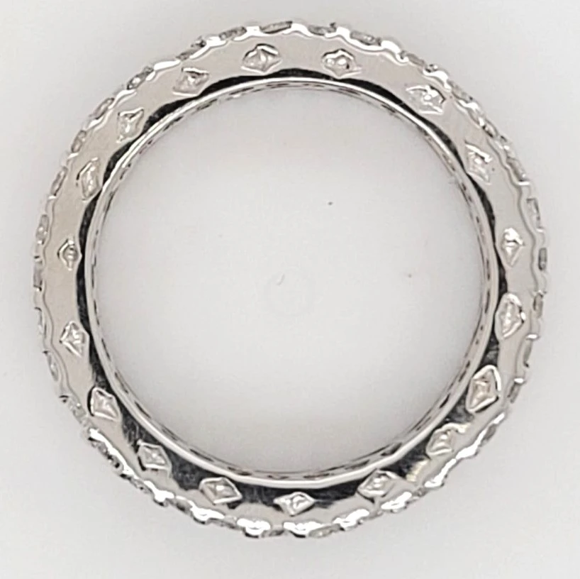 2.13ct Full Diamond & 18ct White Gold Eternity/Wedding Band – 5.8g Experience the pinnacle of luxury with this exquisite 2.13ct full diamond eternity band, beautifully crafted in 18ct white gold. Weighing 5.8 grams, this ring offers a perfect balance of substantial presence and comfortable wear. Featuring a continuous row of brilliant-cut diamonds that encircle the entire band, this piece symbolises eternal love and commitment. Each diamond is meticulously set to maximise sparkle, delivering breathtaking brilliance from every angle. Ideal as a wedding band, anniversary ring, or statement piece, this full diamond eternity band is a timeless celebration of lasting beauty. Specifications: