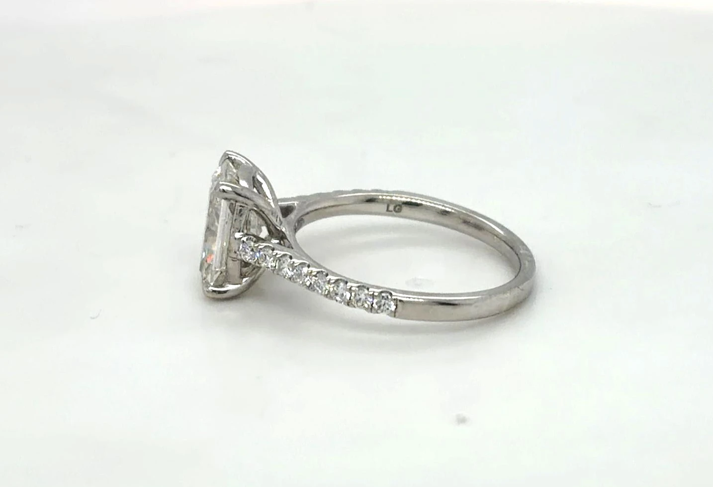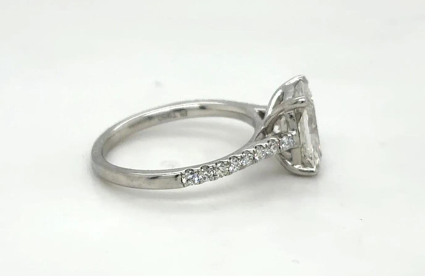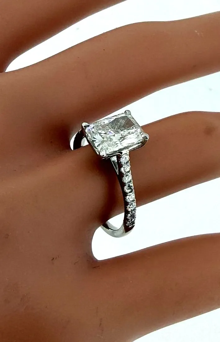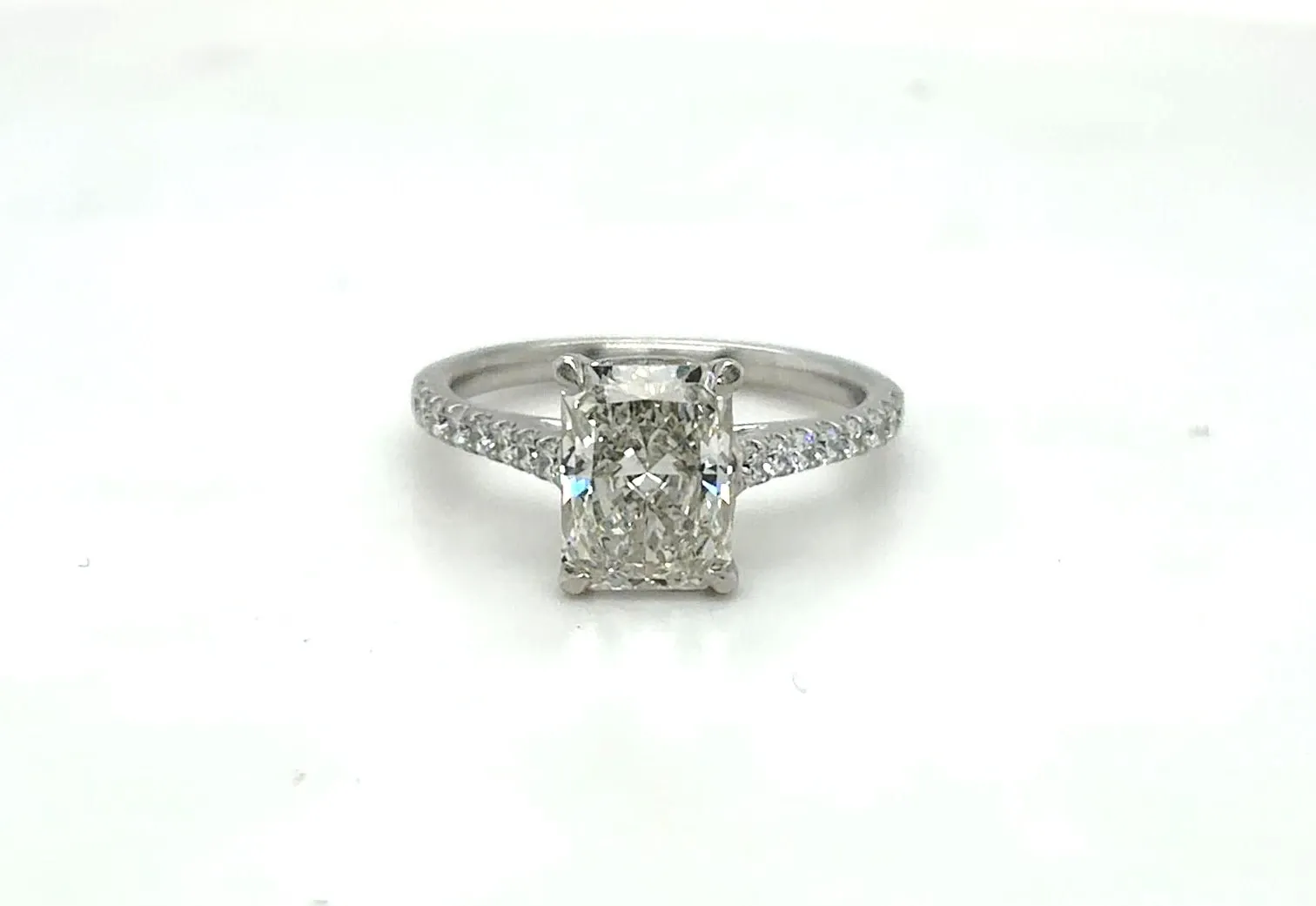 2.37ct Lab Grown Radiant Cut Diamond & Platinum Solitaire Ring (4.3g) Timeless elegance meets modern innovation in this exquisite 2.37-carat lab grown radiant cut diamond solitaire ring. Expertly crafted in solid platinum (4.3g), the ring showcases a breathtaking radiant cut diamond — renowned for its brilliant sparkle and crisp, geometric lines. Set in a classic four-claw setting, the diamond takes centre stage, reflecting light from every angle for a mesmerising display of fire and brilliance. The sleek platinum band offers a luxurious weight and enduring strength, perfectly complementing the stone’s exceptional clarity and cut. Ethically created and environmentally conscious, this lab grown diamond offers all the beauty and brilliance of a mined stone — with none of the compromise. A sophisticated choice for an engagement or a statement of refined taste, this radiant cut platinum solitaire ring embodies pure, understated luxury.