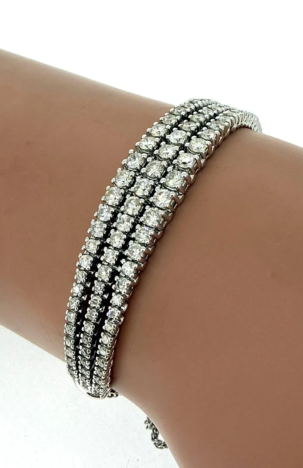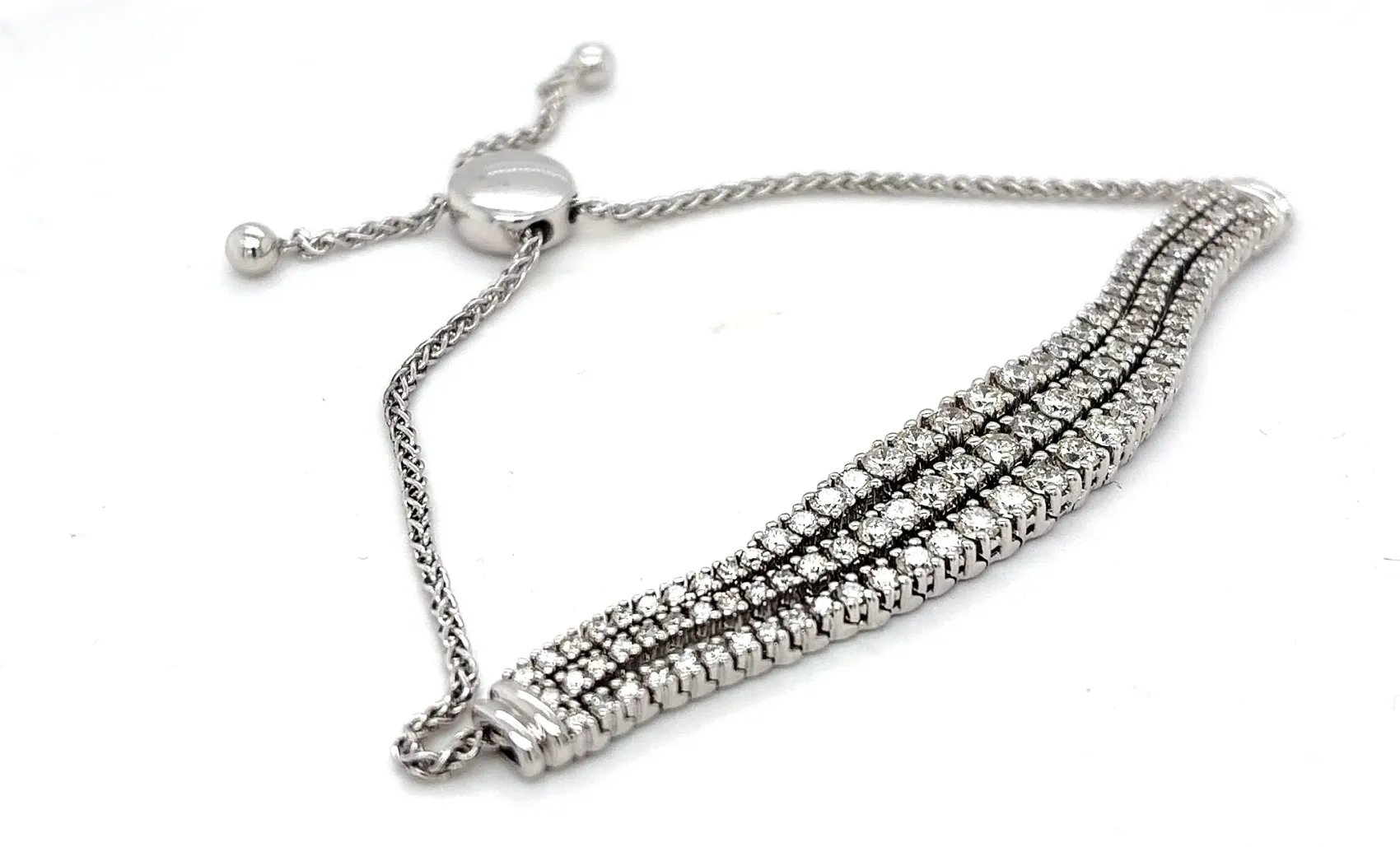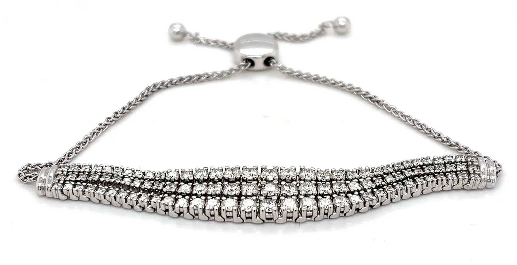 Elevate your jewellery collection with this exquisite triple row tennis bracelet, expertly crafted in luminous 10ct white gold. Showcasing a total of 3.00 carats of sparkling diamonds, each stone is carefully set to maximise brilliance and create a seamless flow of light across the wrist. The elegant triple row design offers a bold yet refined look, perfect for both special occasions and everyday luxury. Finished with an adjustable clasp, the bracelet ensures a secure and comfortable fit while maintaining its sophisticated silhouette. With a substantial weight of 14.9 grams, this bracelet reflects exceptional craftsmanship and enduring quality. A timeless statement piece that embodies classic glamour with a contemporary edge. Features: