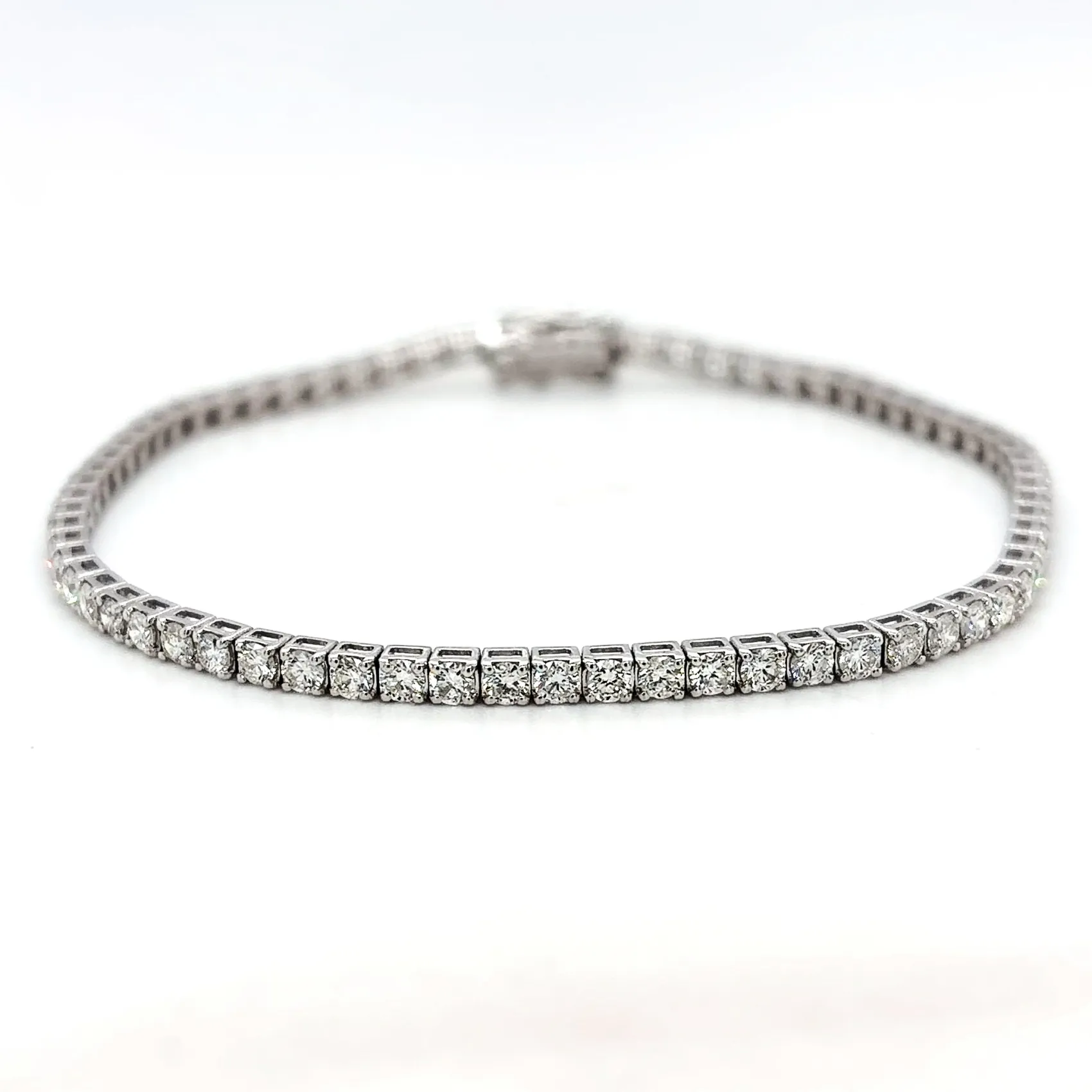 Elegant and timeless, this beautiful diamond tennis bracelet is crafted in 18ct white gold and set with a total of 3.11 carats of sparkling diamonds. Designed in the classic tennis style, the diamonds are precisely aligned to create a seamless row of brilliance around the wrist. Measuring 7.5 inches in length and weighing 6.9 grams, this bracelet offers a refined and comfortable fit while maintaining a luxurious presence. The polished white gold setting enhances the diamonds’ fire and clarity, making it perfect for formal occasions, anniversaries, or everyday elegance. A sophisticated addition to any fine jewellery collection, this 3.11ct diamond tennis bracelet embodies classic style and enduring luxury.