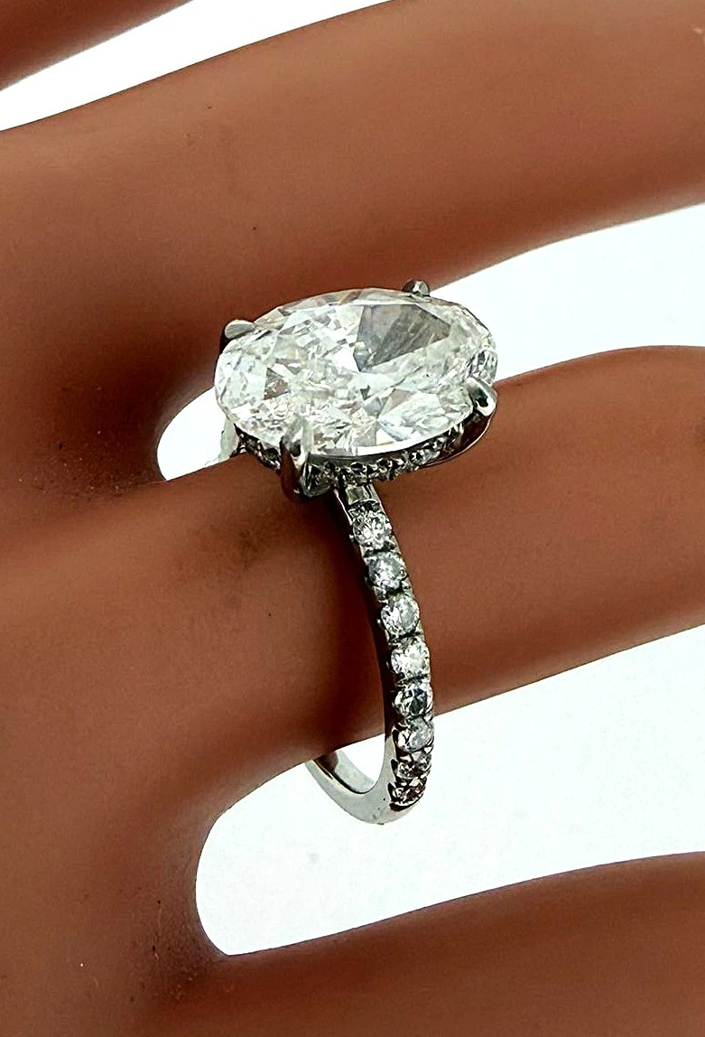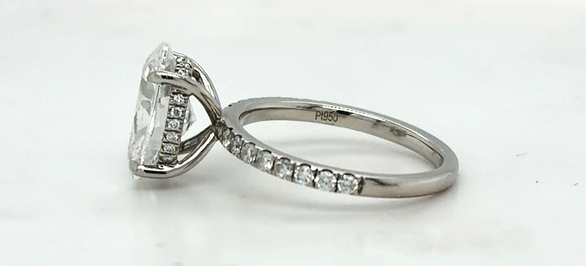 Make a bold statement with this spectacular 3.45ct lab-grown diamond solitaire ring, exquisitely crafted in platinum. Featuring a subtle hidden halo design, the ring enhances the central diamond’s brilliance, adding a touch of secret glamour while maintaining a sleek, elegant profile. The platinum band ensures durability and a luxurious finish, while the 4.3g weight gives the ring a substantial yet comfortable feel. Perfect as an engagement ring or a standout piece of fine jewellery, this ring combines modern sophistication with timeless appeal. Features: