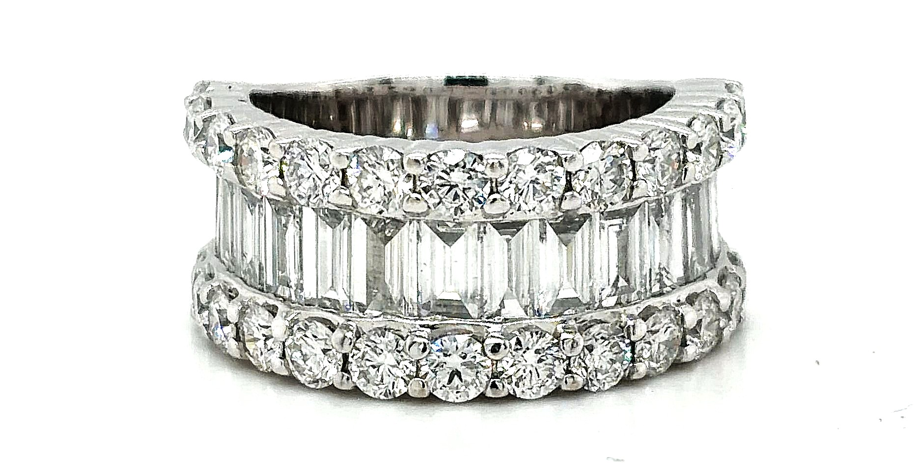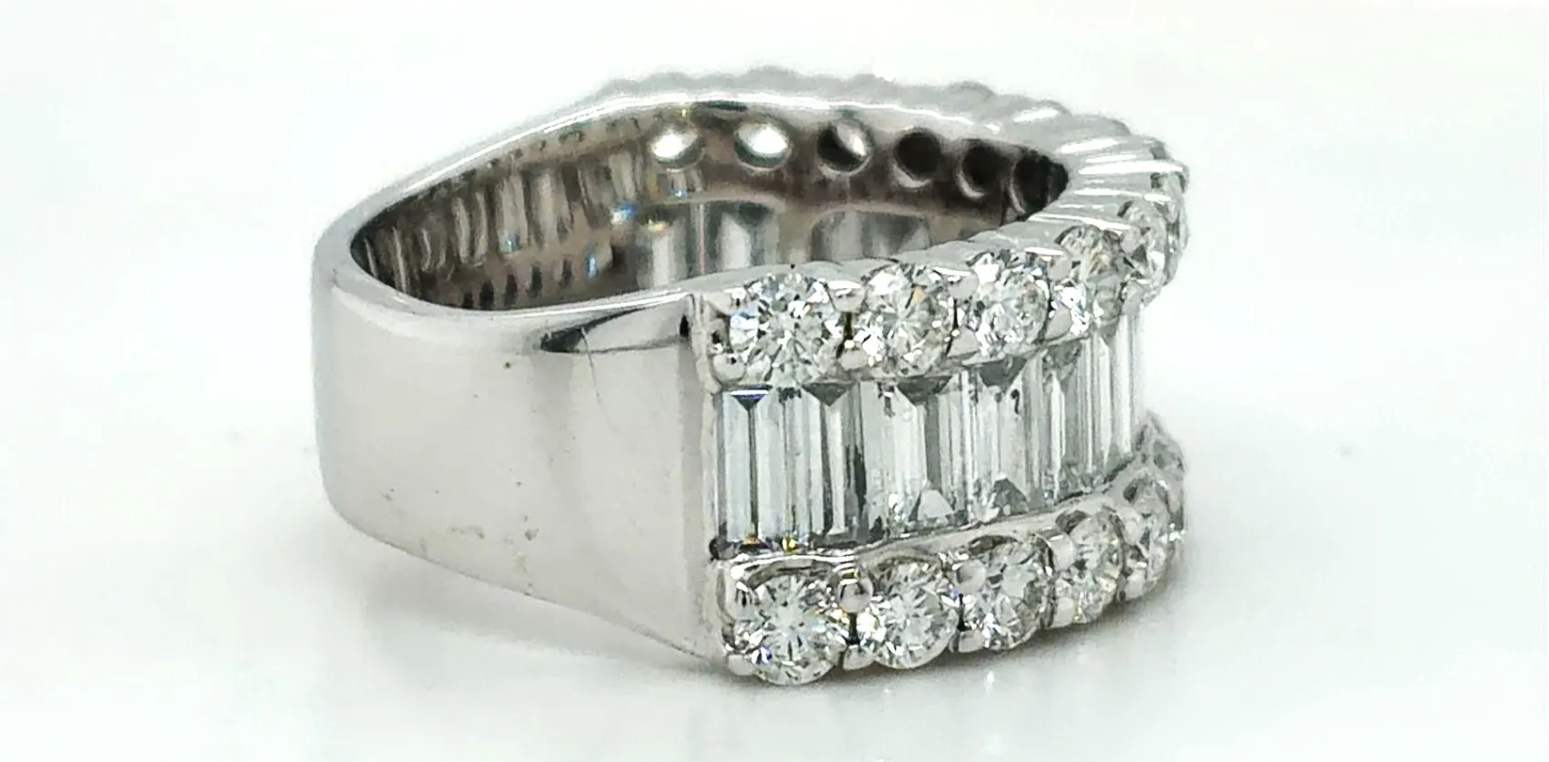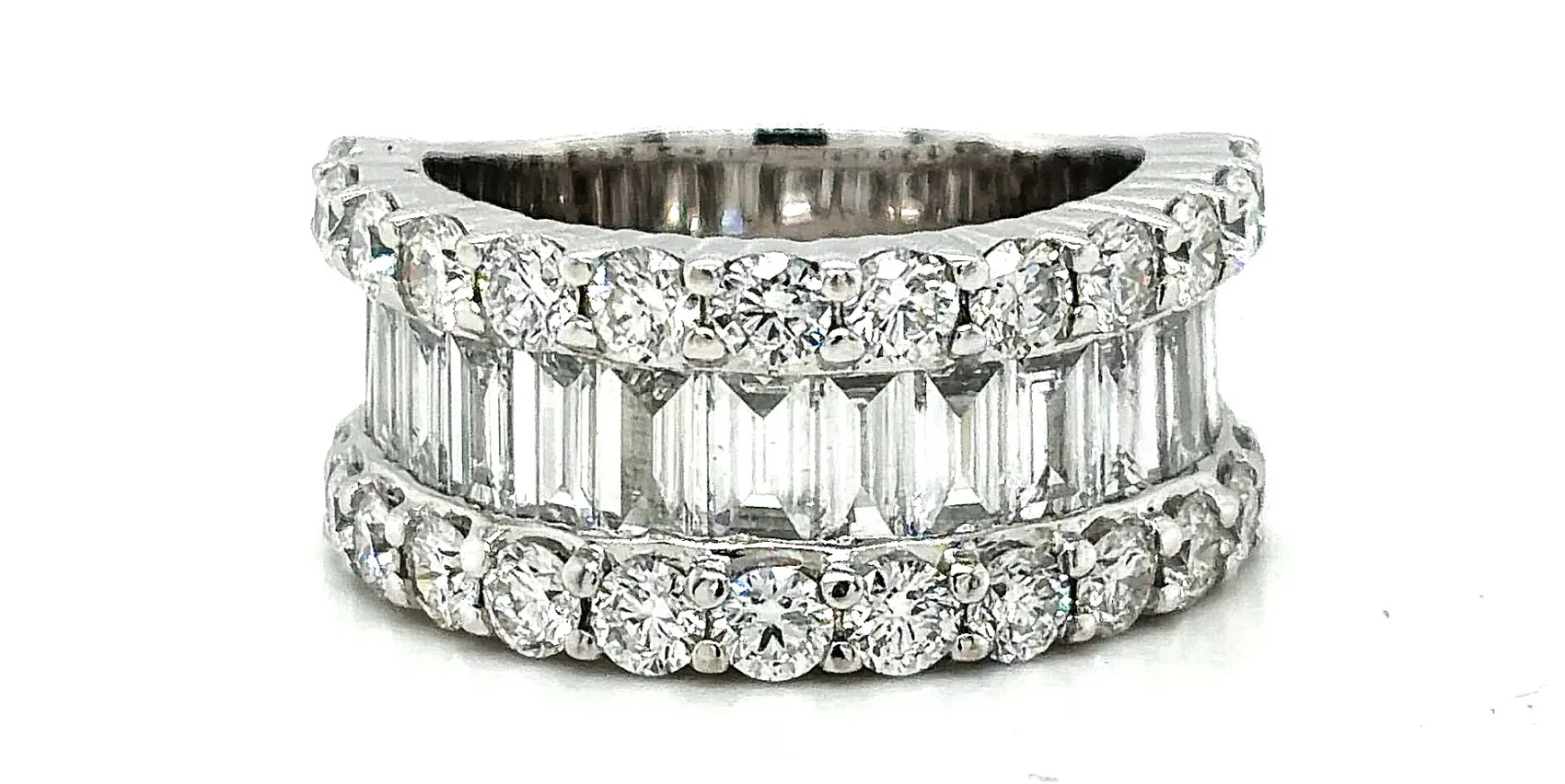 A statement of opulence and sophistication, this 4.16-carat diamond band is expertly crafted in 18-carat white gold. Featuring a striking three-tier design, the band maximises brilliance and sparkle from every angle, making it a truly exceptional piece of fine jewellery. With a total weight of 10.1 grams, the ring combines substantial presence with comfort, perfect for special occasions or as a luxurious everyday statement. Its timeless design ensures it will be treasured for generations. Details: