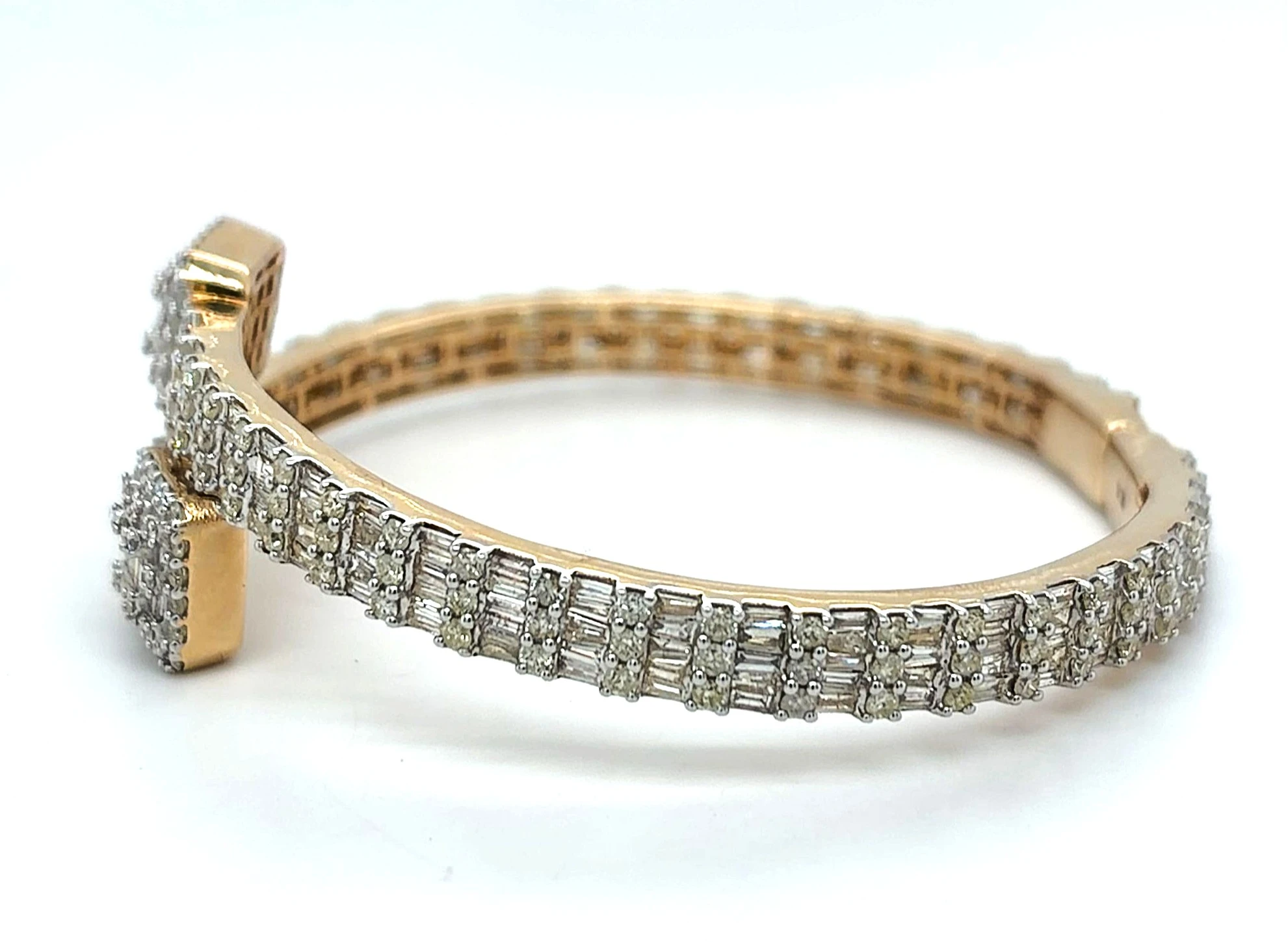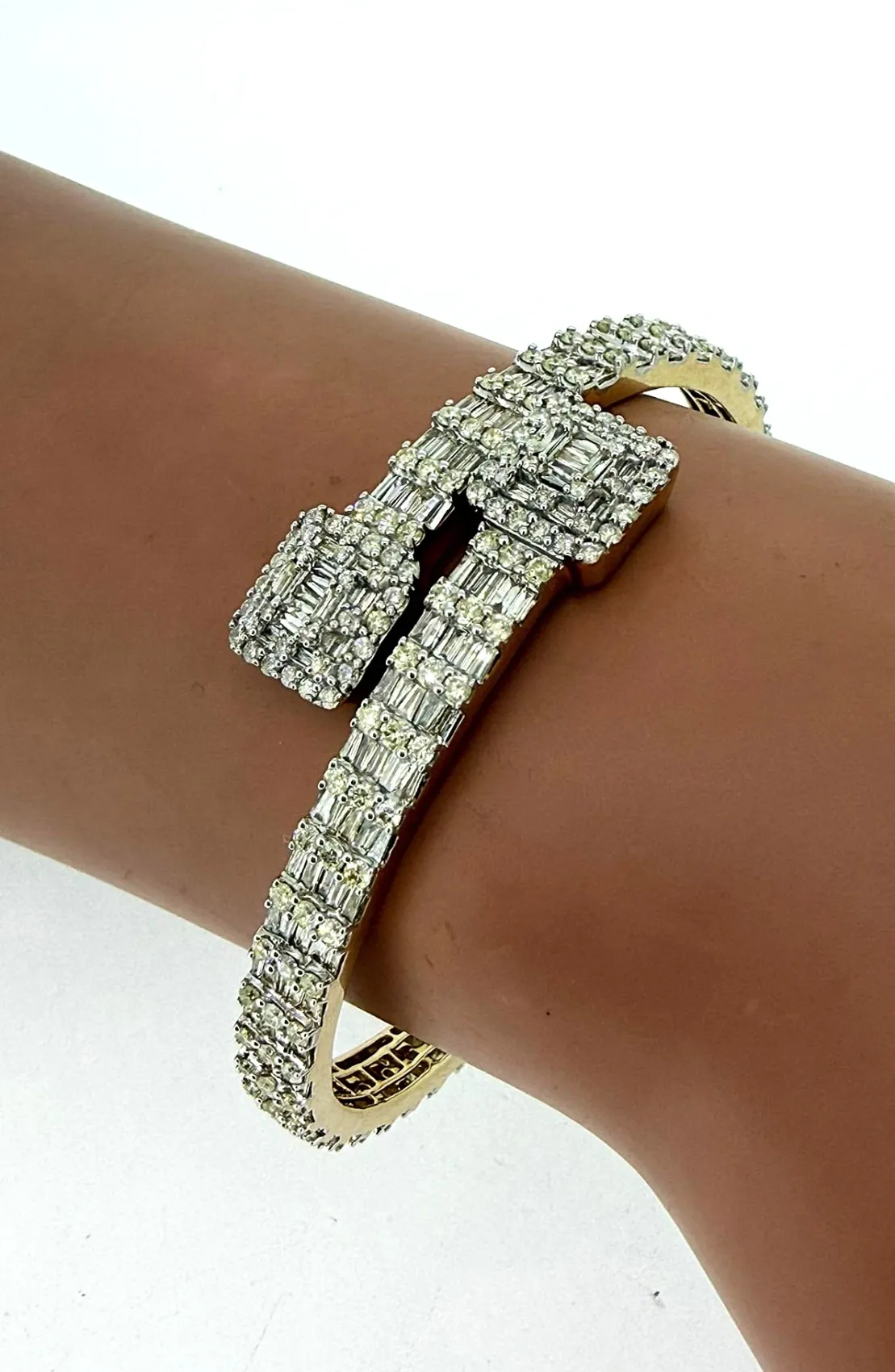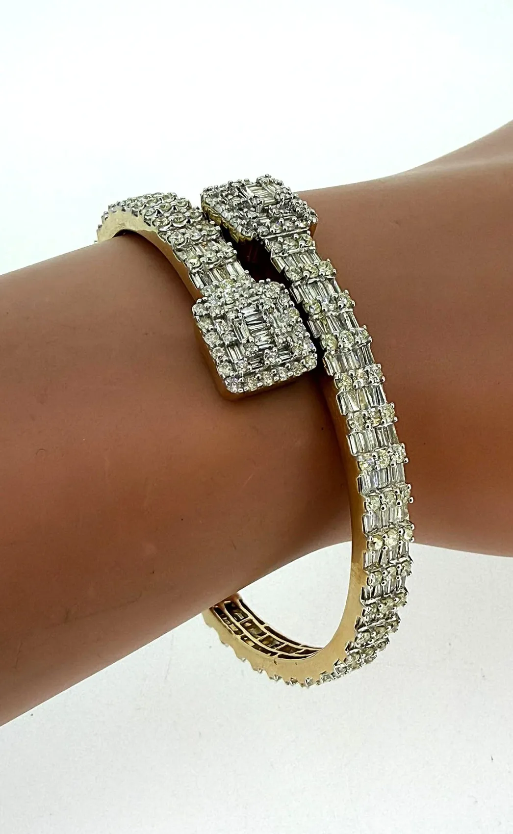 4.50ct Diamond & 14ct Gold Cross Over Bangle – 26.3g Make a bold and elegant statement with this cross over bangle featuring 4.50ct of brilliant-cut diamonds set in 14ct gold. Weighing 26.3g, this luxurious piece combines substantial presence with sophisticated design, perfect for special occasions or refined everyday wear. The sparkling diamonds are beautifully arranged along the crossover design, catching light from every angle and creating a dazzling effect. Expertly crafted in durable 14ct gold, this bangle offers both style and lasting quality, making it a timeless addition to any jewellery collection. Features: