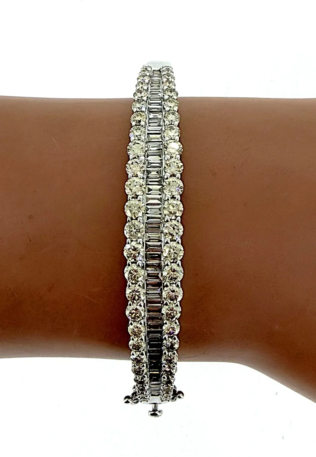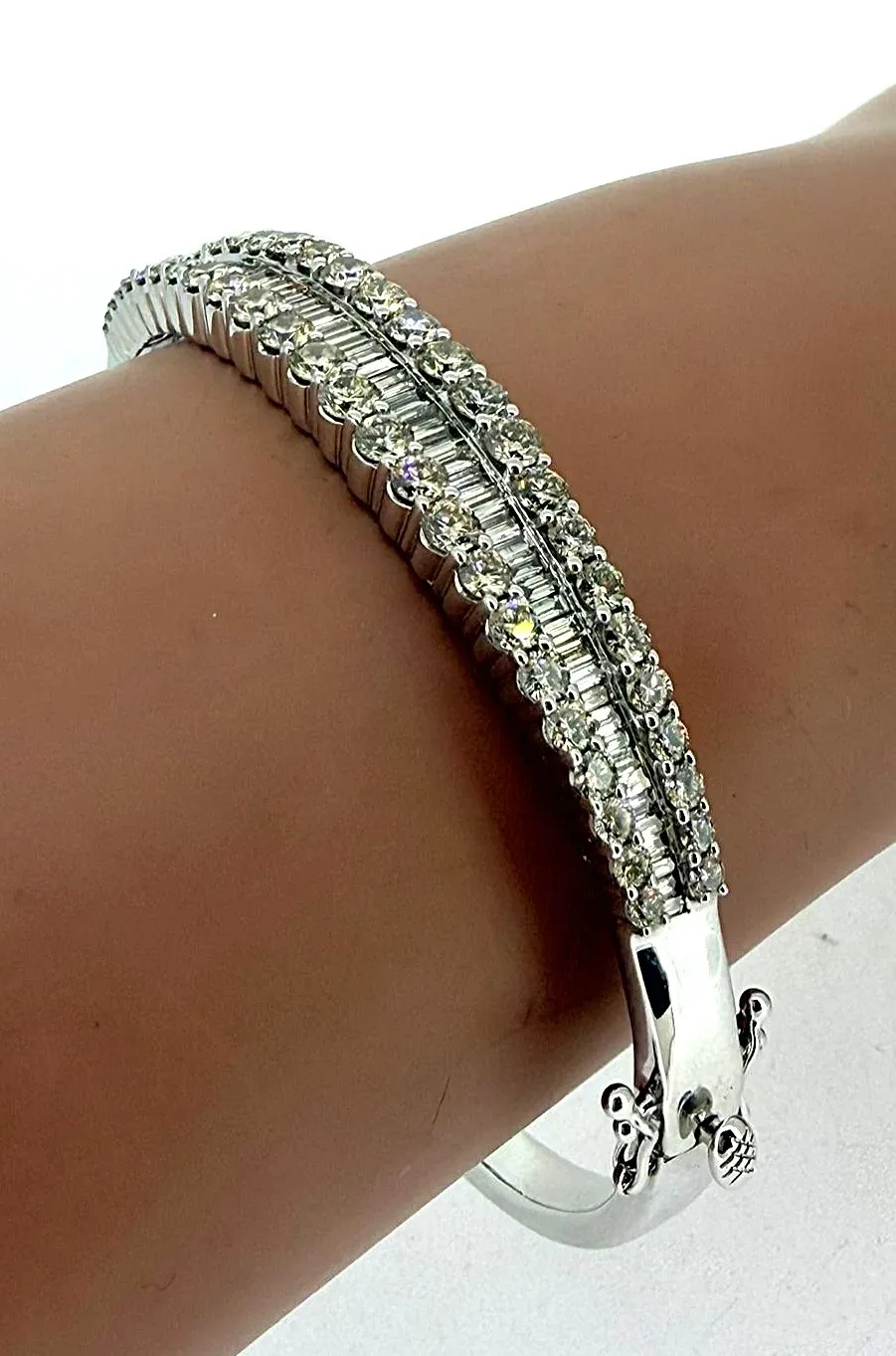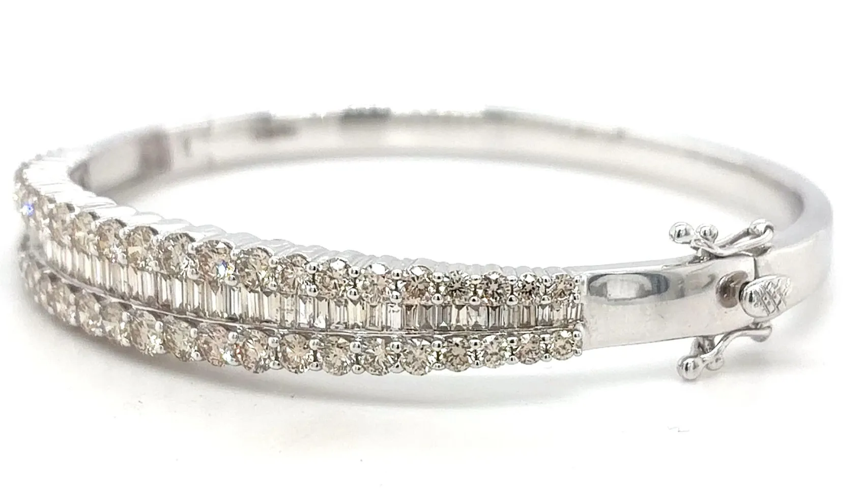 Make a bold statement of luxury with this stunning diamond bangle, crafted from 9ct white gold and featuring a total of 5.22 carats of diamonds. Each diamond is expertly set to maximise brilliance, ensuring a dazzling display from every angle. Weighing approximately 19.8 grams and measuring 7.5 inches, this bangle combines a substantial, high-quality feel with comfortable wear. Ideal for weddings, anniversaries, or as a statement piece, it embodies timeless elegance and sophisticated craftsmanship. Key Features: