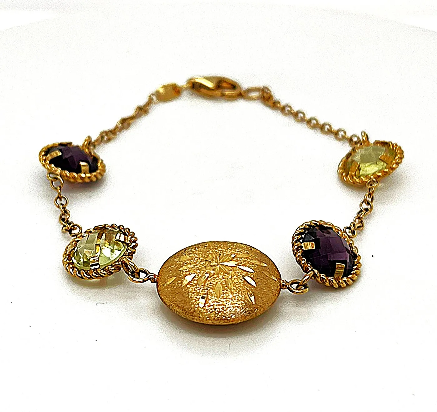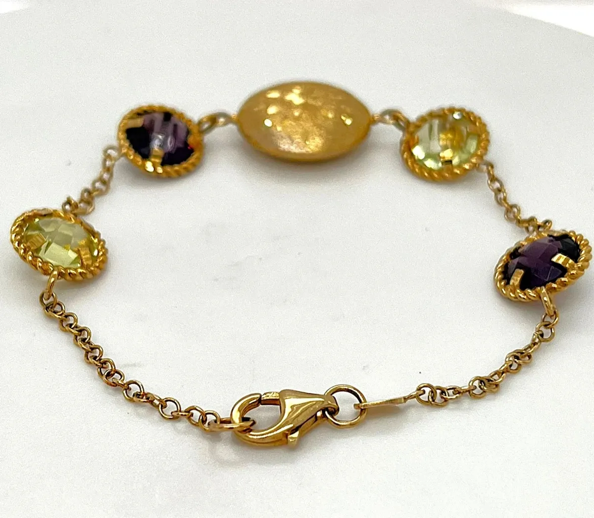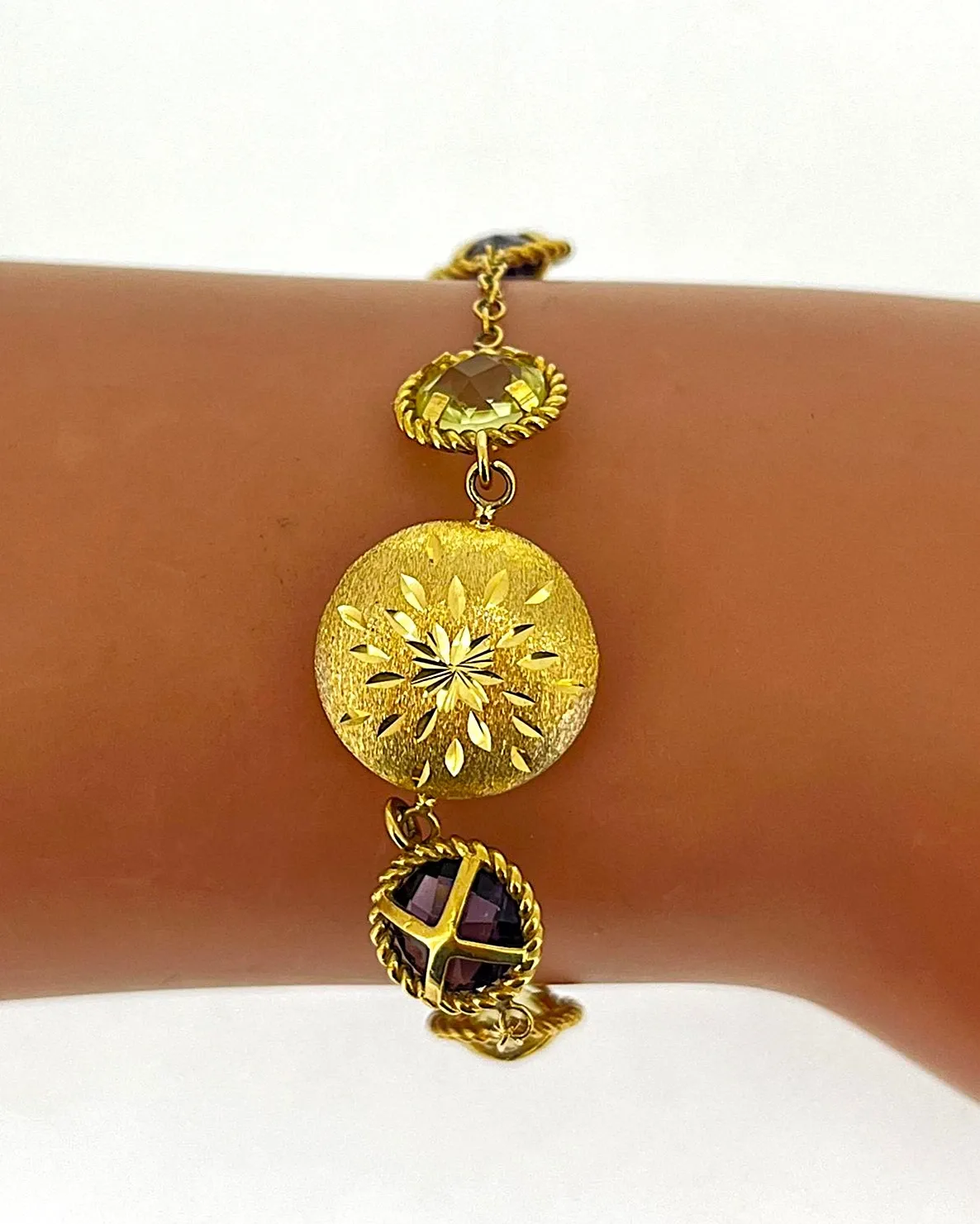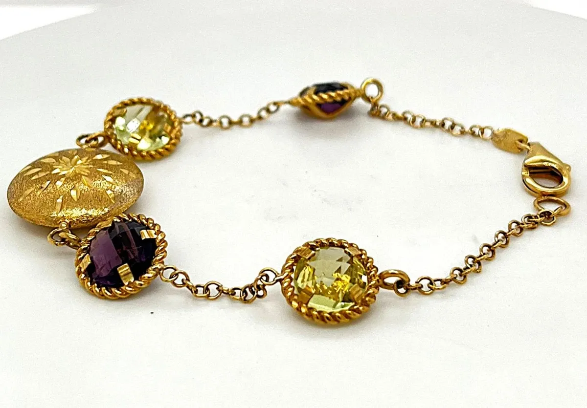 Add a burst of colour and elegance to any outfit with this stunning 9ct gold bracelet, featuring 8.00ct of vibrant citrine and amethyst gemstones. Weighing 7.5 grams and measuring 7.5 inches, it sits comfortably on the wrist while exuding a luxurious, sophisticated charm. The warm golden tones of the citrine harmonise beautifully with the rich purple hues of the amethyst, creating a vibrant contrast that catches the eye. Perfect for everyday elegance, special occasions, or as a thoughtful gift, this bracelet embodies timeless style and fine craftsmanship.