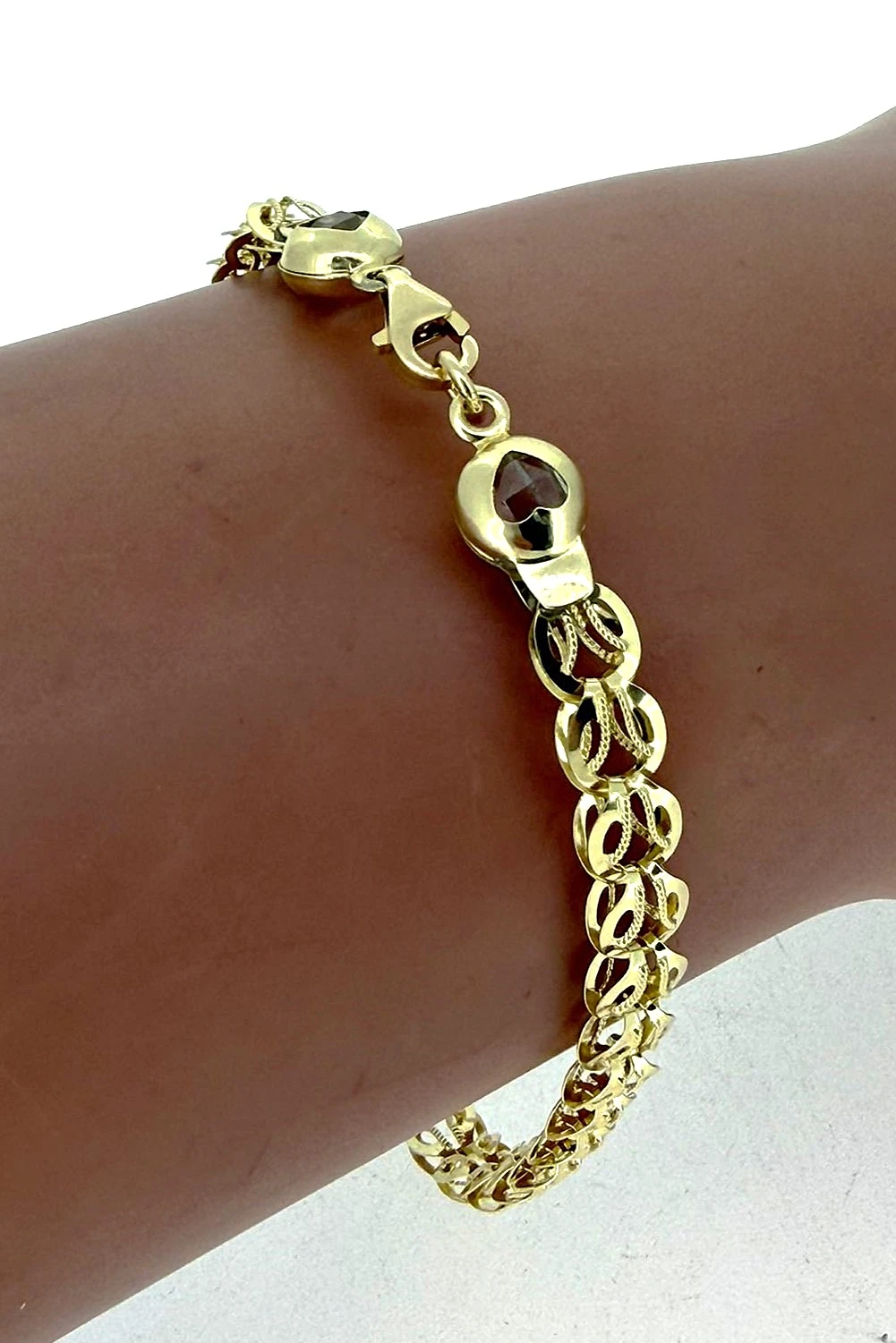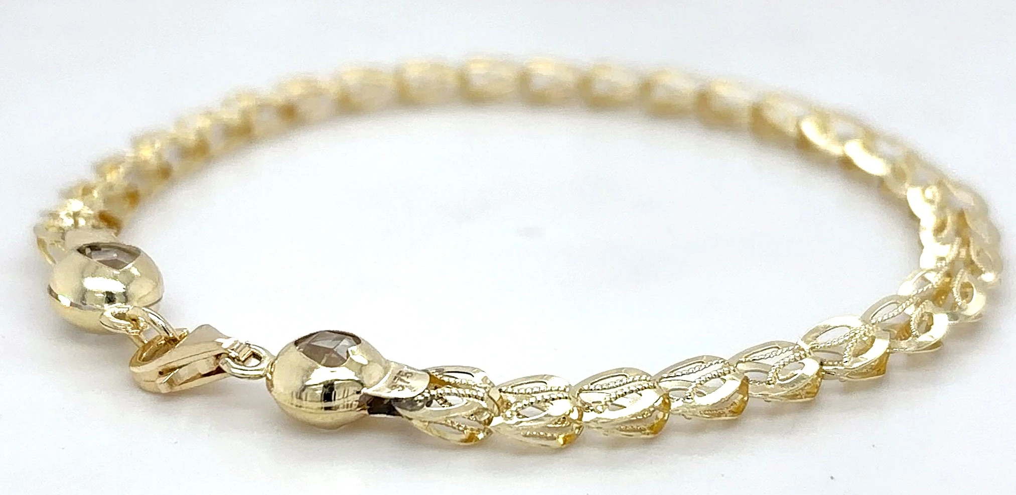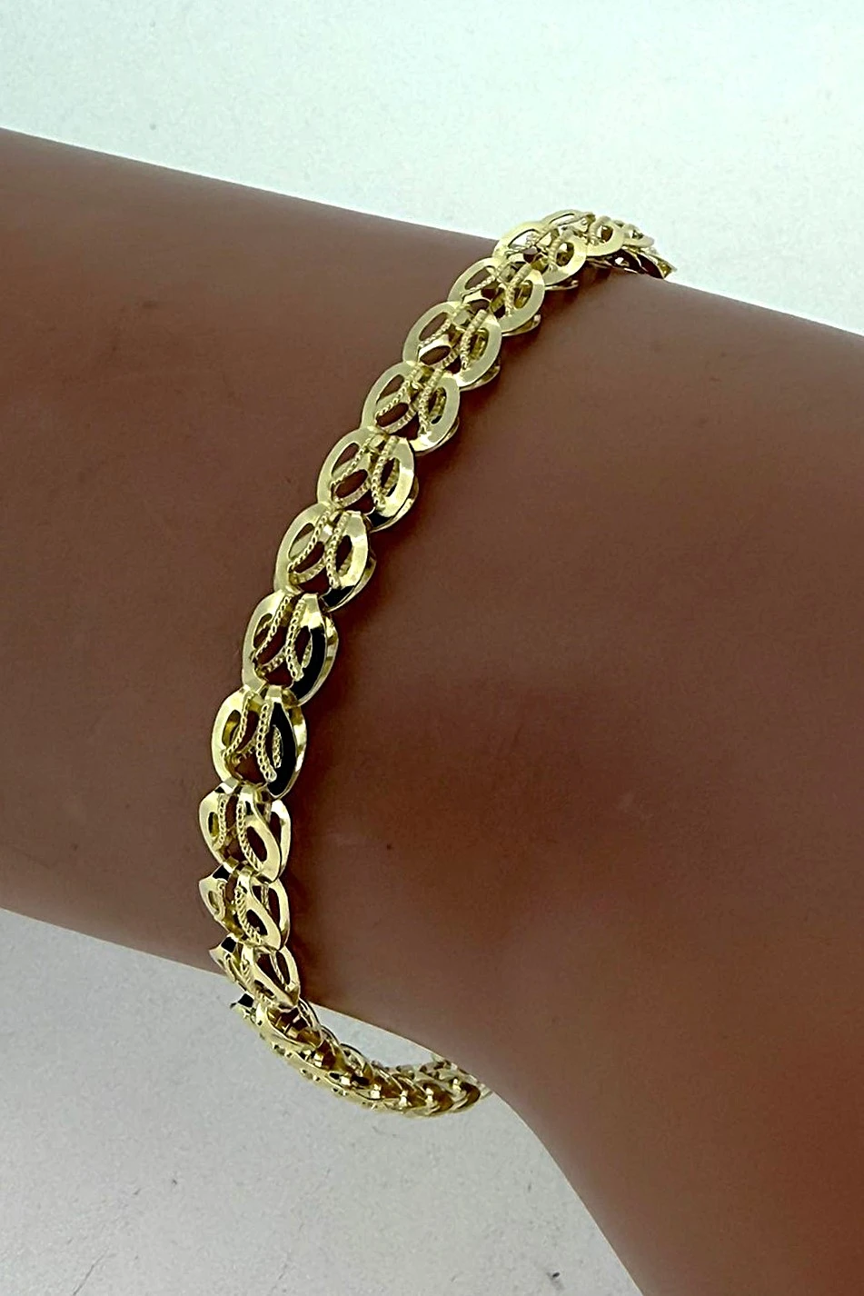 Add a touch of timeless elegance to your collection with this exquisite 9ct Gold Fancy Bracelet. Expertly crafted from solid 9 carat yellow gold, this piece showcases a 5.5mm wide intricate design that beautifully catches the light from every angle. Measuring 7.5 inches in length, it offers a comfortable and secure fit, making it perfect for everyday wear or special occasions. The bracelet fastens with a durable lobster clasp, ensuring both style and security. Whether worn alone for understated sophistication or layered with other gold pieces for a modern look, this bracelet is a versatile and luxurious addition to any jewellery box. Features: