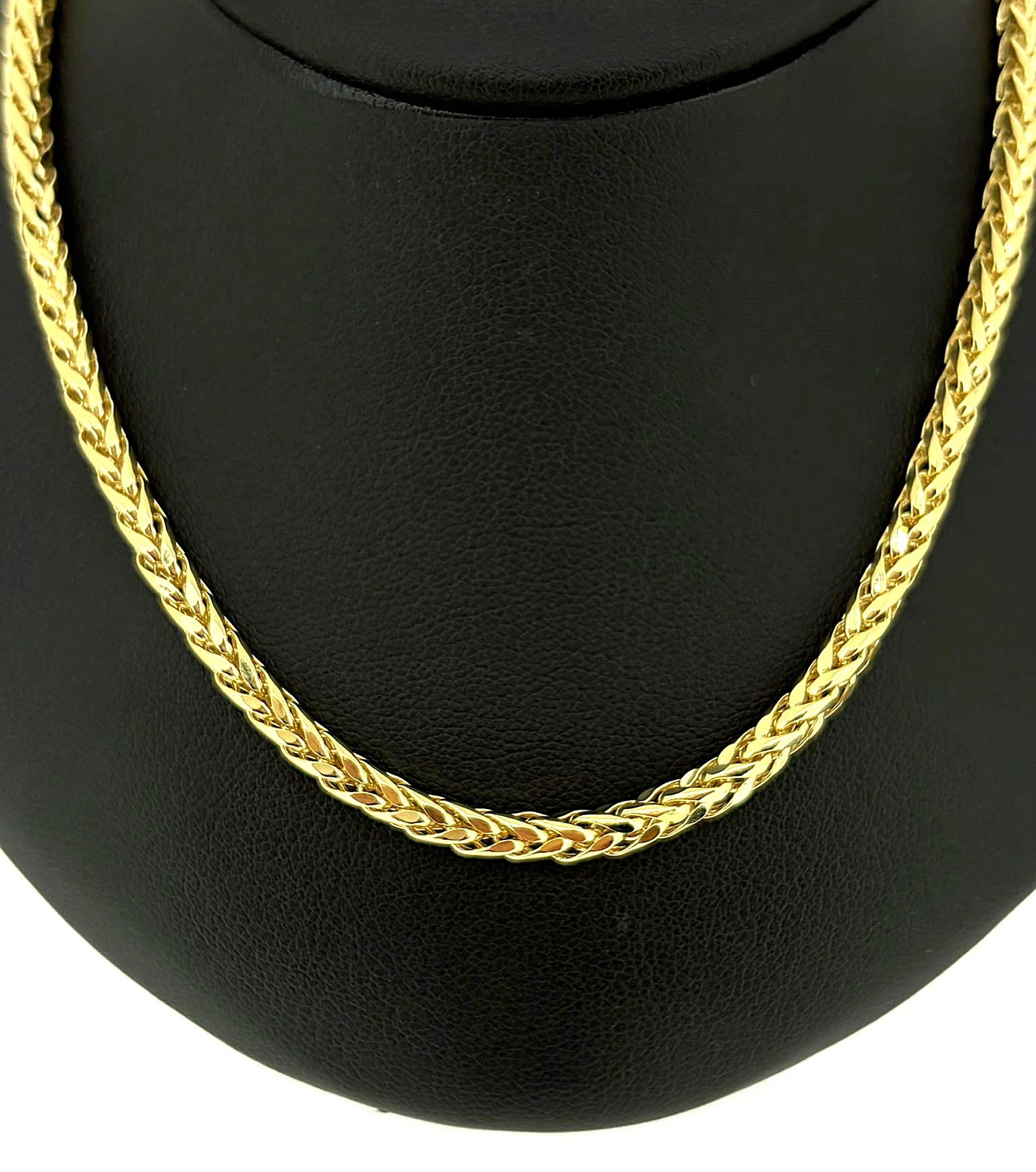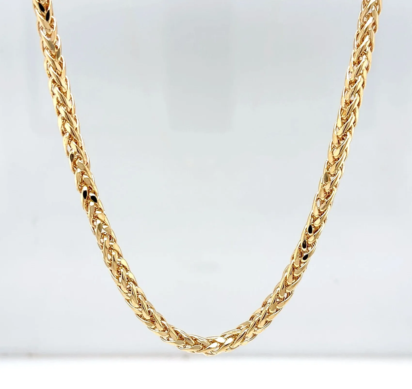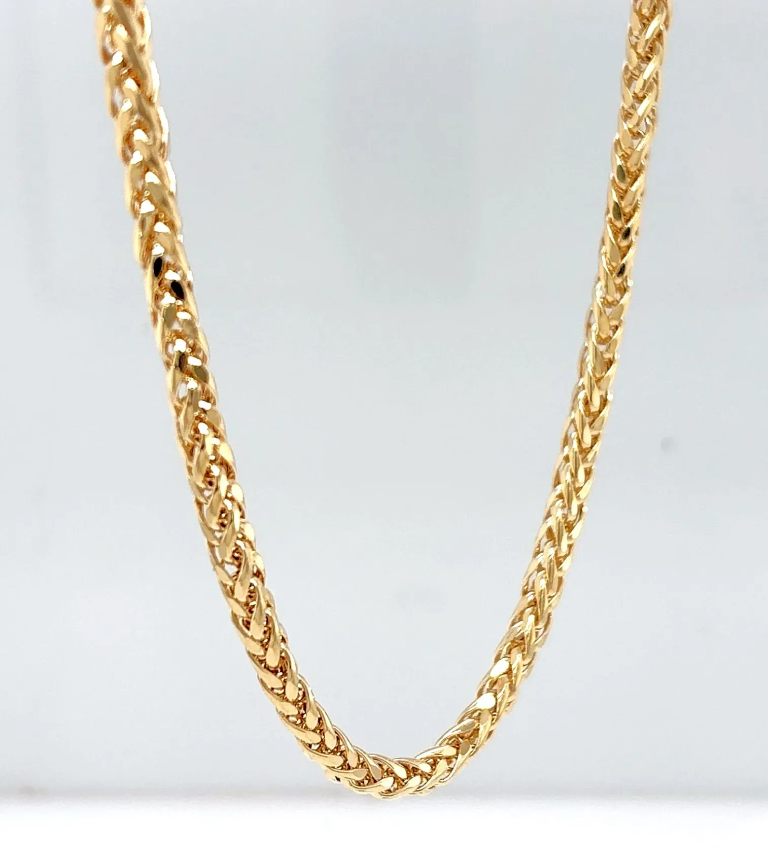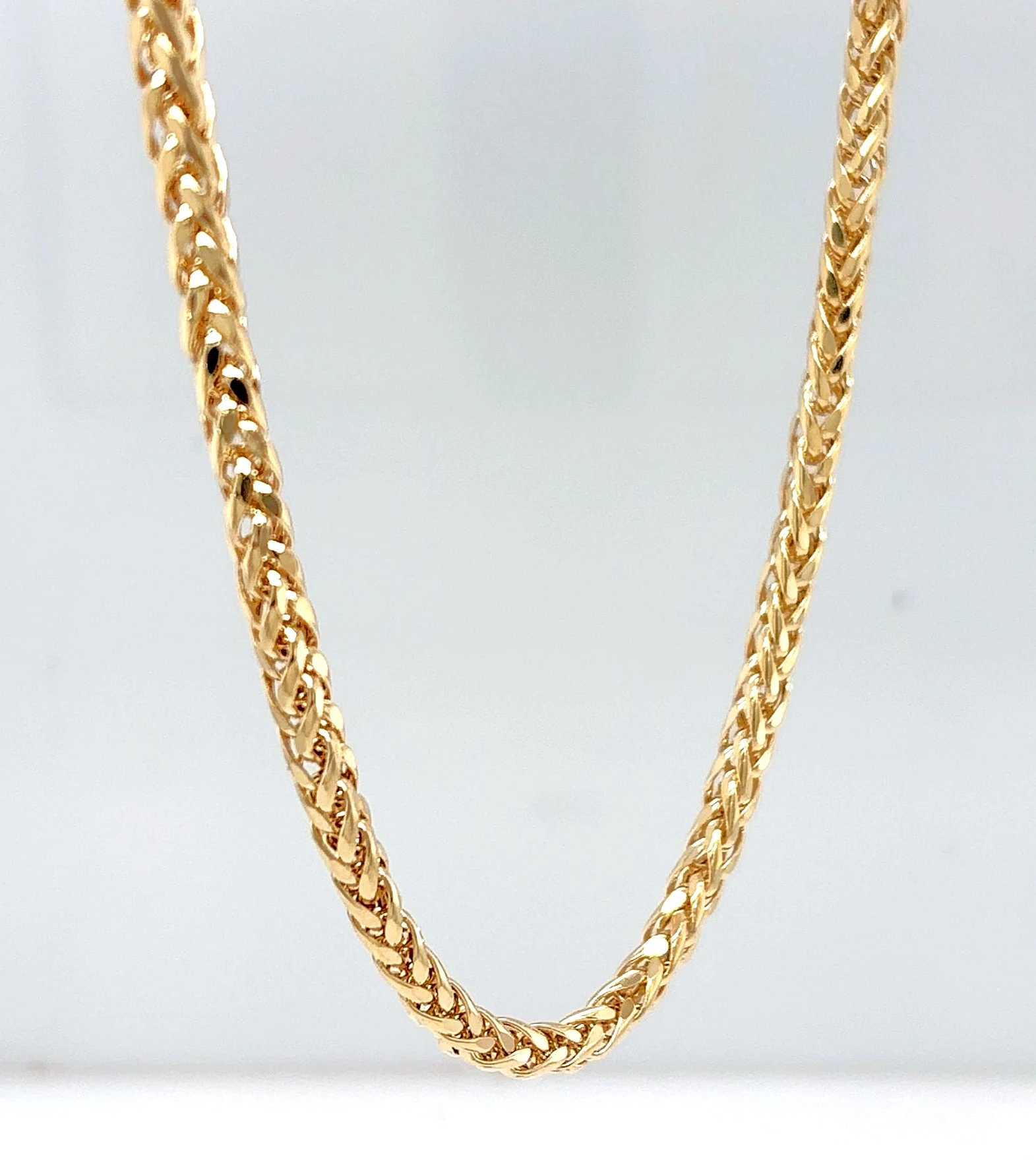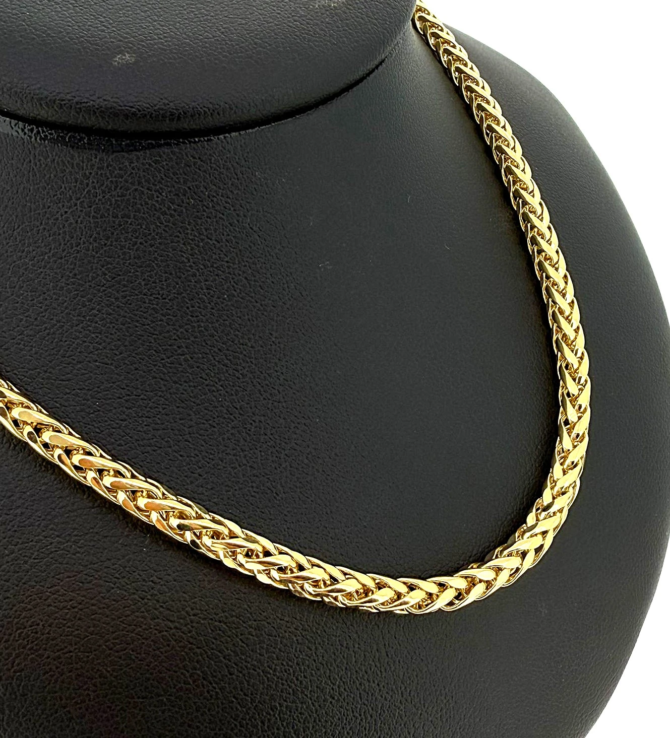 Add a bold and elegant touch to your jewellery collection with this 9ct Gold Fancy Spiga Chain. Crafted from solid 9 carat yellow gold, it features 3.3mm polished Spiga links that create a striking, textured finish that beautifully catches the light. Measuring 20 inches in length, this chain sits perfectly on the neckline, ideal for wearing alone or pairing with a pendant. The secure lobster clasp ensures reliability while maintaining a sleek and sophisticated look. Features: