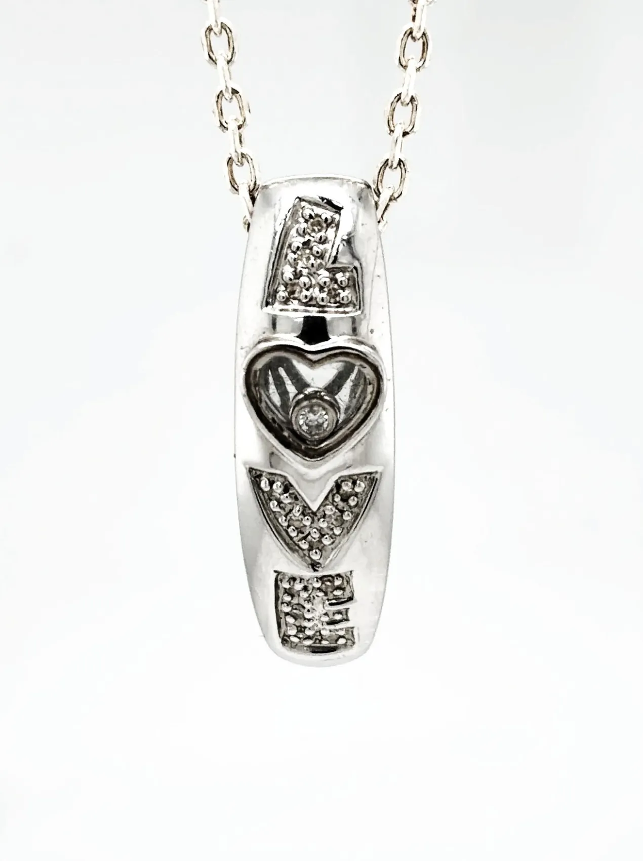 Modern and meaningful, this 9ct white gold LOVE pendant is set with 0.10ct of sparkling diamonds, adding brilliance to its romantic design. The beautifully crafted “LOVE” motif symbolises affection and connection, making it a thoughtful and stylish jewellery piece. Measuring 27 x 8.0 x 7.1mm and weighing 3.95 grams, the pendant has a substantial yet wearable feel. The cool tone of white gold enhances the diamond sparkle, creating a contemporary and elegant finish suitable for everyday wear or special occasions. A timeless gift choice for anniversaries, birthdays, or as a meaningful token of love.