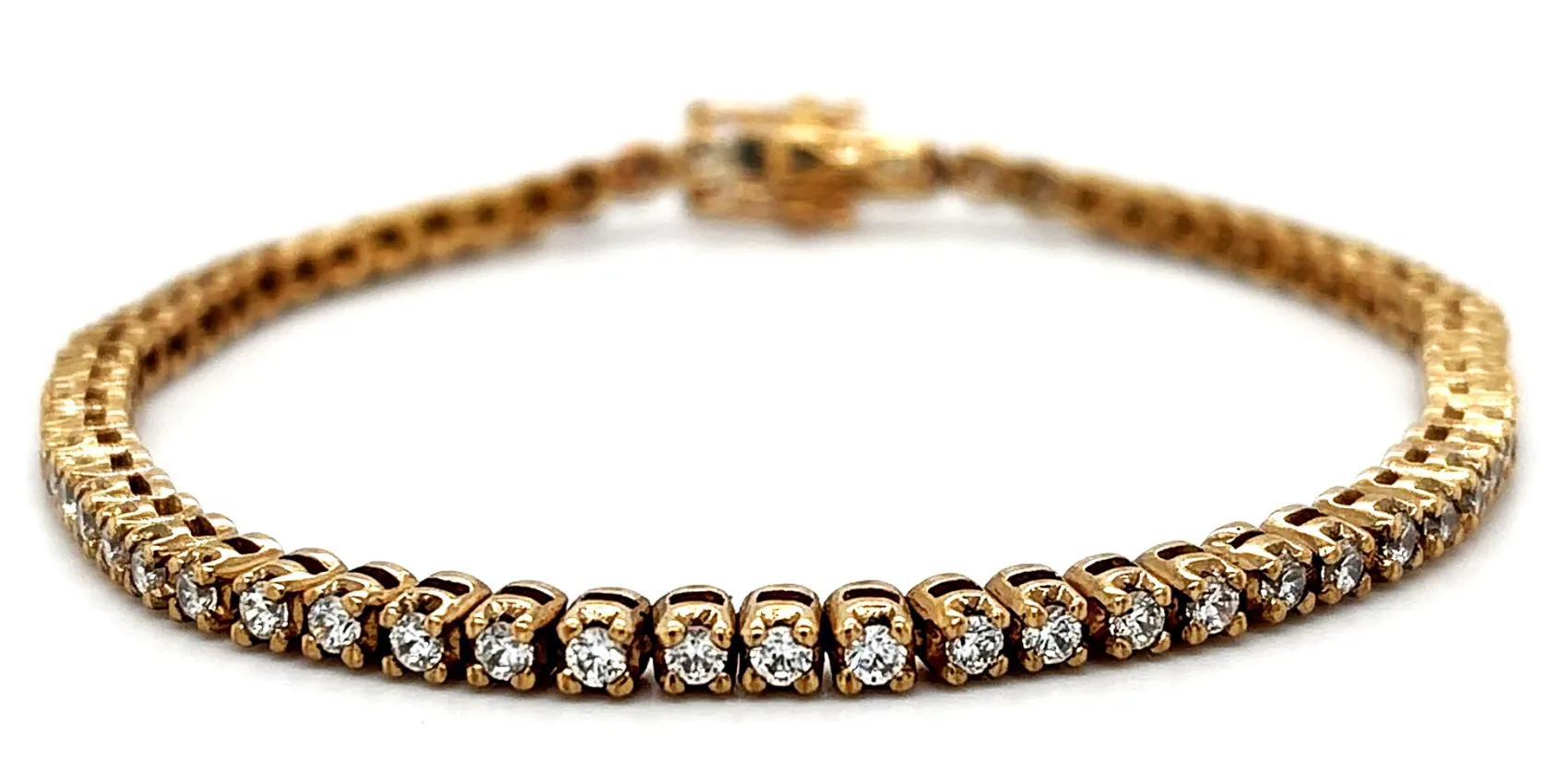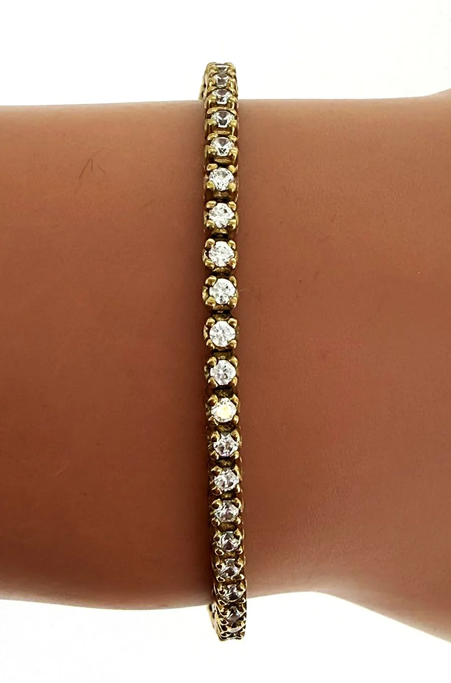 Elegant, timeless, and effortlessly wearable, this 9ct gold tennis bracelet is set with sparkling cubic zirconia stones in a classic 2.9mm design. The refined row of stones creates continuous brilliance around the wrist, offering the look of diamonds with everyday practicality. Measuring 7.5 inches in length and weighing 9.3 grams, the bracelet provides a comfortable yet substantial feel. The warm tone of 9ct gold enhances the brilliance of the stones, making it perfect for both daily wear and special occasions. A versatile addition to any jewellery collection, this gold tennis bracelet is ideal as a gift, anniversary piece, or elegant finishing touch to formal attire