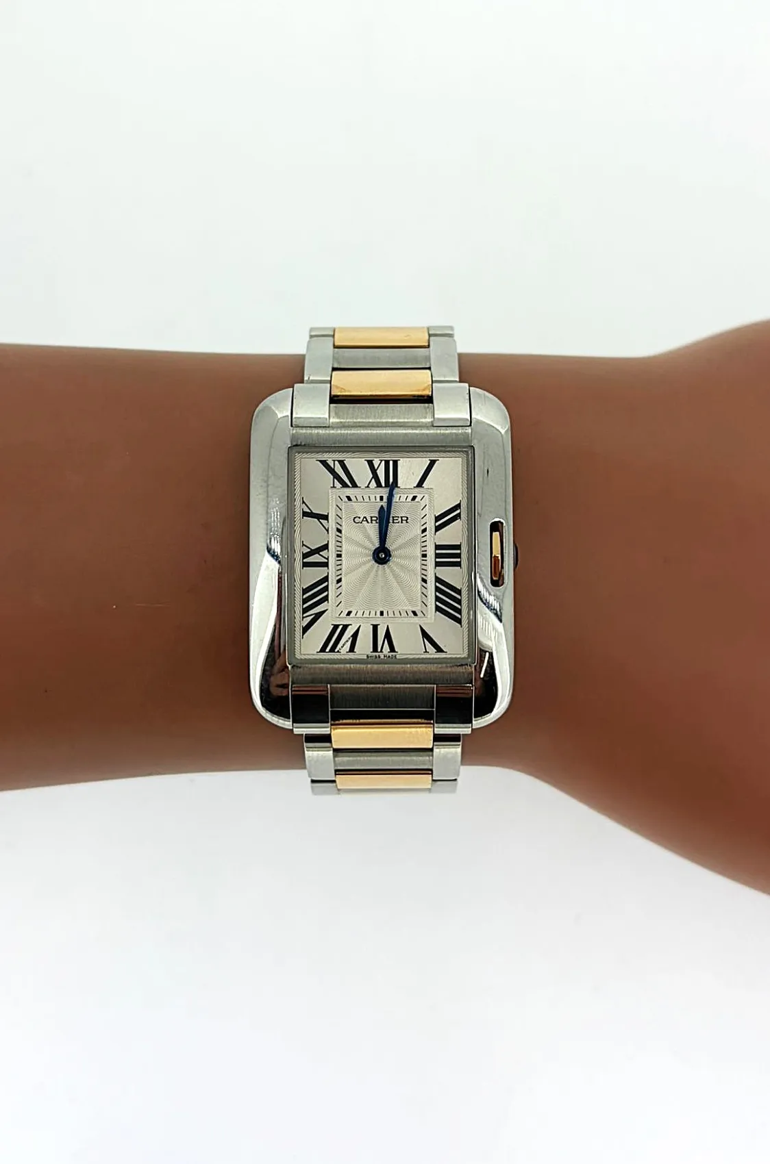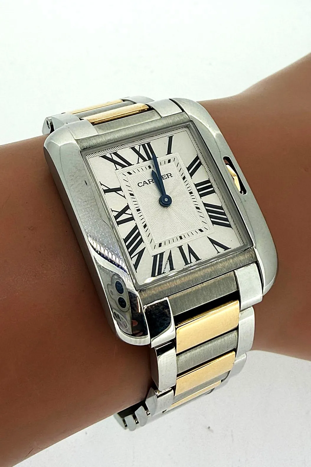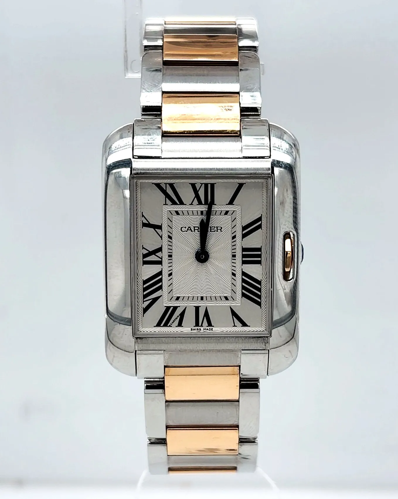 A luxurious and timeless piece from Cartier Tank Anglaise, this 27mm watch (Ref. 3704) combines the elegance of 18ct gold with the durability of stainless steel for a sophisticated bi-metallic look. The Anglaise’s signature integrated crown design is seamlessly set into the case, giving the watch its iconic architectural style. Featuring a silvered dial with Roman numerals, blued steel hands, and sapphire cabochon crown, this 2016 model exudes Cartier’s signature refinement. Supplied complete with original box and papers, it offers both authenticity and collectability for discerning buyers. Ideal for formal occasions or daily wear, the Cartier Tank Anglaise 27mm in gold and steel is a statement of luxury, heritage, and enduring style