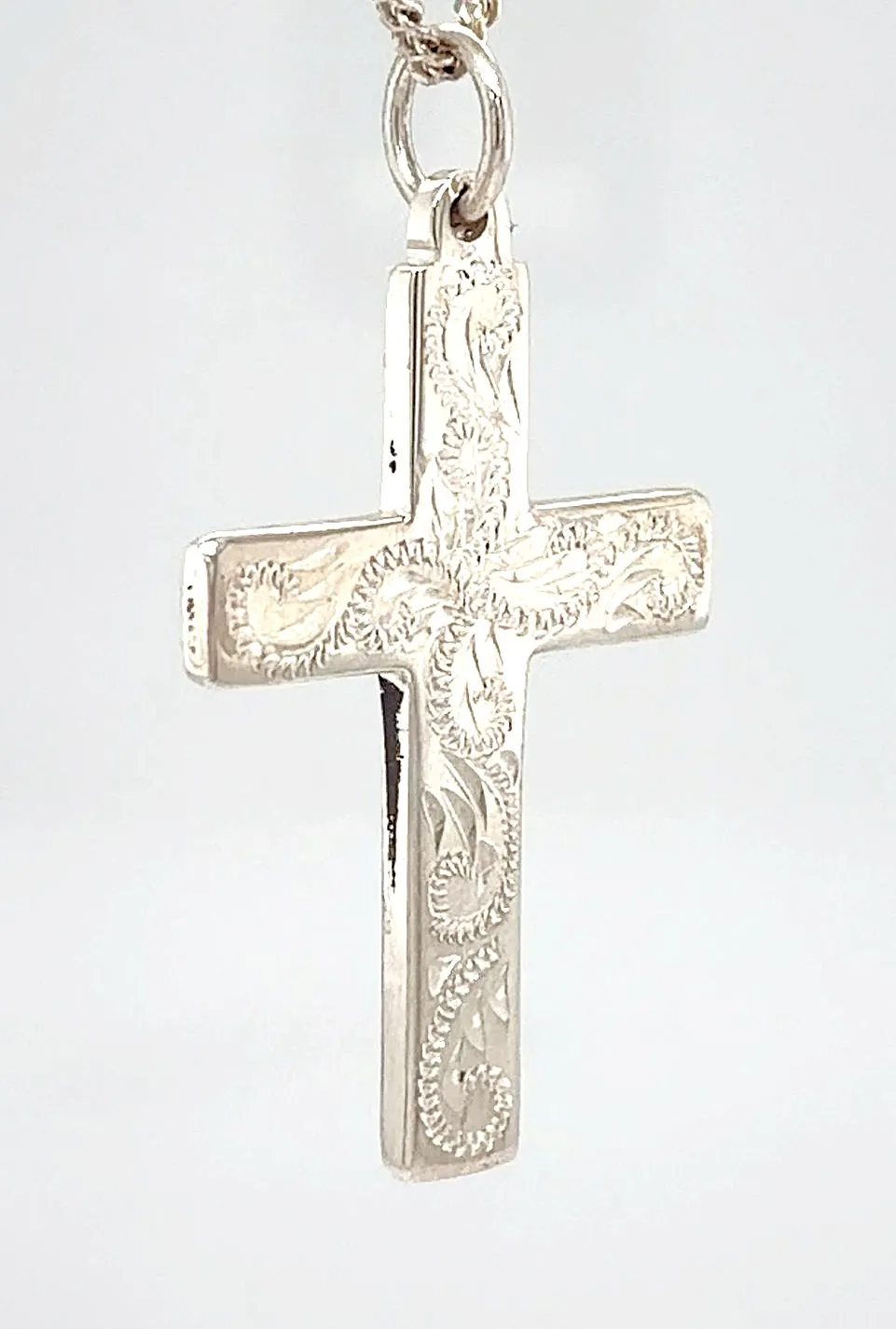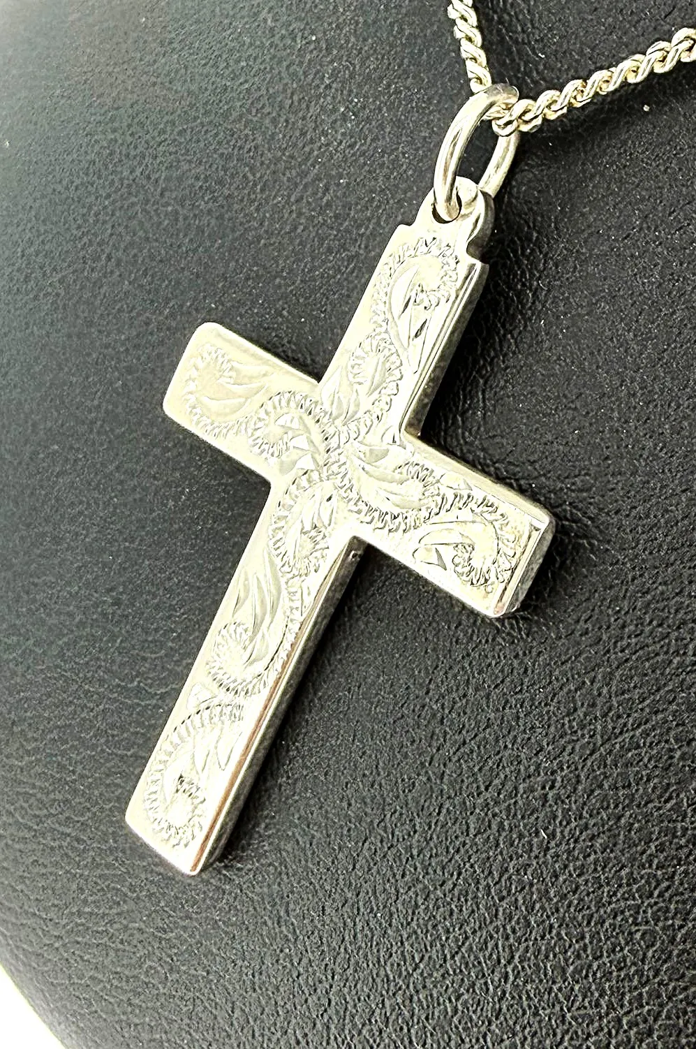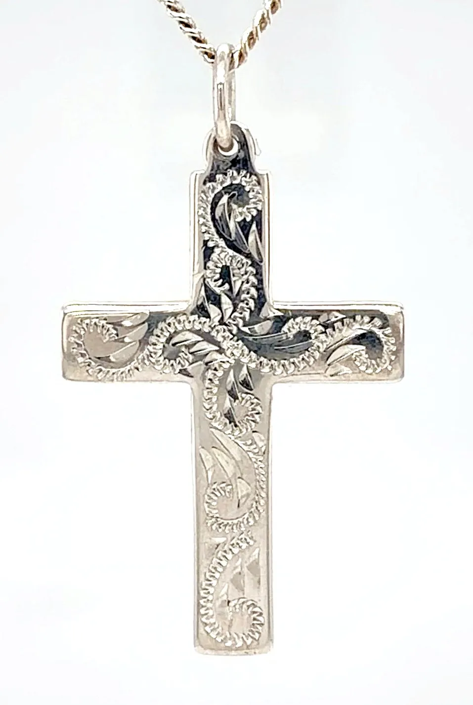 Elegant and meaningful, this hand-engraved sterling silver cross pendant combines craftsmanship with timeless style. The intricate engraving adds depth and character to a classic cross design, making it a distinctive accessory for everyday wear or special occasions. Crafted from high-quality 925 sterling silver, the pendant weighs 5.2 grams and measures 35mm x 25mm x 2.0mm, offering a comfortable and durable design. Its polished finish highlights the hand-engraved details, making it a thoughtful keepsake or gift. Perfect for christenings, confirmations, birthdays, or as a personal expression of faith, this cross pendant blends elegance with symbolism.