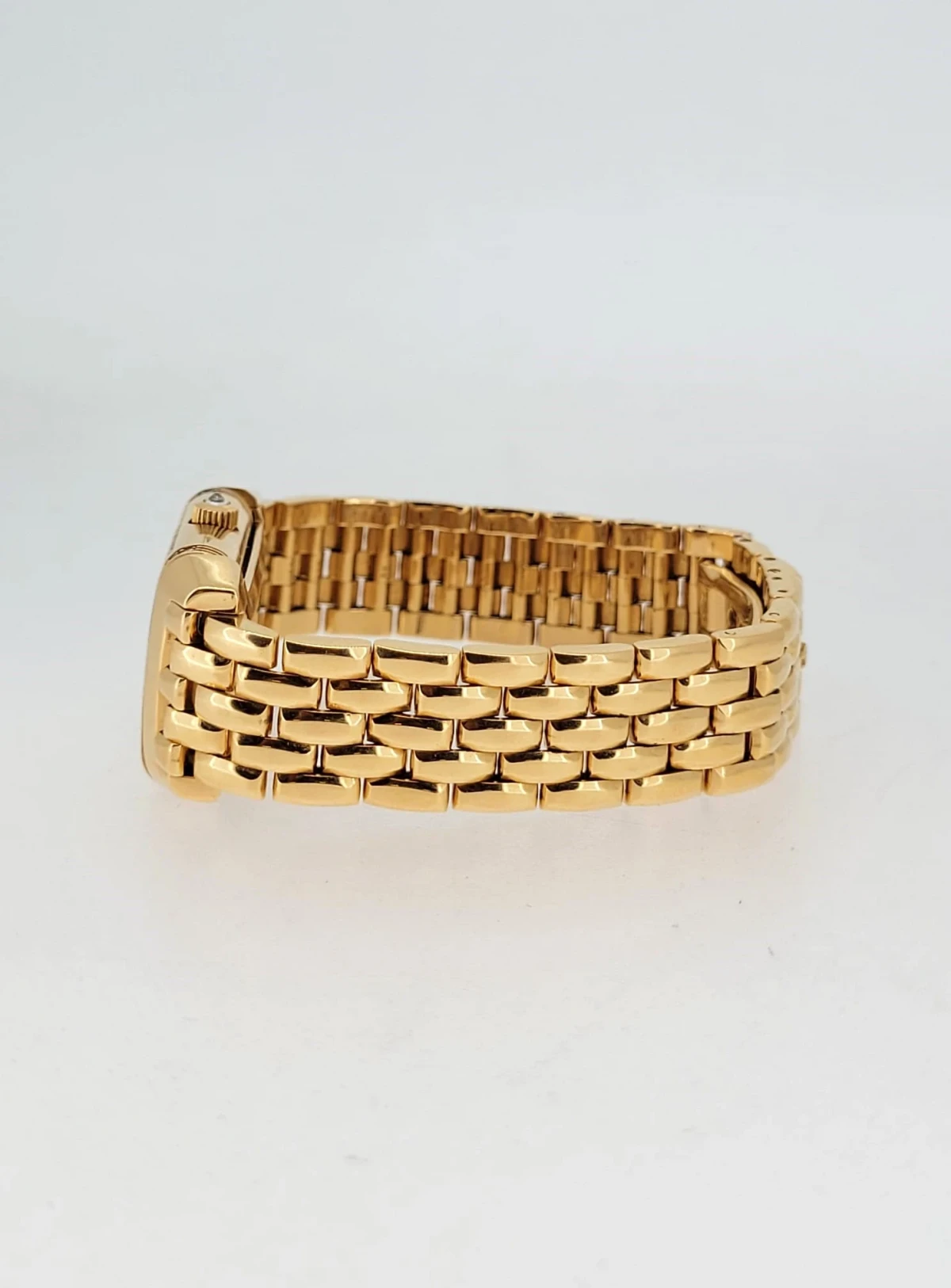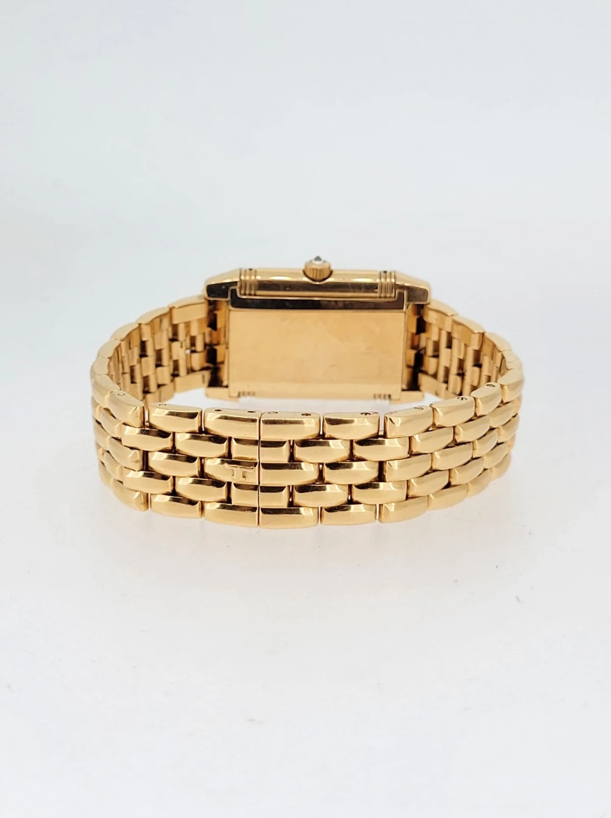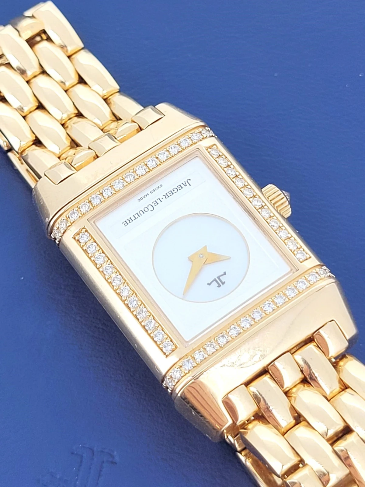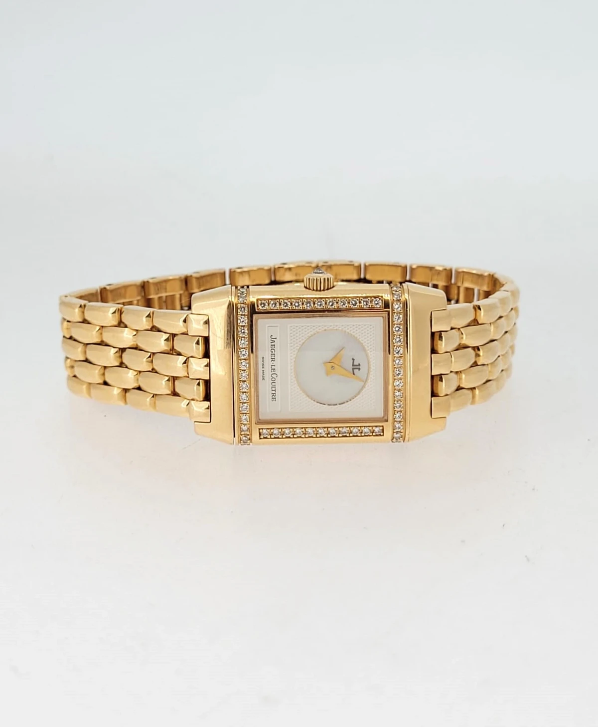 Crafted in luxurious 18ct rose gold, the rectangular Art Deco-inspired case is framed with brilliant-cut diamonds, adding a refined touch of sparkle. True to the spirit of the Reverso, this model features a double-faced dial – one side offering a classic, understated display for daytime wear, while the reverse reveals a more decorative, diamond-accented dial for evening elegance.