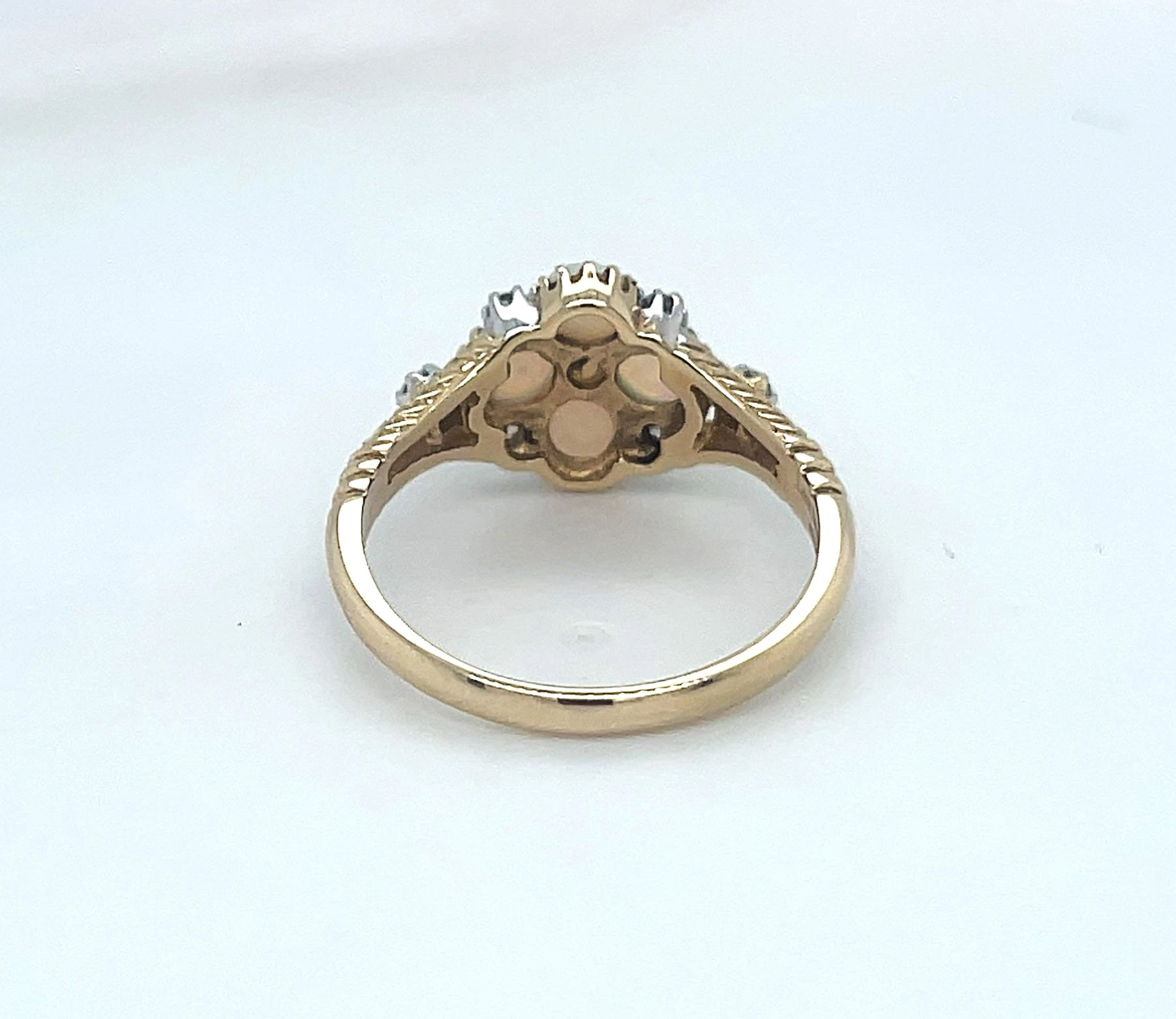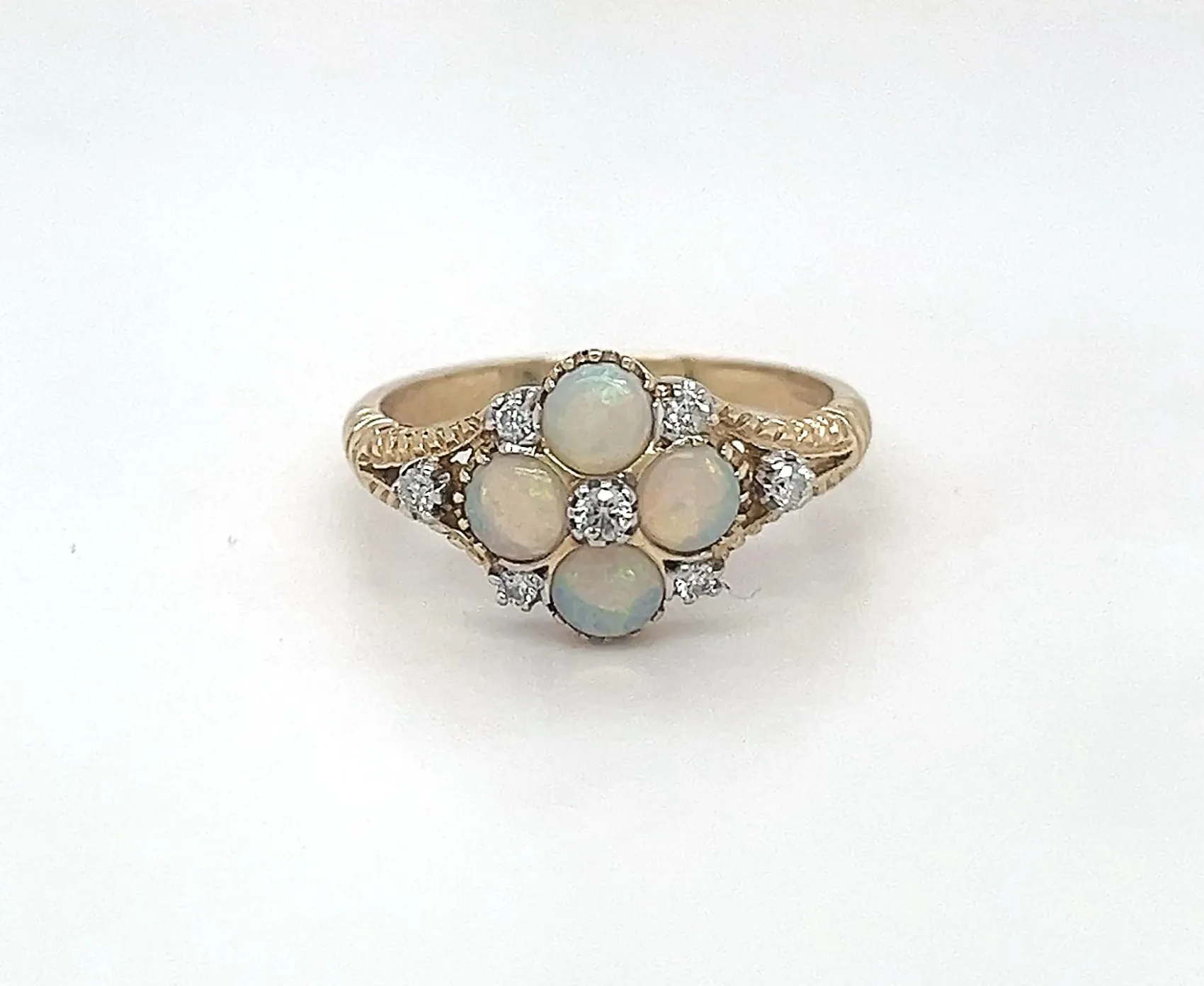 Opal & 0.10ct Diamond Dress Ring – 9ct Gold, 2.5g Add a touch of elegance to any outfit with this stunning dress ring, featuring a luminous opal centre stone accented by 0.10ct of sparkling diamonds. Crafted in 9ct gold, the ring combines the soft glow of the opal with the brilliance of the diamonds, creating a sophisticated and timeless piece. Weighing 2.5 grams, this ring is lightweight and comfortable, perfect for daily wear or special occasions. The polished gold setting enhances the play-of-colour in the opal, making it a truly eye-catching addition to your jewellery collection. Details:
