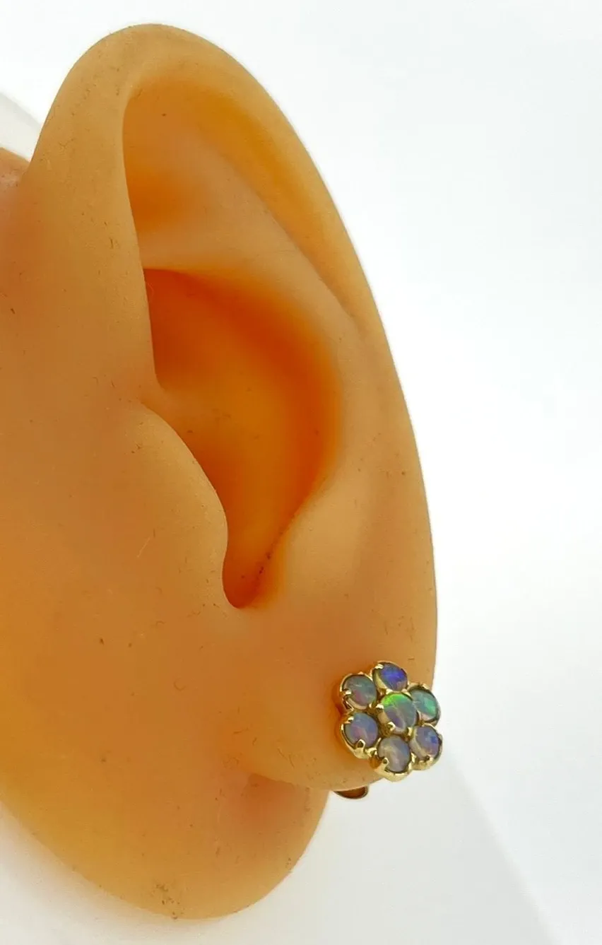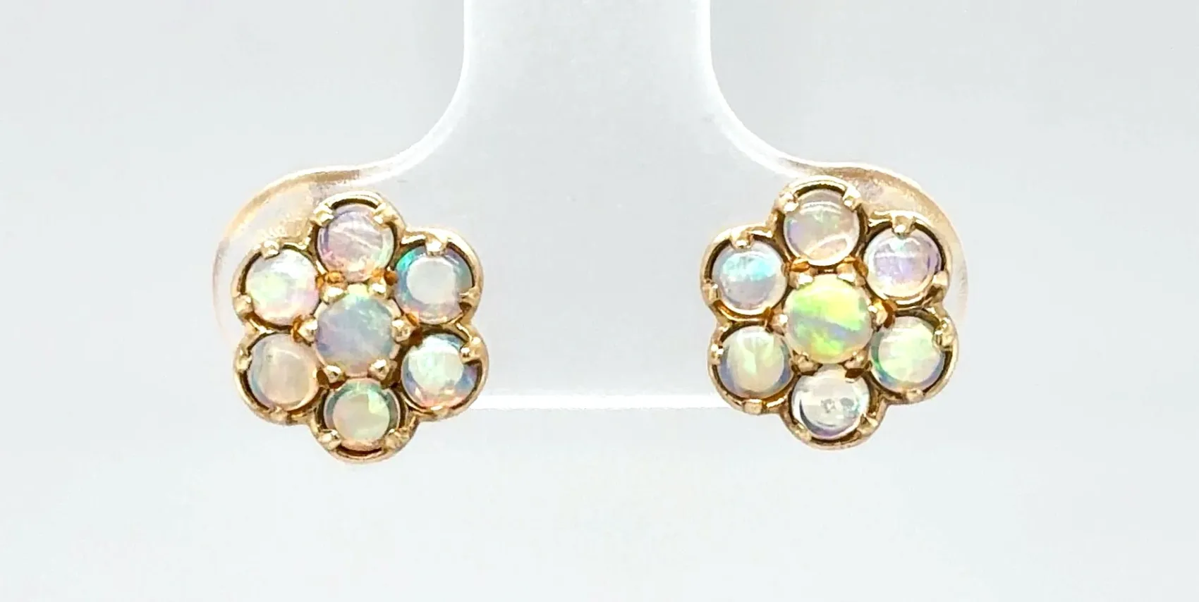 Delicately crafted in 9ct gold, these charming cluster stud earrings feature luminous opal gemstones that catch the light with every movement. The cluster design enhances the opals’ natural fire, creating a subtle yet captivating sparkle. Weighing just 1.4 grams, these earrings are lightweight and comfortable for everyday wear, while their classic design ensures they remain a timeless addition to any jewellery collection. Perfect for gifting or adding a touch of elegance to your own ensemble, these opal cluster studs combine sophistication with enduring style.