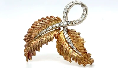 1.00ct Natural Diamond & 18ct Gold Vintage Double Leaf Brooch 11.1g (45.8mm x 42.5mm)
