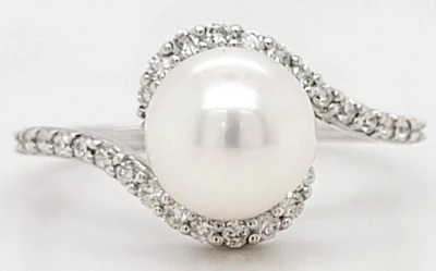 Pearl & 0.25ct Diamond Swirl Ring -18ct White Gold 2.7g