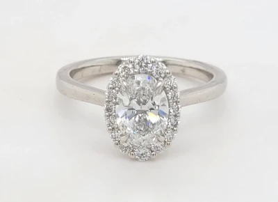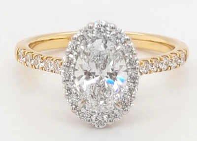 1.46ct Lab Grown Oval Diamond & 18ct Gold Halo Solitaire Ring 3.9g