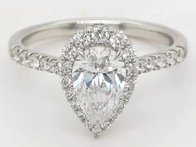 1.46ct Lab Grown Pear cut Diamond & Platinum Halo Solitaire Ring 5.3g
