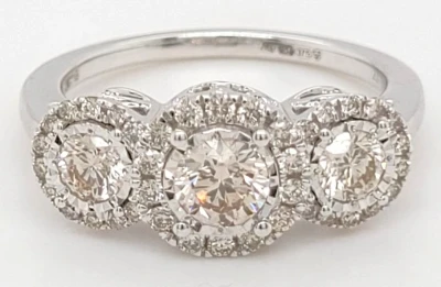 1.05ct Diamond & 9ct White Gold Halo/Trilogy Ring 3.6g N
