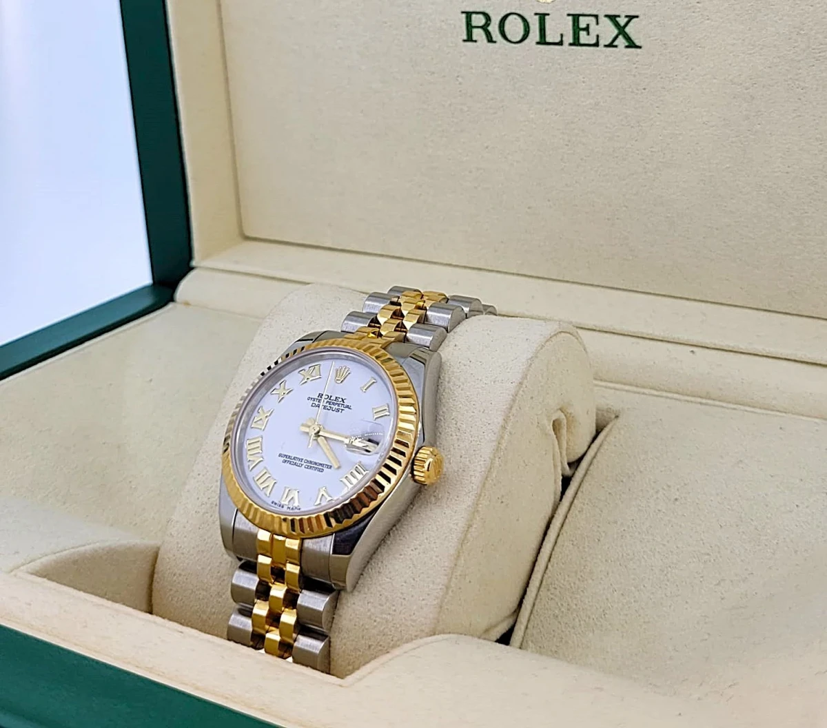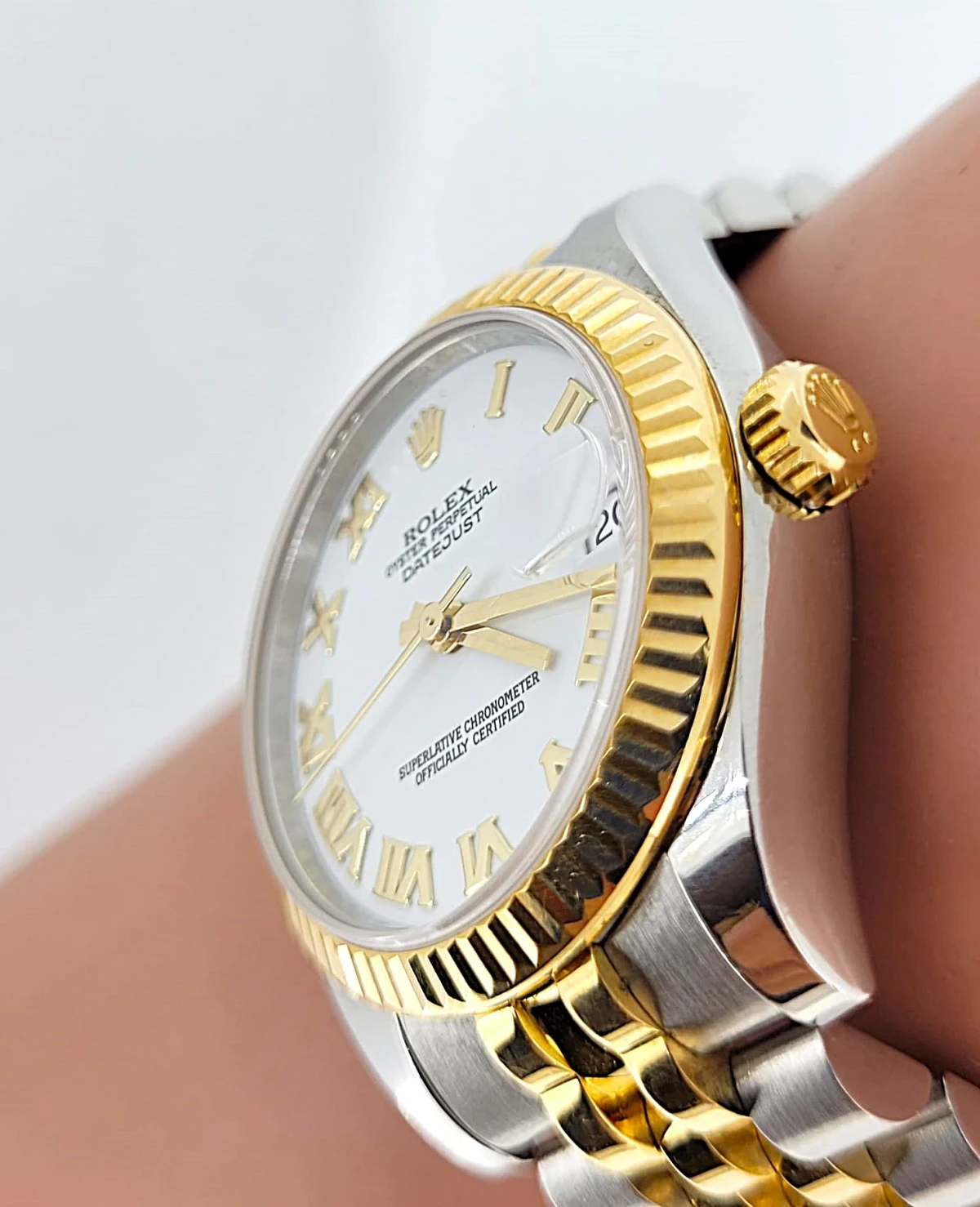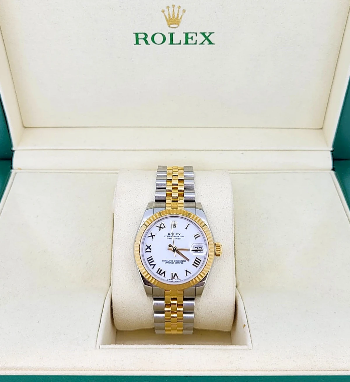 A timeless classic from Rolex, this Datejust 31mm blends refined elegance with everyday versatility. Crafted in a harmonious combination of 18ct yellow gold and stainless steel (Rolesor), this reference 178273 showcases Rolex’s signature balance of luxury and durability. The watch features a 31mm Oyster case, fitted with a distinctive fluted 18ct gold bezel and a striking white dial with baton hour markers. Its automatic self-winding movement ensures precision and reliability, while the date display at 3 o’clock, magnified by the iconic Cyclops lens, offers practical functionality. Completing the design is the sophisticated two-tone Jubilee bracelet, providing both comfort and an unmistakably classic aesthetic. This particular piece was first sold in 2014 and comes complete with its original Rolex box and papers, ensuring authenticity and collectability. Key Features: