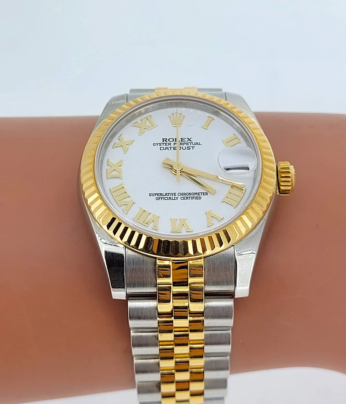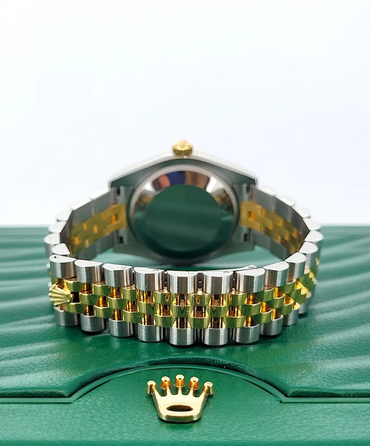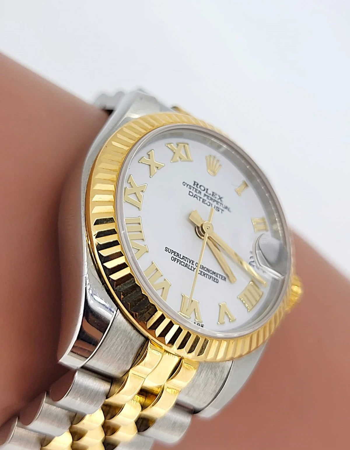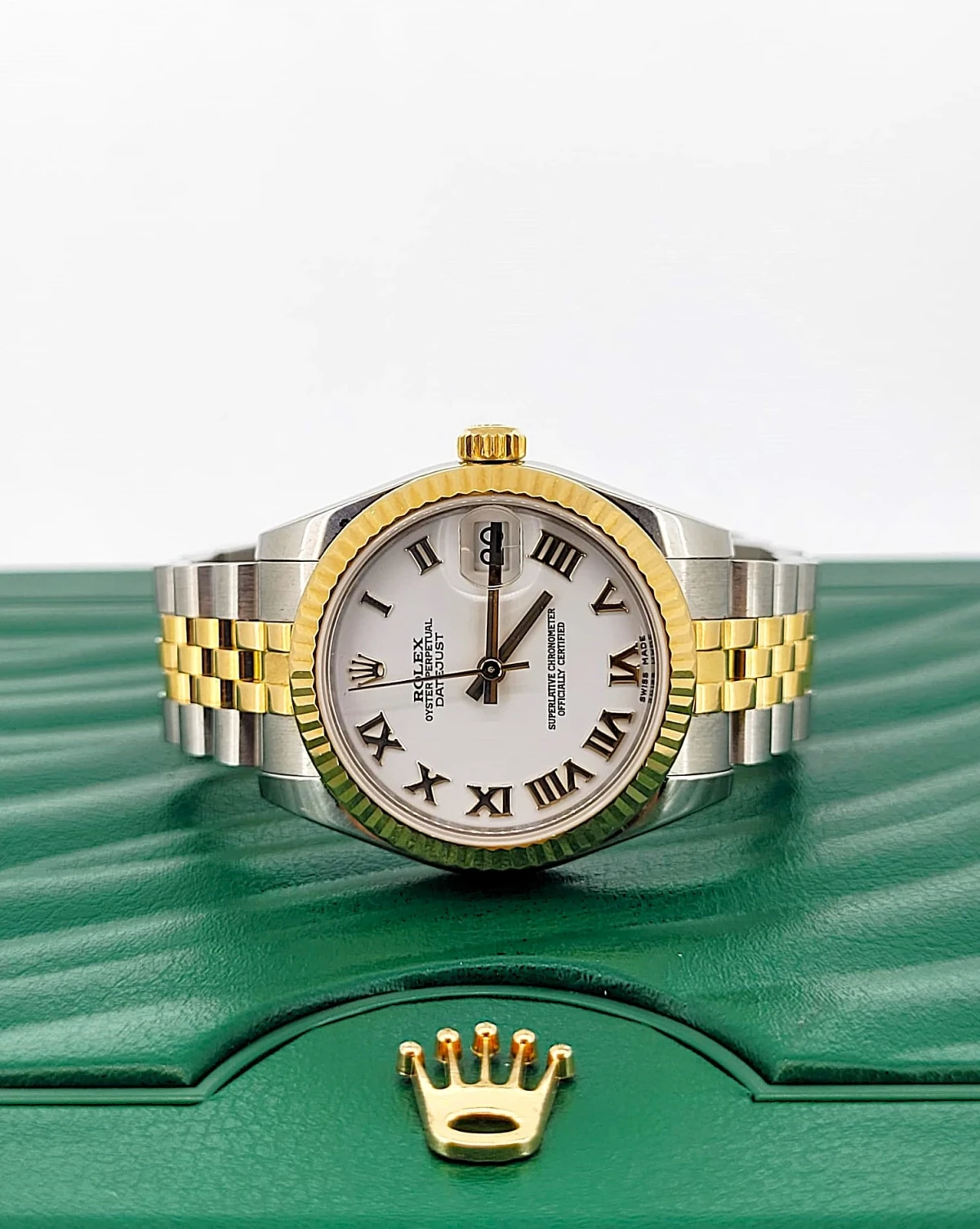 A timeless classic from Rolex, this Datejust 31mm blends refined elegance with everyday versatility. Crafted in a harmonious combination of 18ct yellow gold and stainless steel (Rolesor), this reference 178273 showcases Rolex’s signature balance of luxury and durability. The watch features a 31mm Oyster case, fitted with a distinctive fluted 18ct gold bezel and a striking white dial with baton hour markers. Its automatic self-winding movement ensures precision and reliability, while the date display at 3 o’clock, magnified by the iconic Cyclops lens, offers practical functionality. Completing the design is the sophisticated two-tone Jubilee bracelet, providing both comfort and an unmistakably classic aesthetic. This particular piece was first sold in 2014 and comes complete with its original Rolex box and papers, ensuring authenticity and collectability. Key Features: