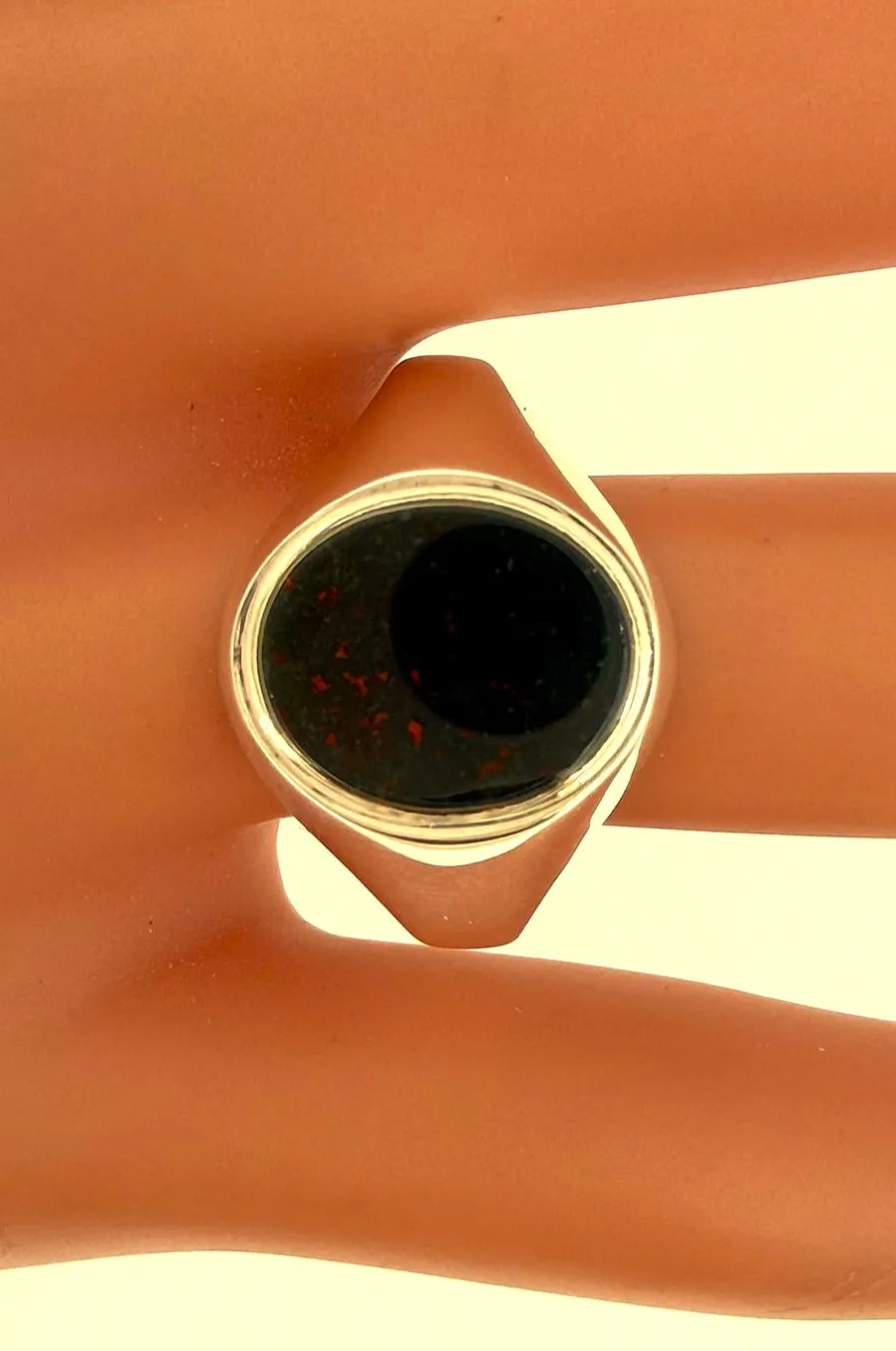 A striking statement piece, this Bloodstone signet ring combines the deep, natural hues of the Bloodstone gemstone with the timeless elegance of sterling silver. Set in a classic signet design, the polished Bloodstone adds character and a bold, masculine touch. Crafted from high-quality 925 sterling silver, the ring weighs 6.7 grams, offering a solid and comfortable fit. The Bloodstone features unique natural patterns, ensuring every ring is subtly individual. Perfect for everyday wear or as a meaningful gift, this signet ring is ideal for birthdays, anniversaries, or collectors of heritage-inspired jewellery.