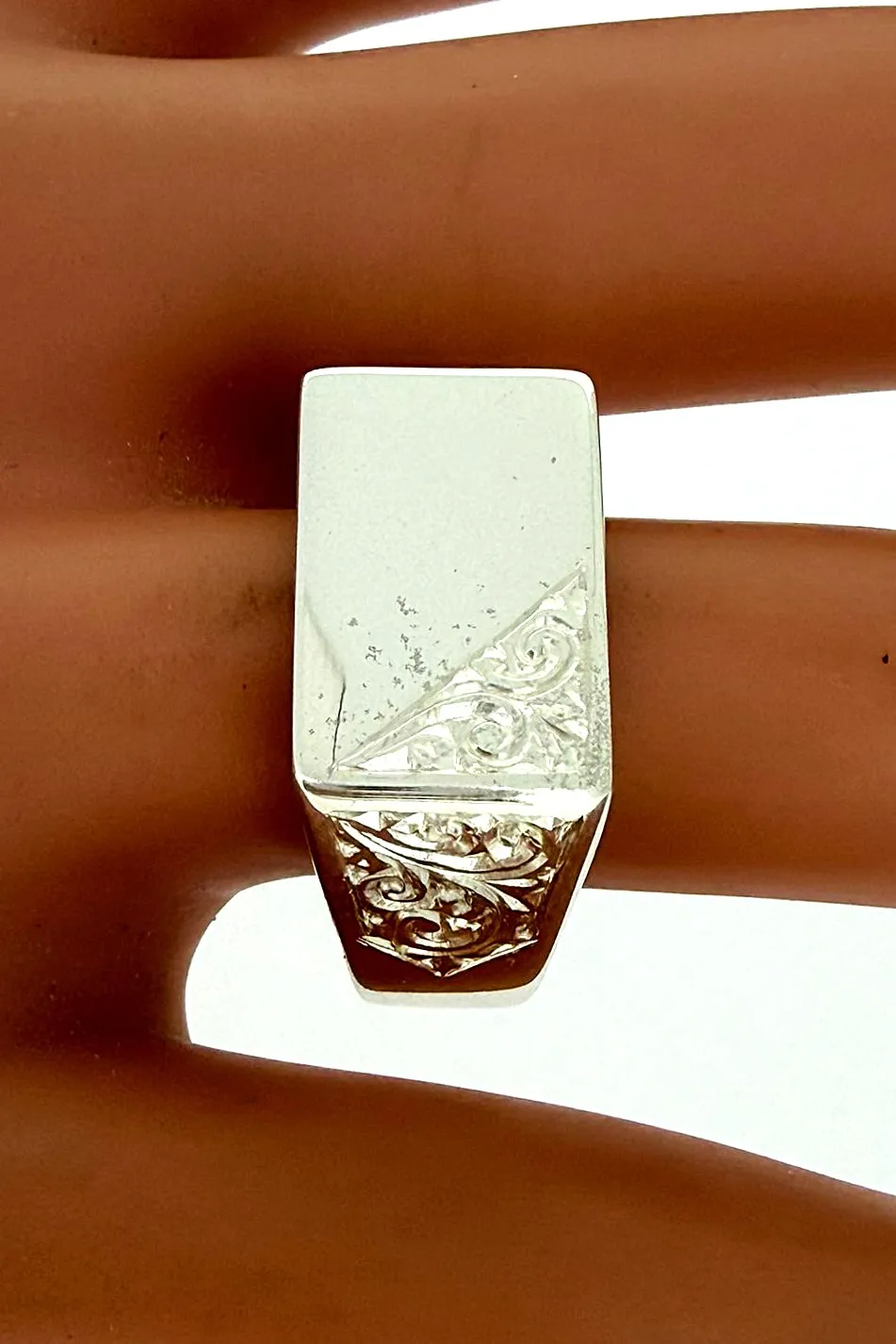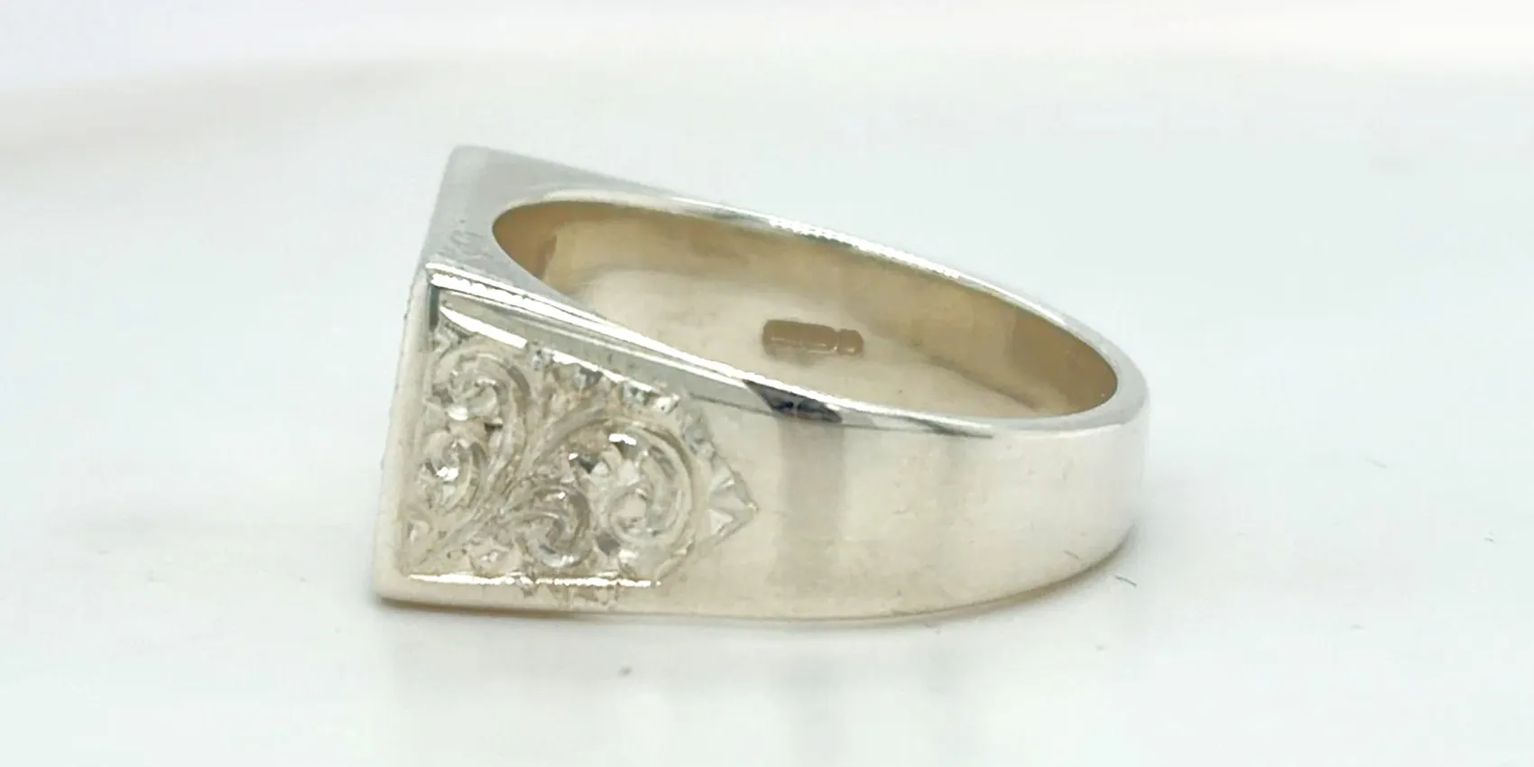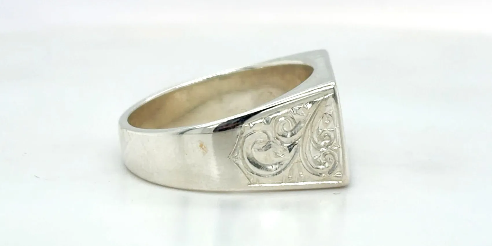 Classic craftsmanship meets timeless style in this sterling silver rectangular signet ring, beautifully finished with hand engraving for added character and individuality. The clean rectangular face offers a bold yet refined look, making it a versatile piece suited to both traditional and modern tastes. Crafted from high-quality 925 sterling silver, this ring weighs 9.3 grams, giving it a solid, premium feel while remaining comfortable for everyday wear. The hand-engraved detailing enhances its heritage appeal, making each piece subtly unique. Perfect as a statement accessory or a meaningful gift, this signet ring is ideal for personal wear, engraving, or marking special occasions such as birthdays, anniversaries, or milestones